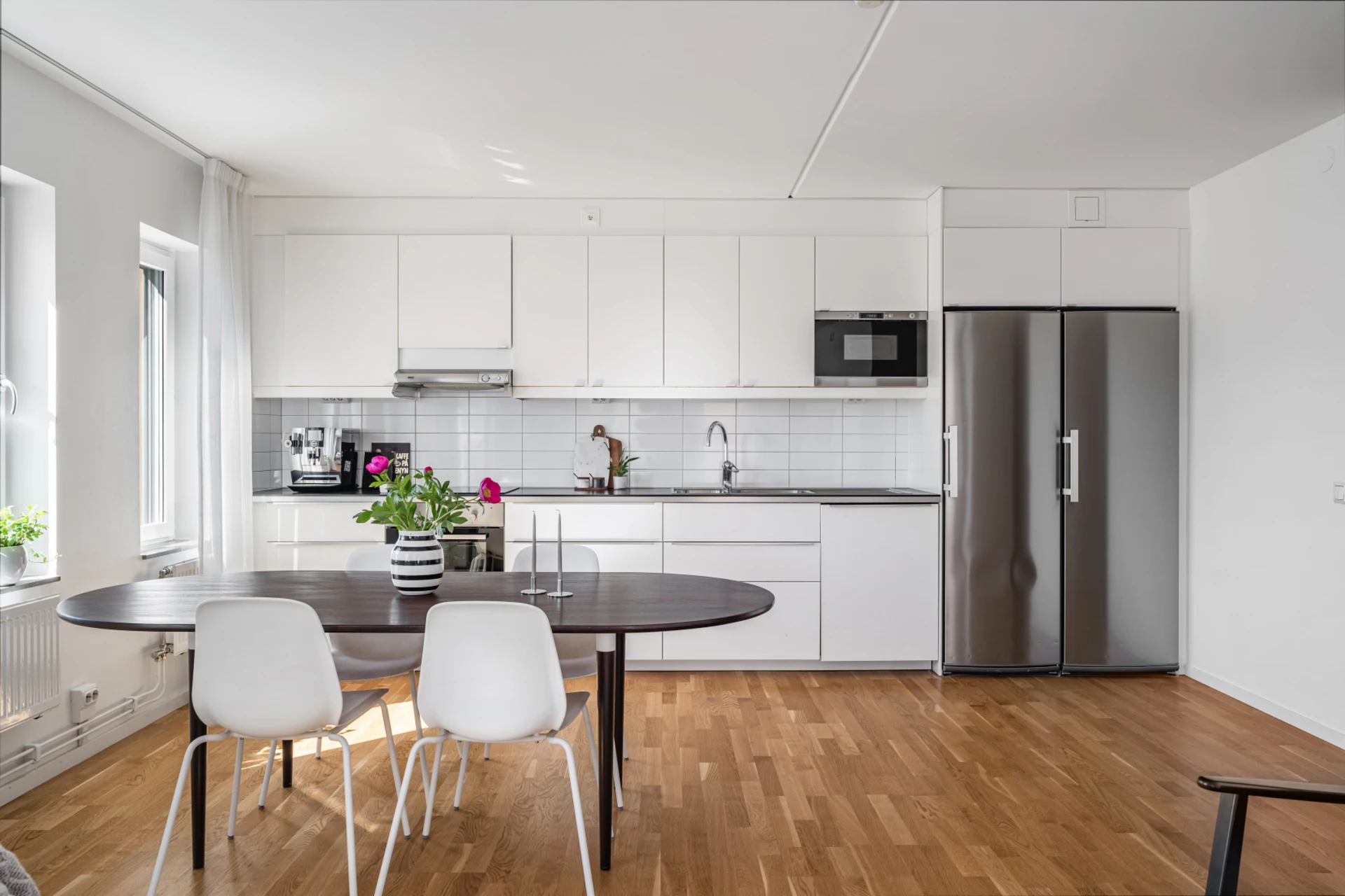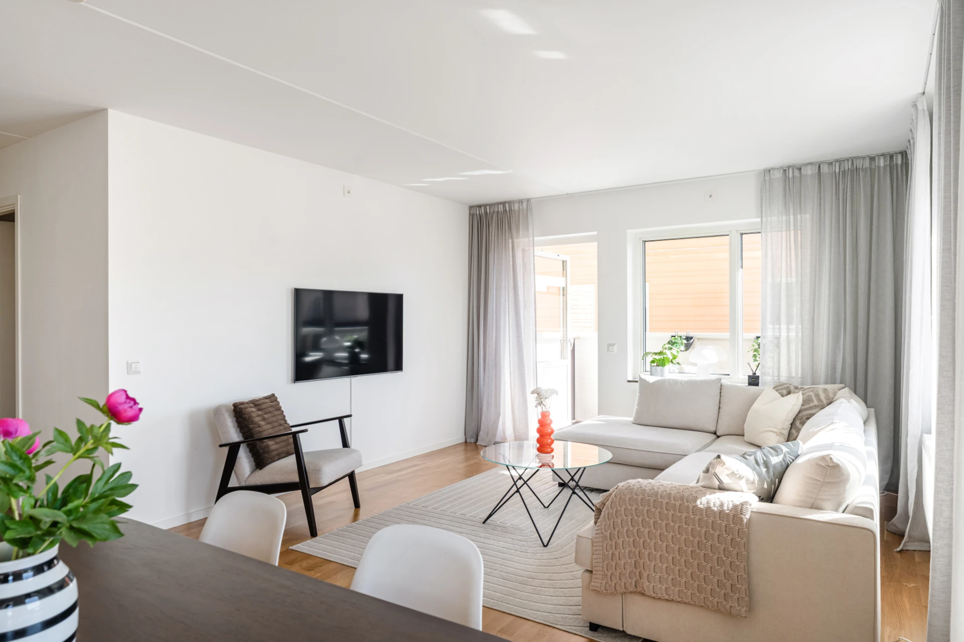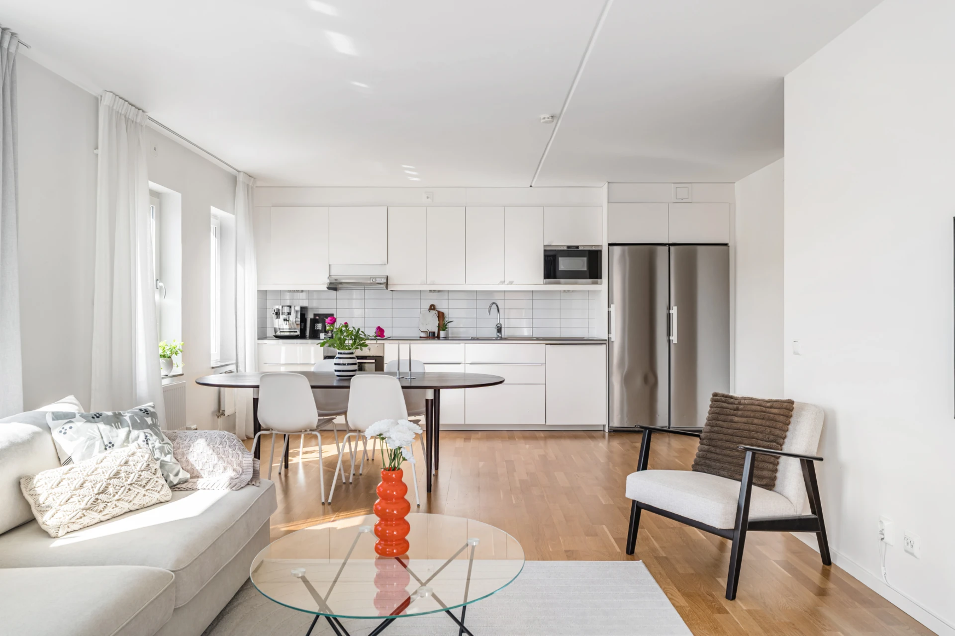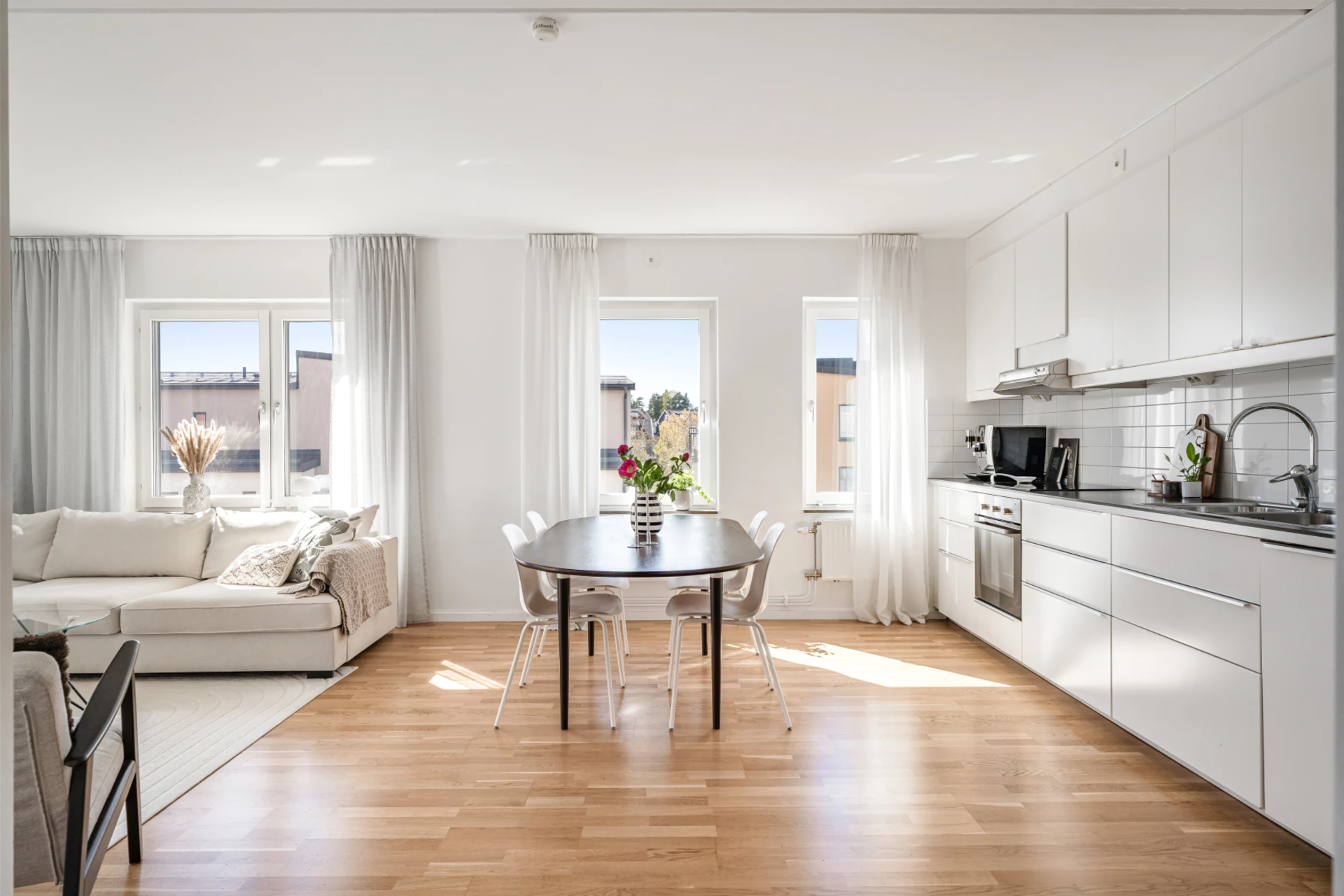 Rymligt vardagsrum med ljust golv och ljusa väggar. Plats för soffa, soffbord samt annan önskad möblering. Härligt ljusinsläpp från två väderstreck och utgång till bostadens balkong.