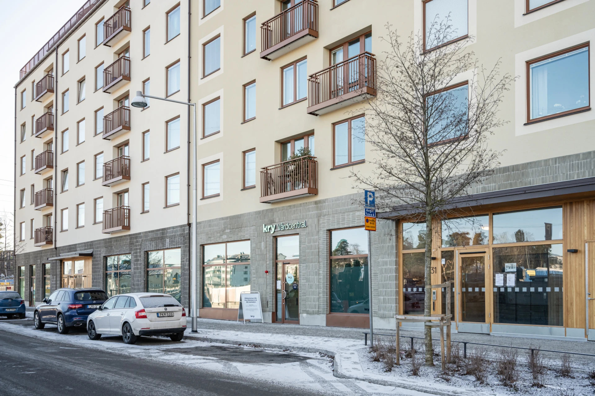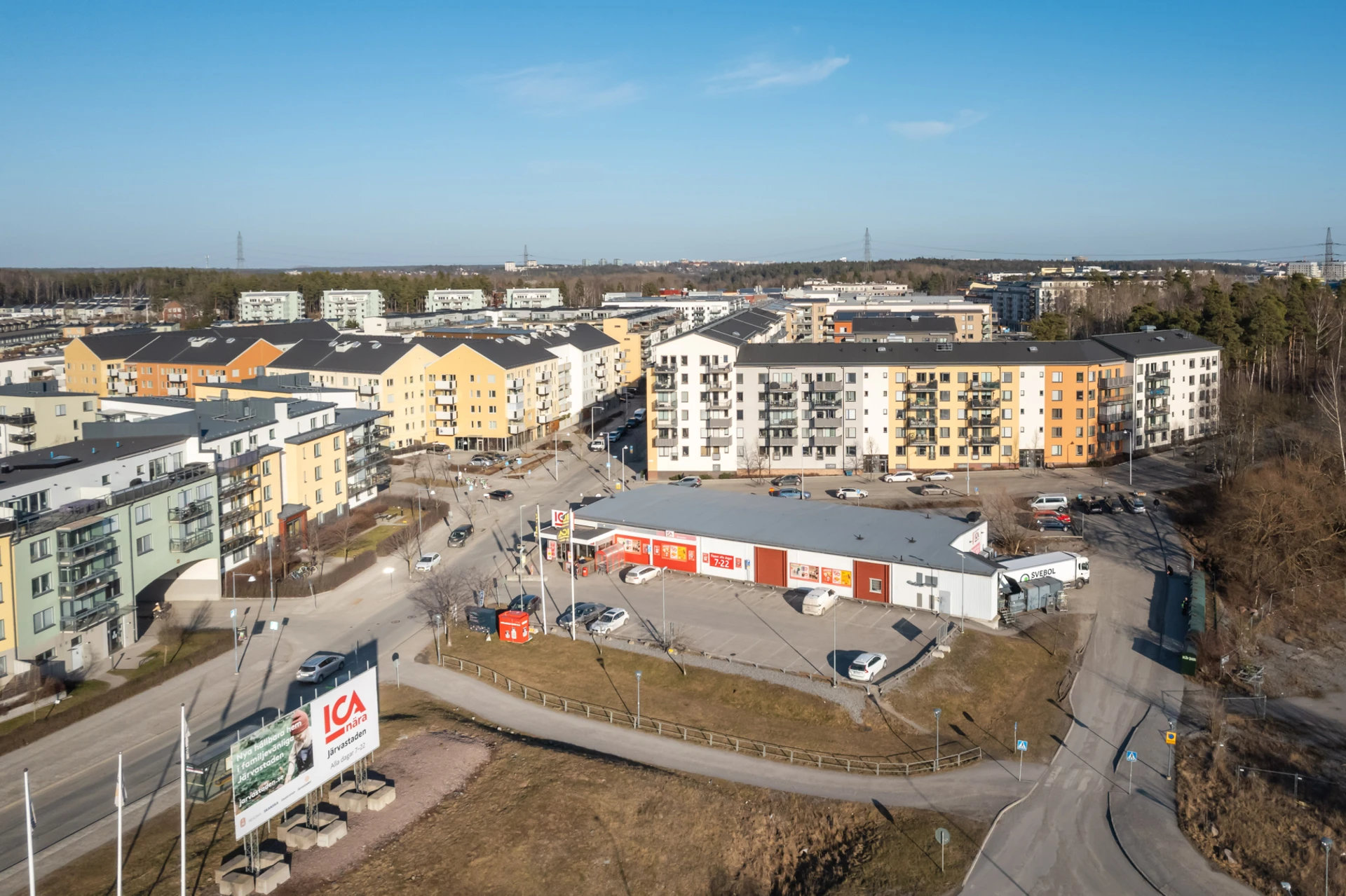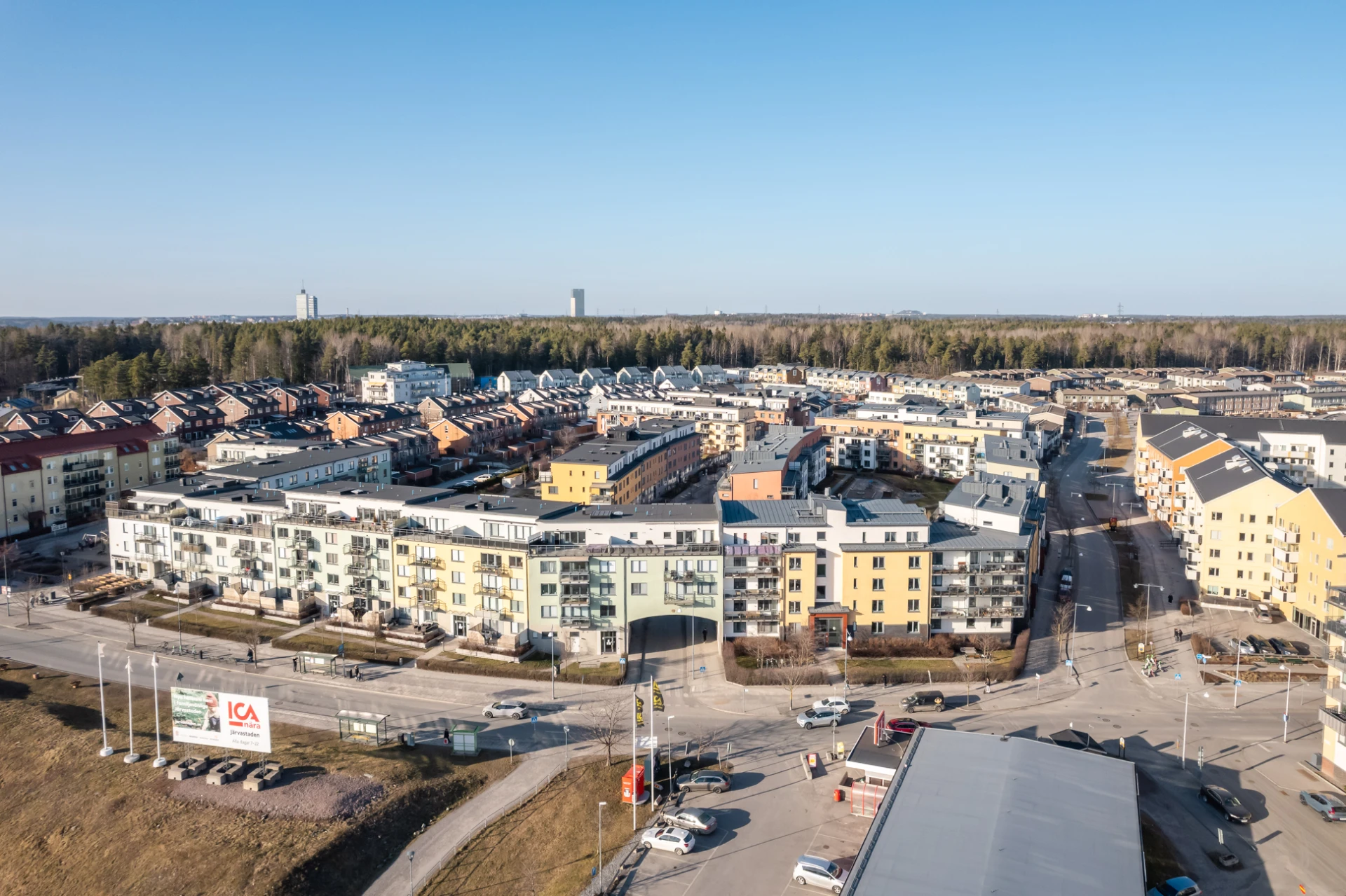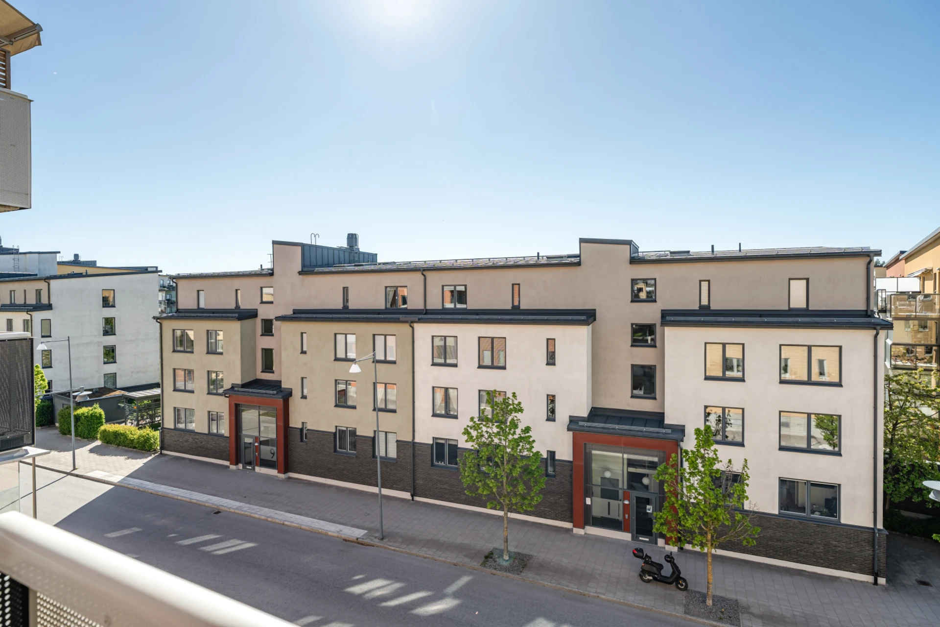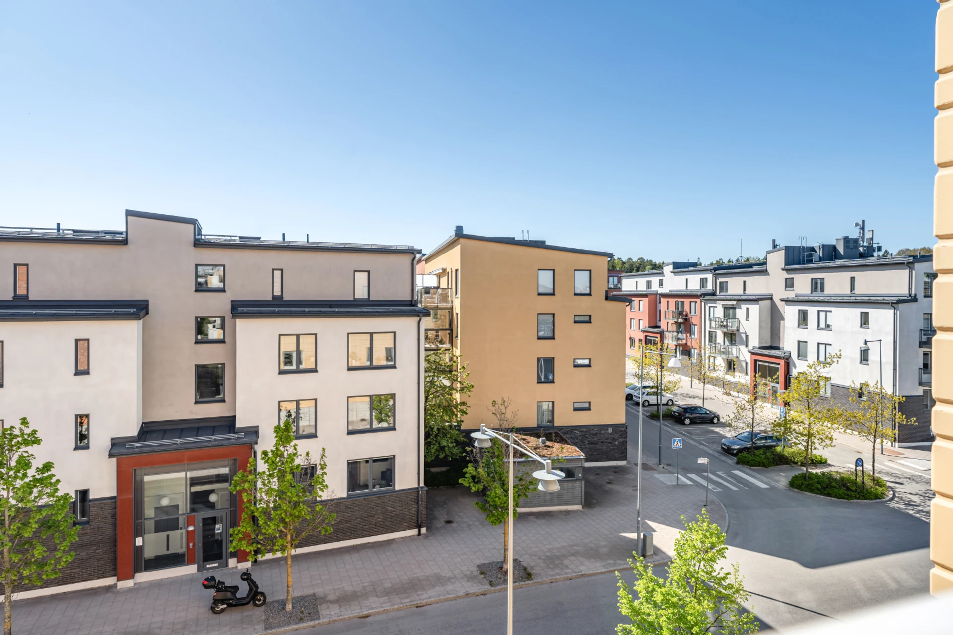 Rymligt vardagsrum med ljust golv och ljusa väggar. Plats för soffa, soffbord samt annan önskad möblering. Härligt ljusinsläpp från två väderstreck och utgång till bostadens balkong.