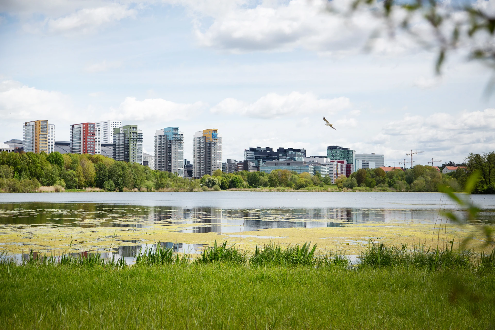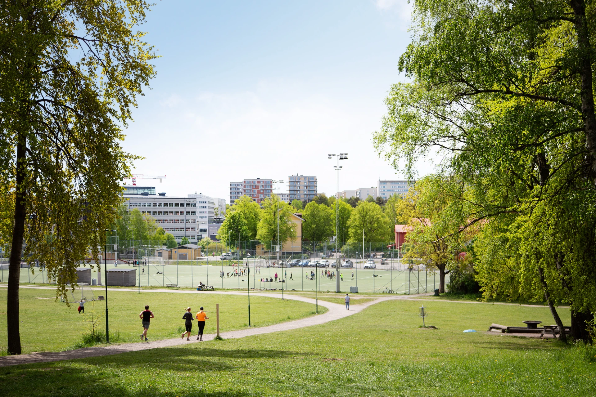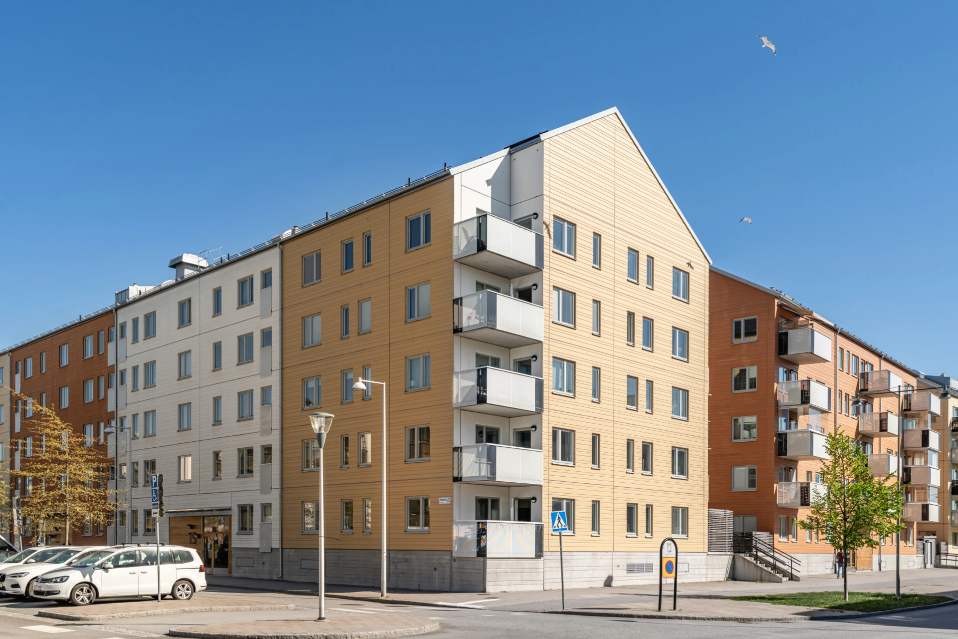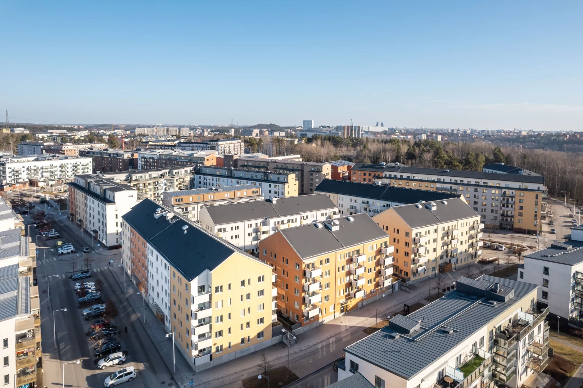 Rymligt vardagsrum med ljust golv och ljusa väggar. Plats för soffa, soffbord samt annan önskad möblering. Härligt ljusinsläpp från två väderstreck och utgång till bostadens balkong.