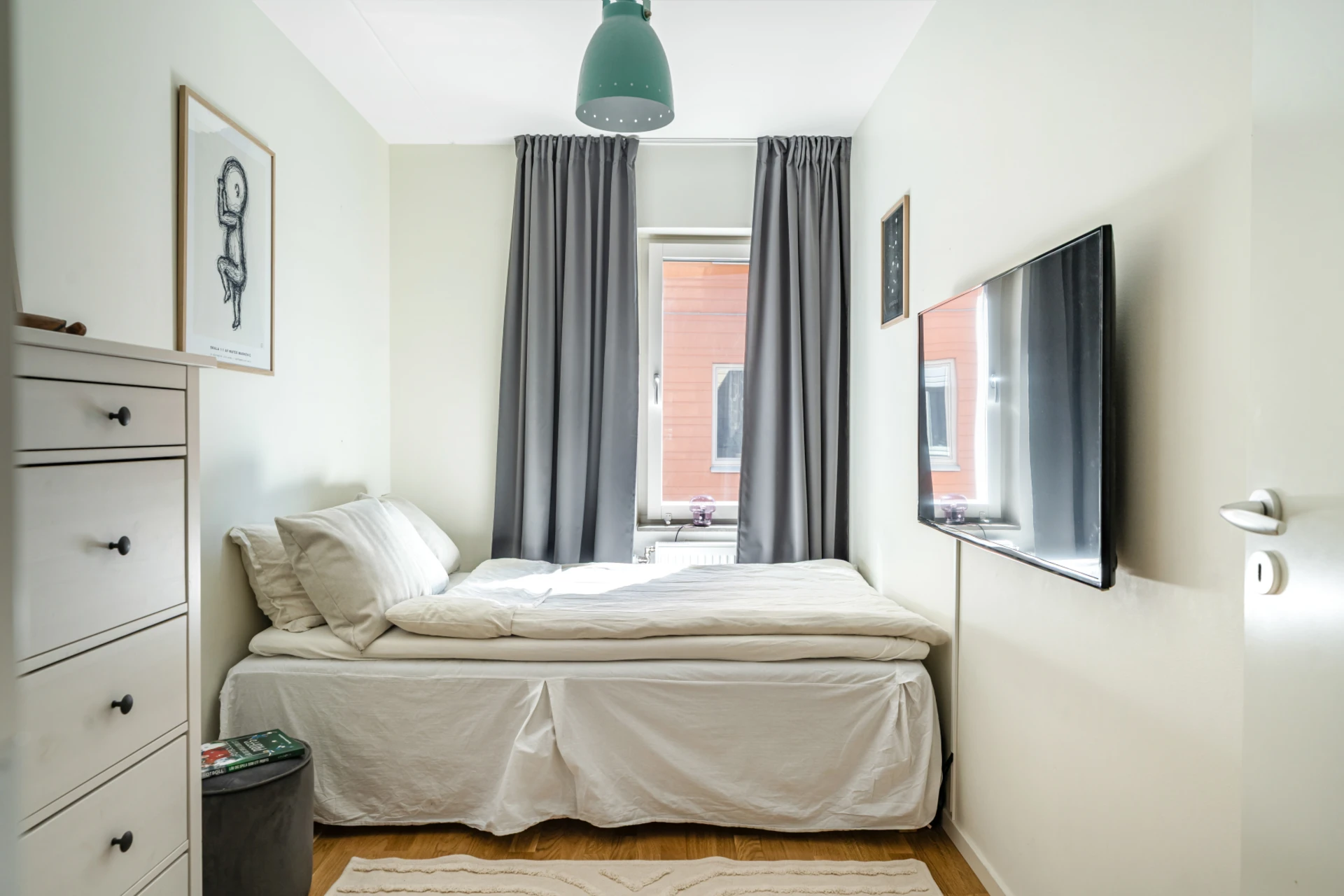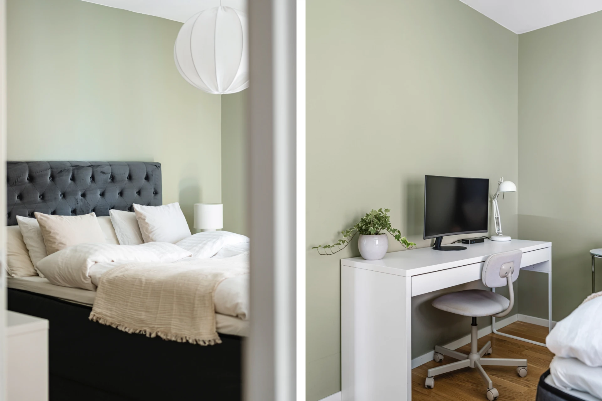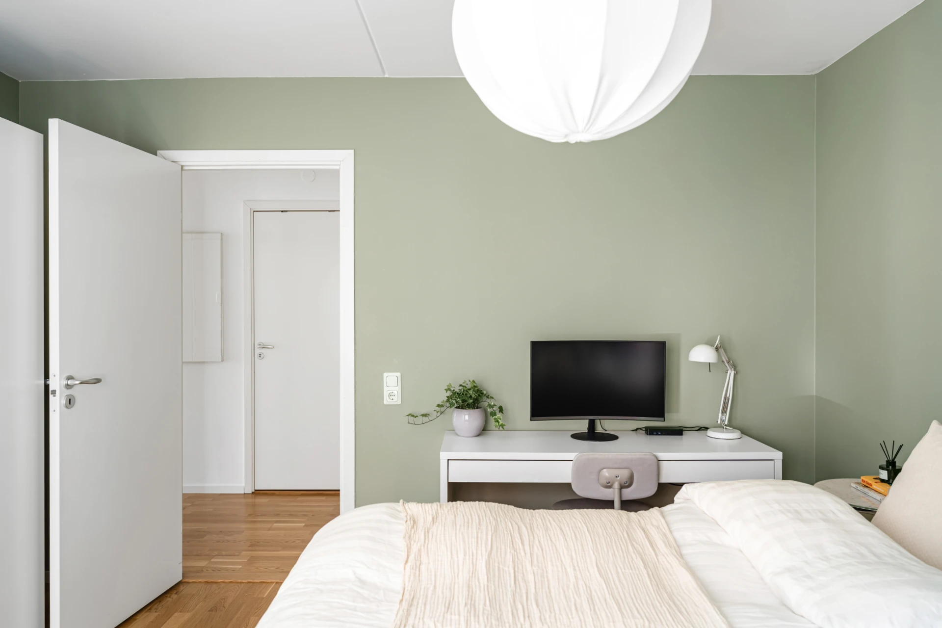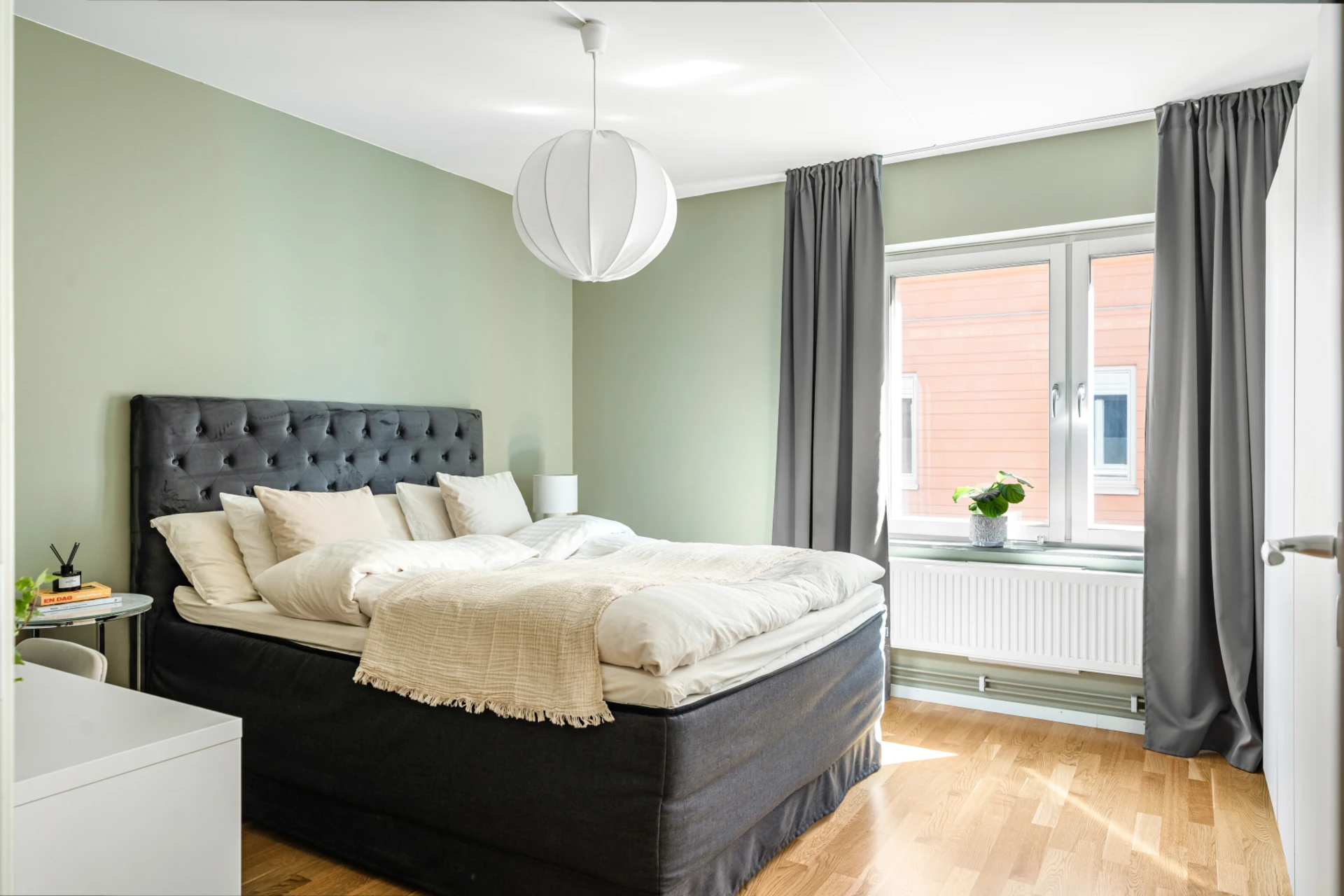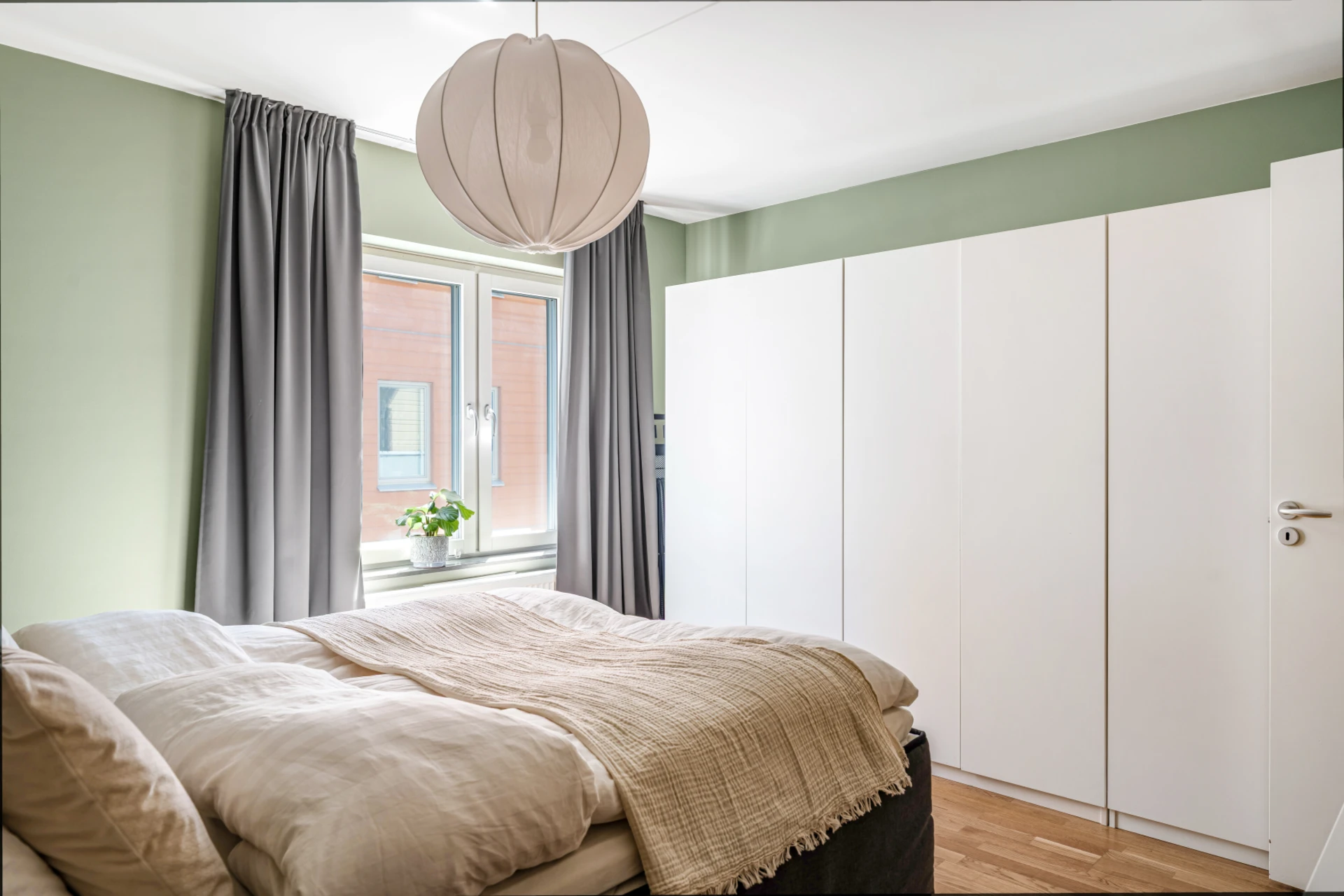Ljust golv och sobert gröna väggarna. Plats för dubbelsäng, sängbord samt annan önskad möblering som skrivbordshörna. Garderober med god förvaring.