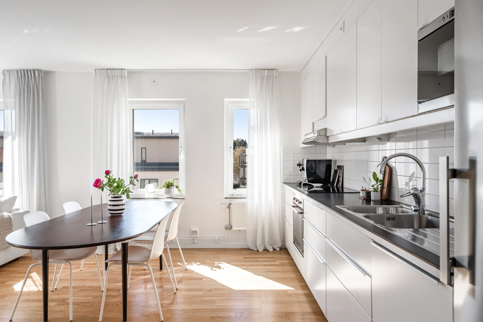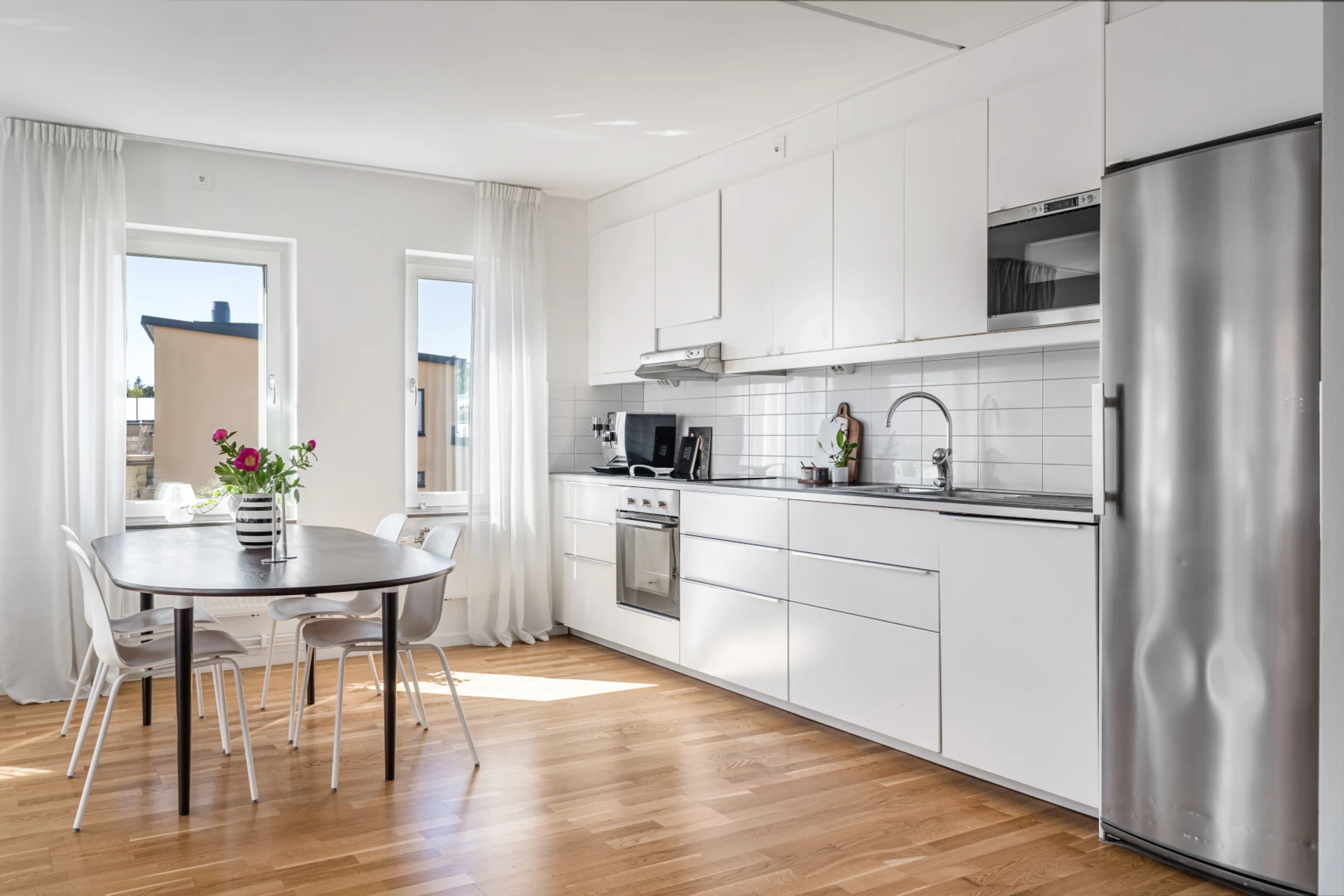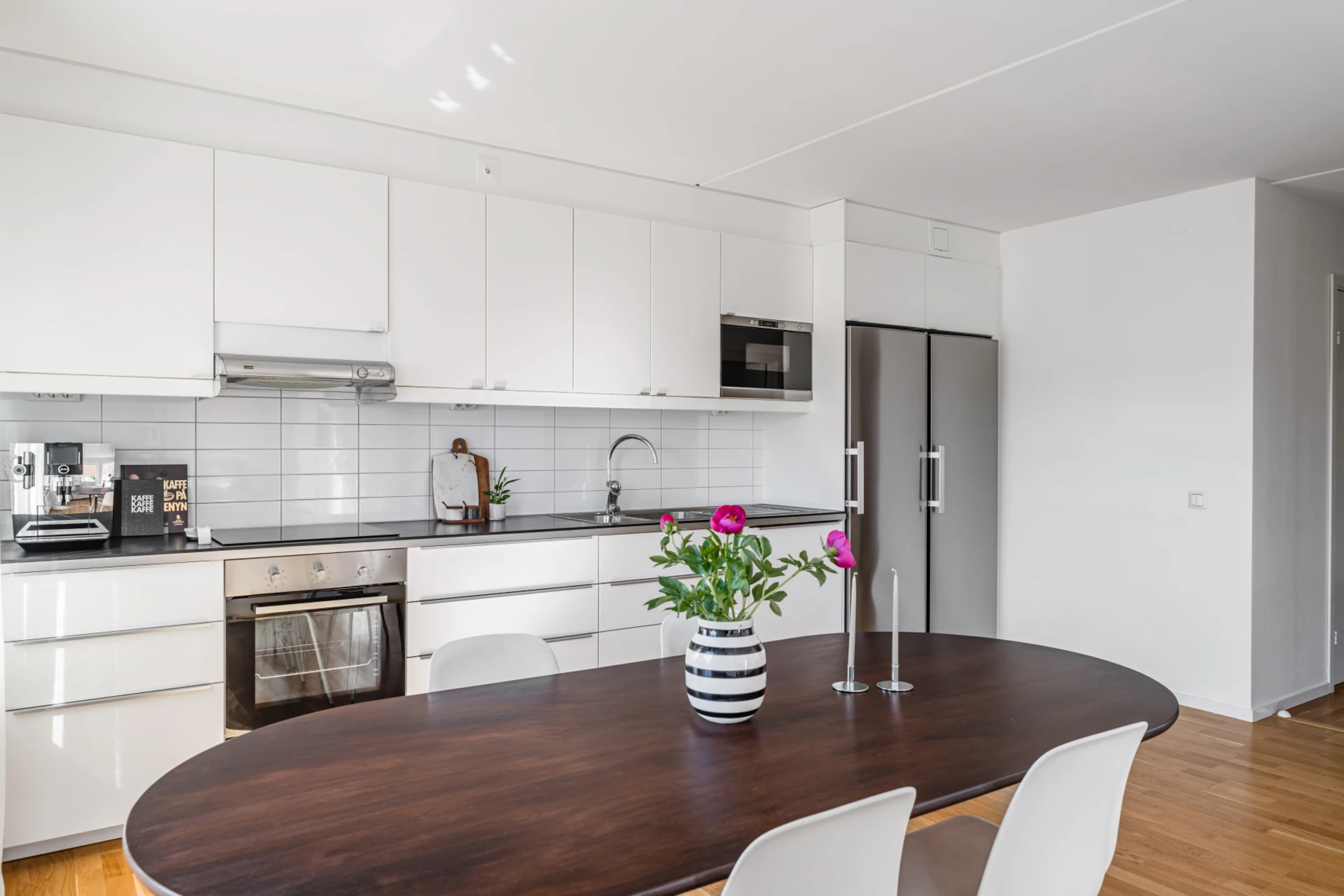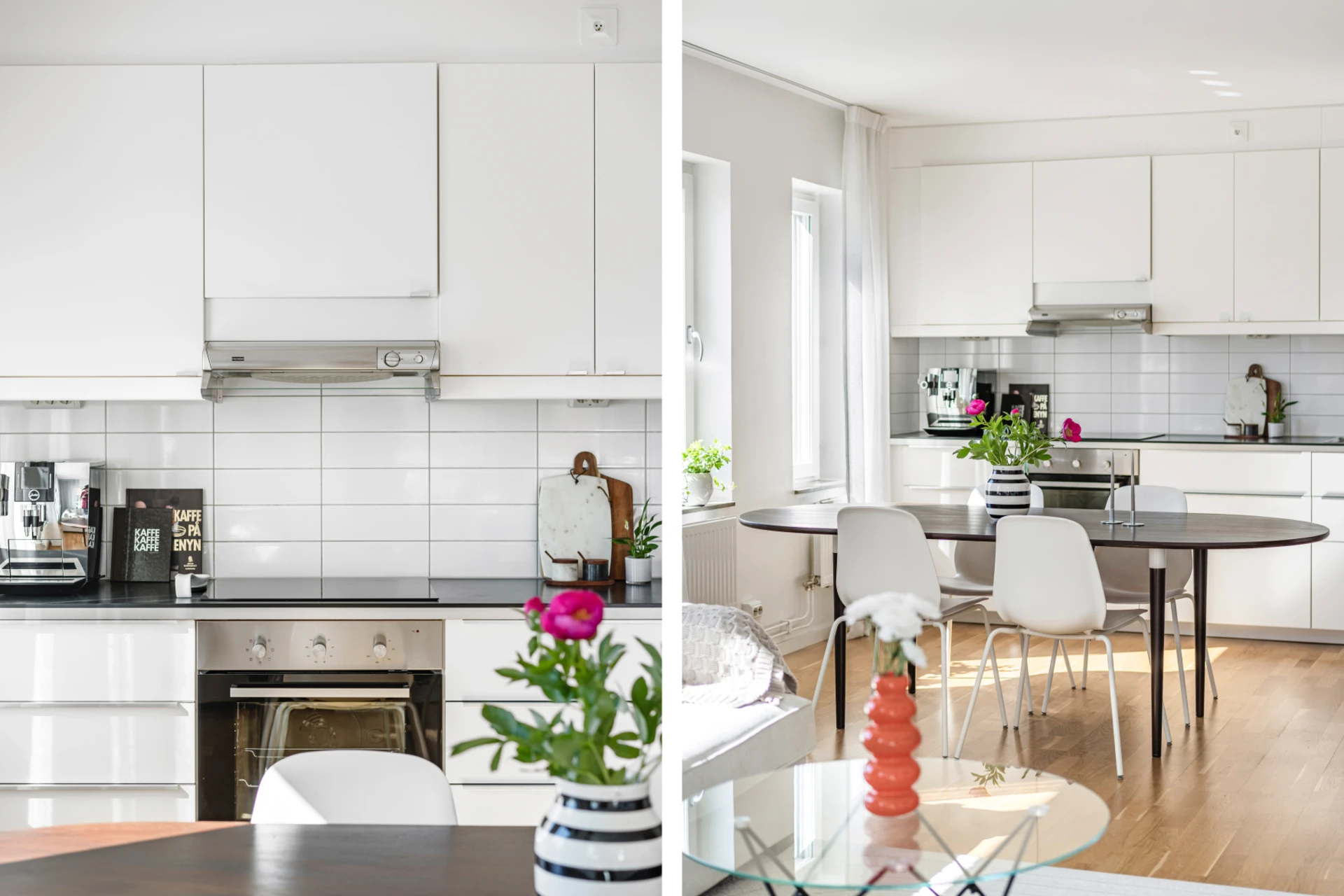Ljust golv och ljusa väggar. Ljust kakel ovan mörk arbetsbänk, ljusa skåpsluckor och lådfronter. Köket är utrustat med diskho, diskmaskin, häll, fläkt, ugn, mikrovågsugn samt kyl och frys. Plats för matgrupp, öppen planlösning mot vardagsrum.