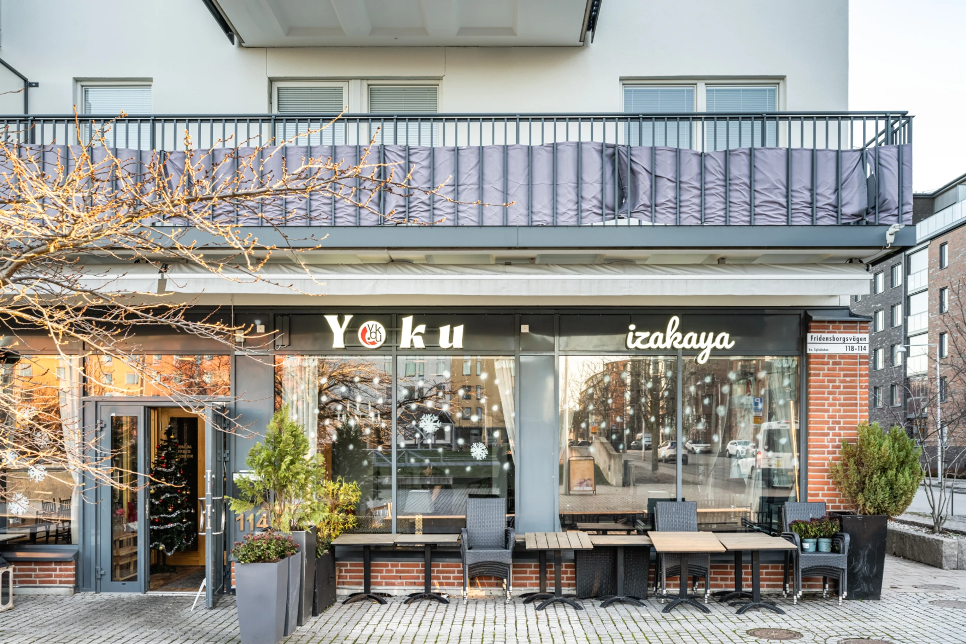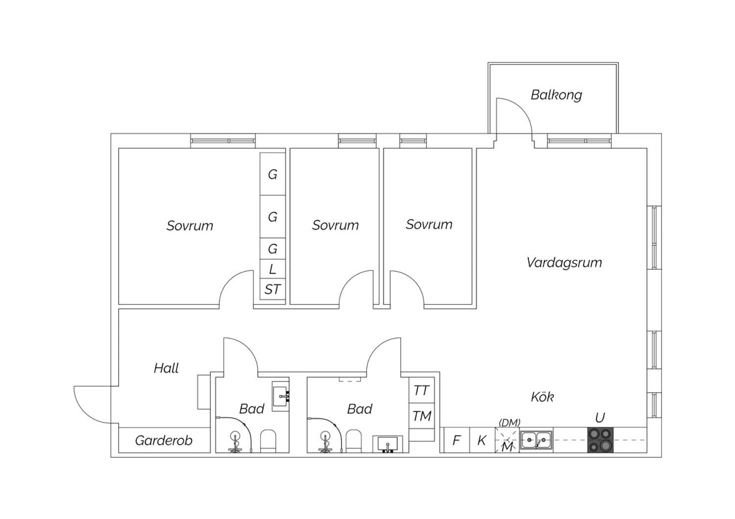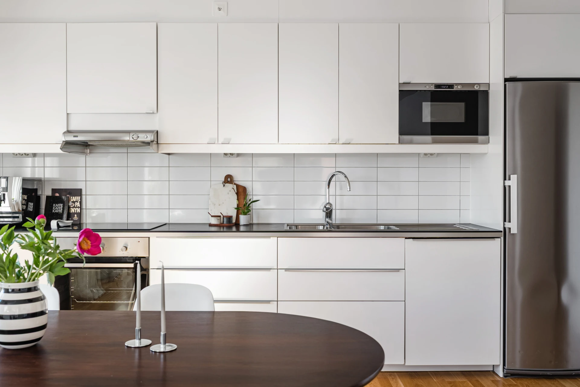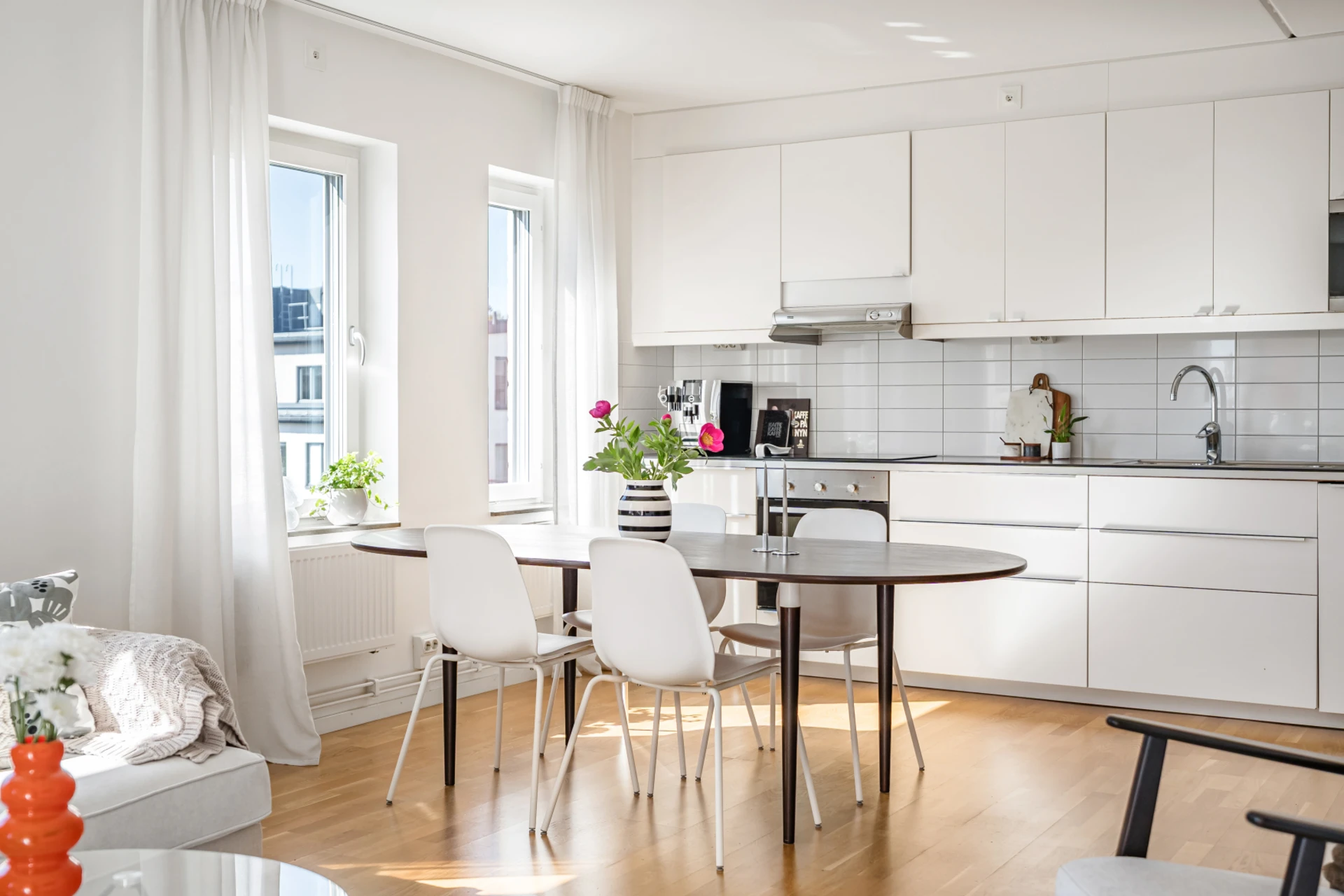Ljust golv och ljusa väggar. Ljust kakel ovan mörk arbetsbänk, ljusa skåpsluckor och lådfronter. Köket är utrustat med diskho, diskmaskin, häll, fläkt, ugn, mikrovågsugn samt kyl och frys. Plats för matgrupp, öppen planlösning mot vardagsrum.