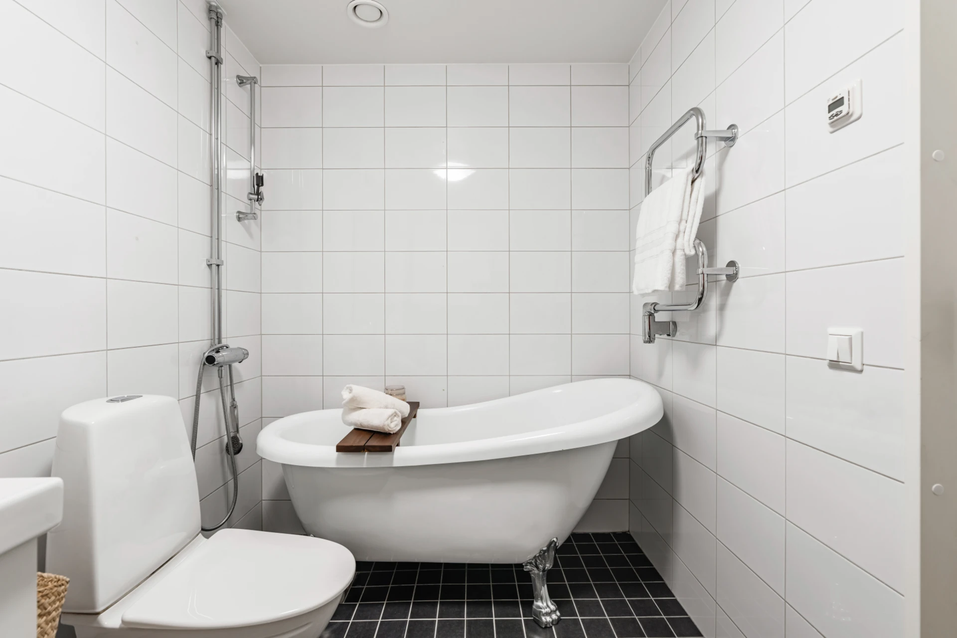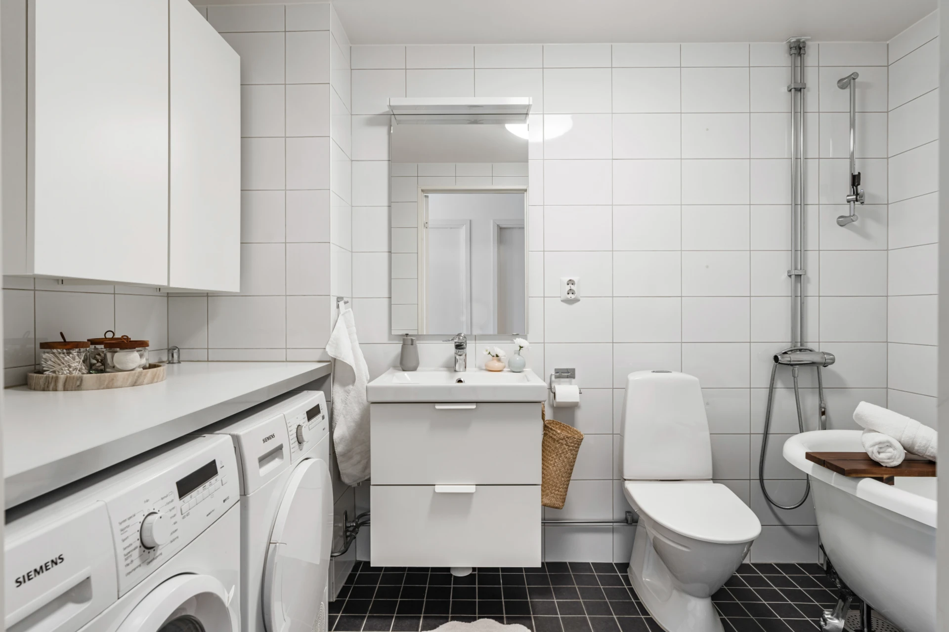 Mörkt klinkergolv och ljust kaklade väggar. Skåp med förvaring ovan arbetsbänk. Badrummet är utrustat med tvättmaskin, torktumlare, badkar, handukstork, handfat med kommod samt spegel ovan och WC.