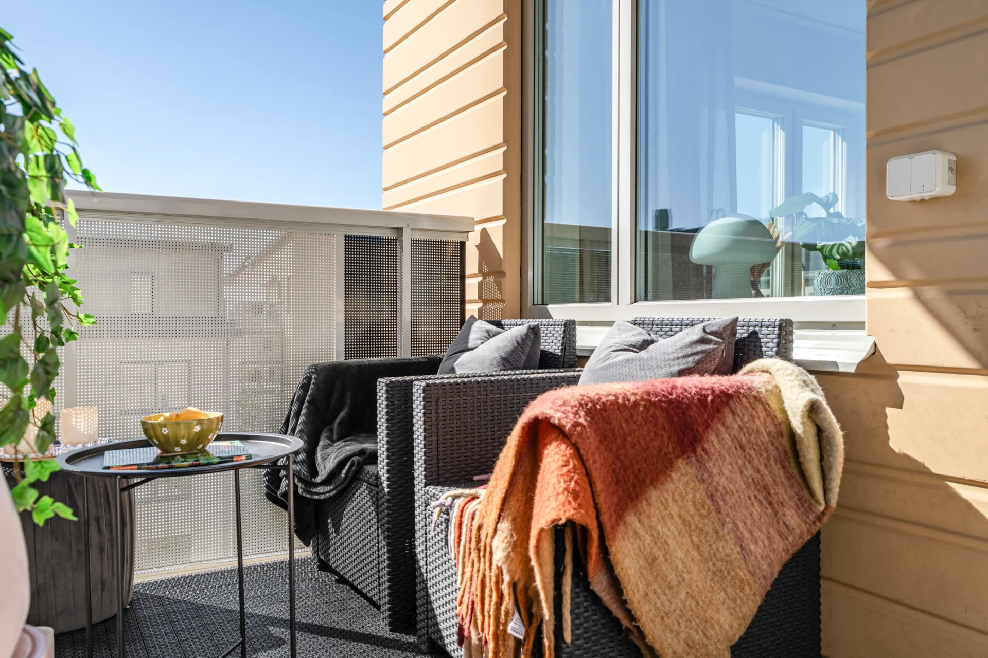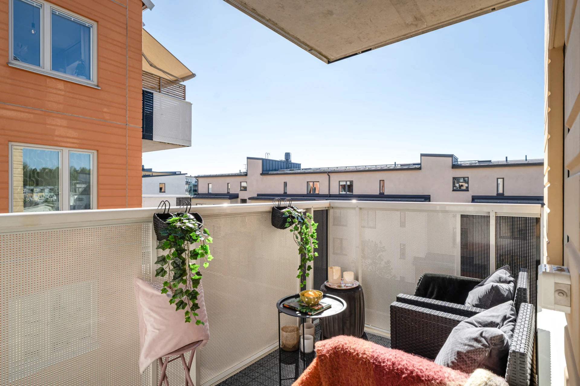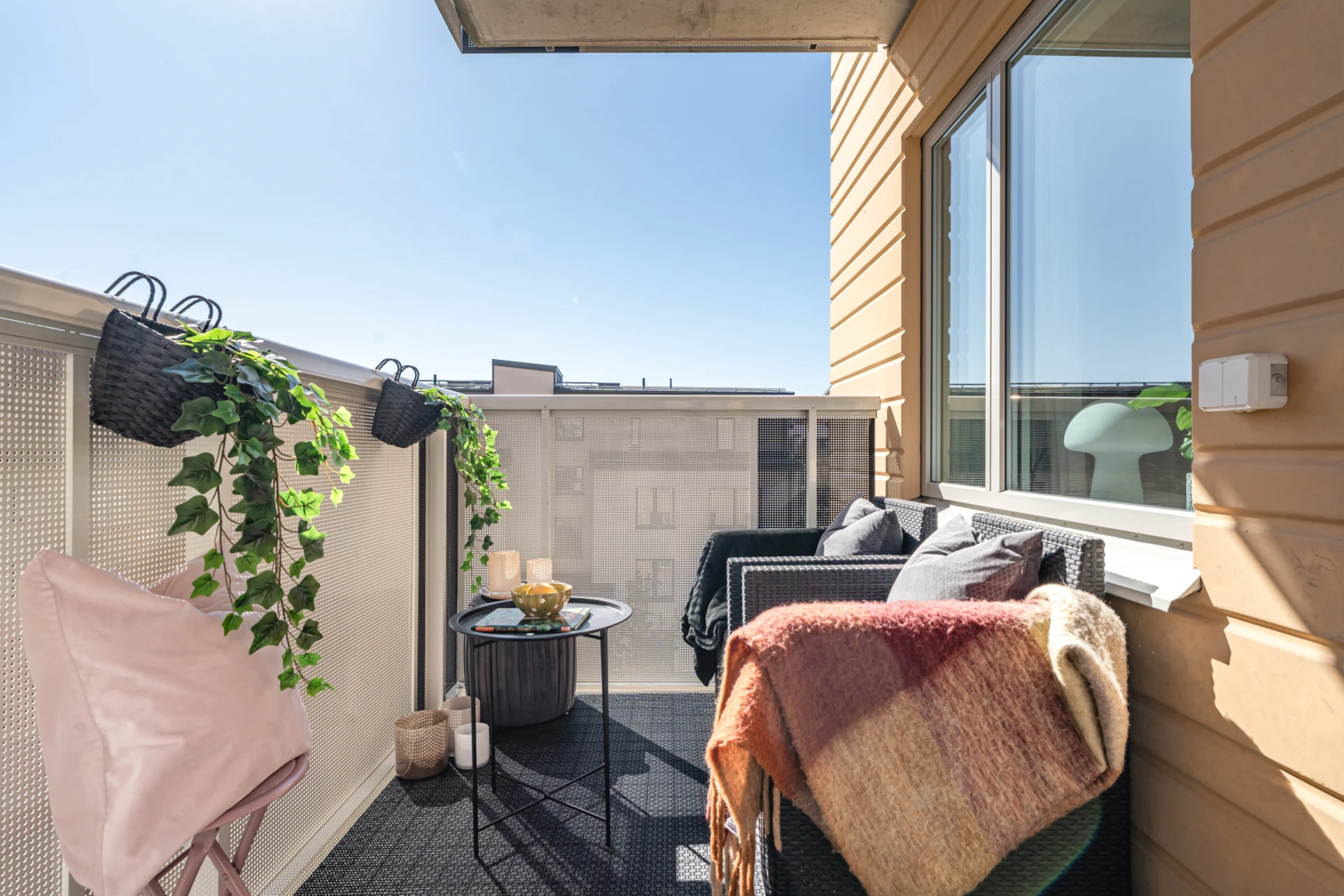 Mysig balkong med plats för önskad utemöblering samt blommor och växter.