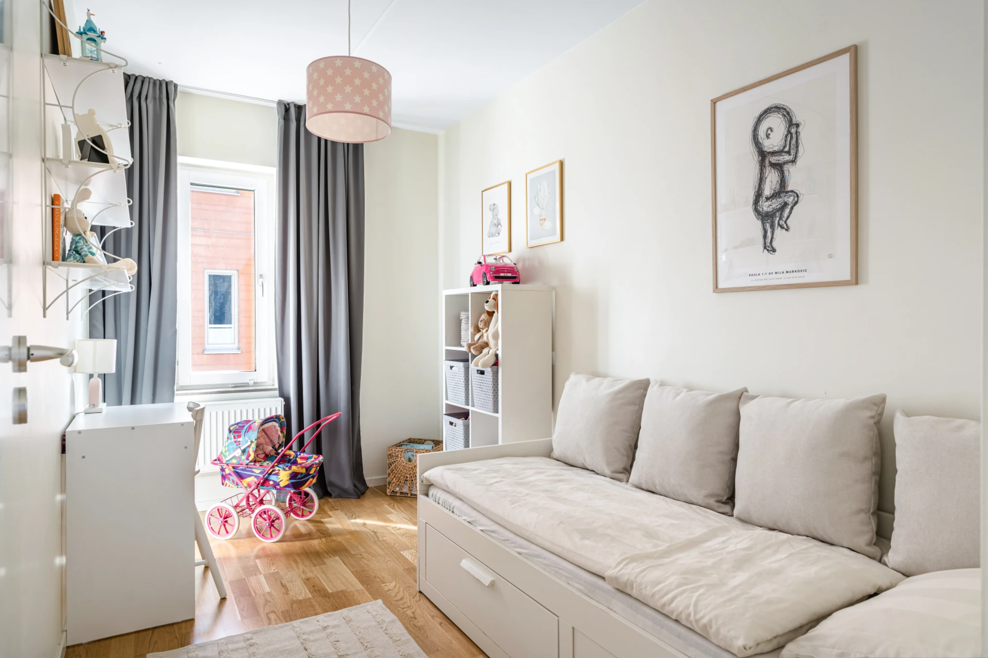 Ljust golv och ljusa väggarna. Plats för säng, sängbord samt annan önskad möblering som skrivbordshörna.