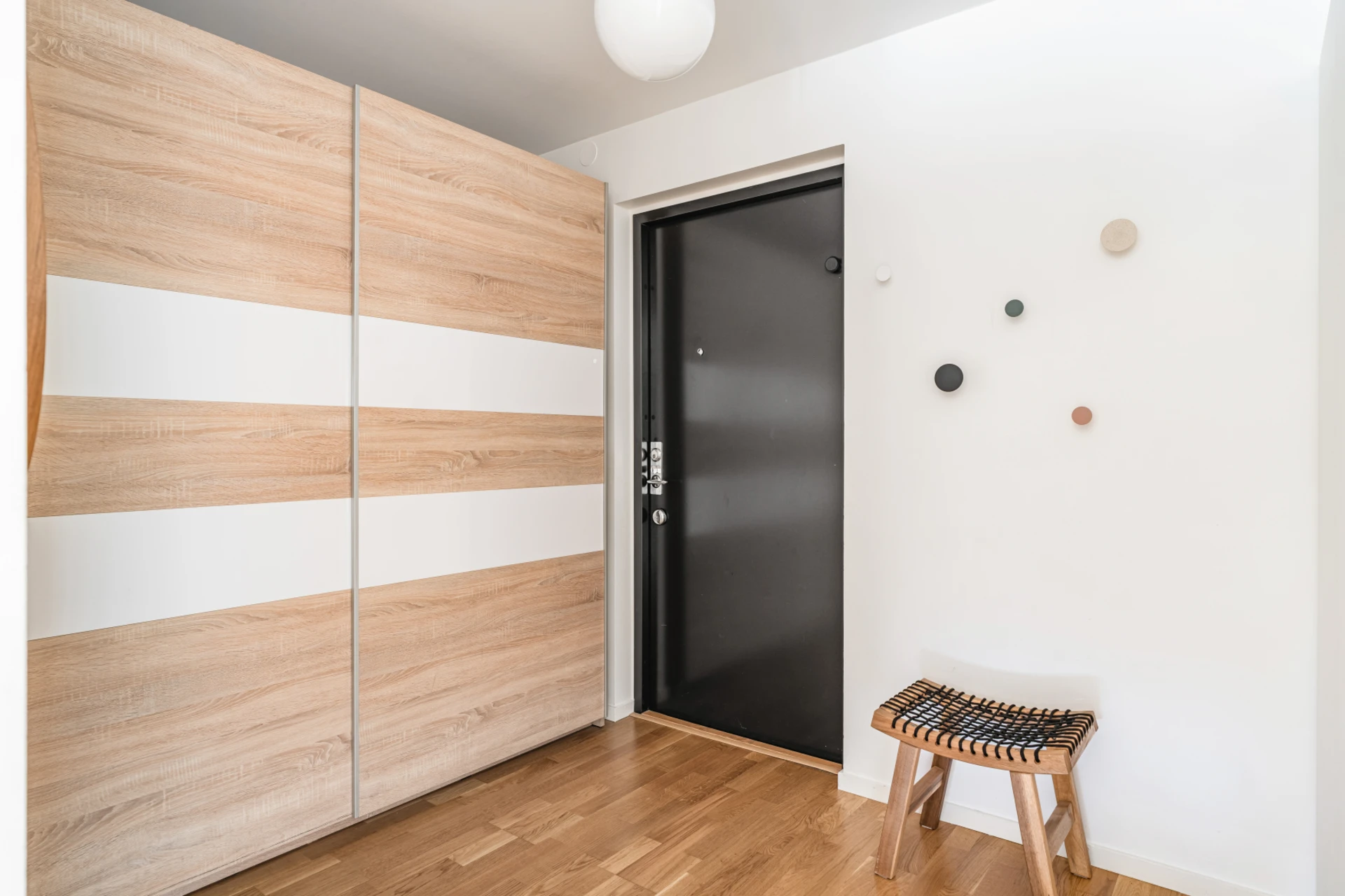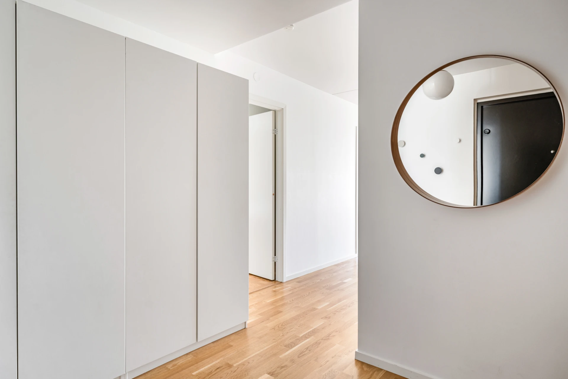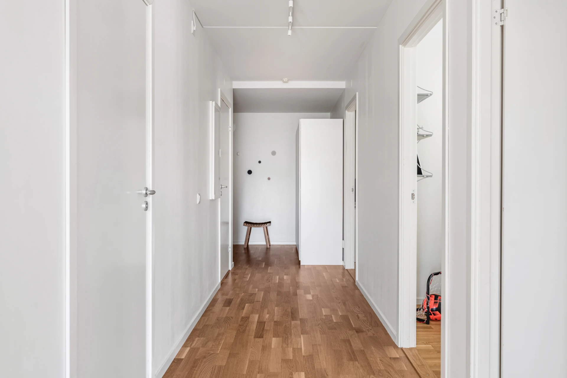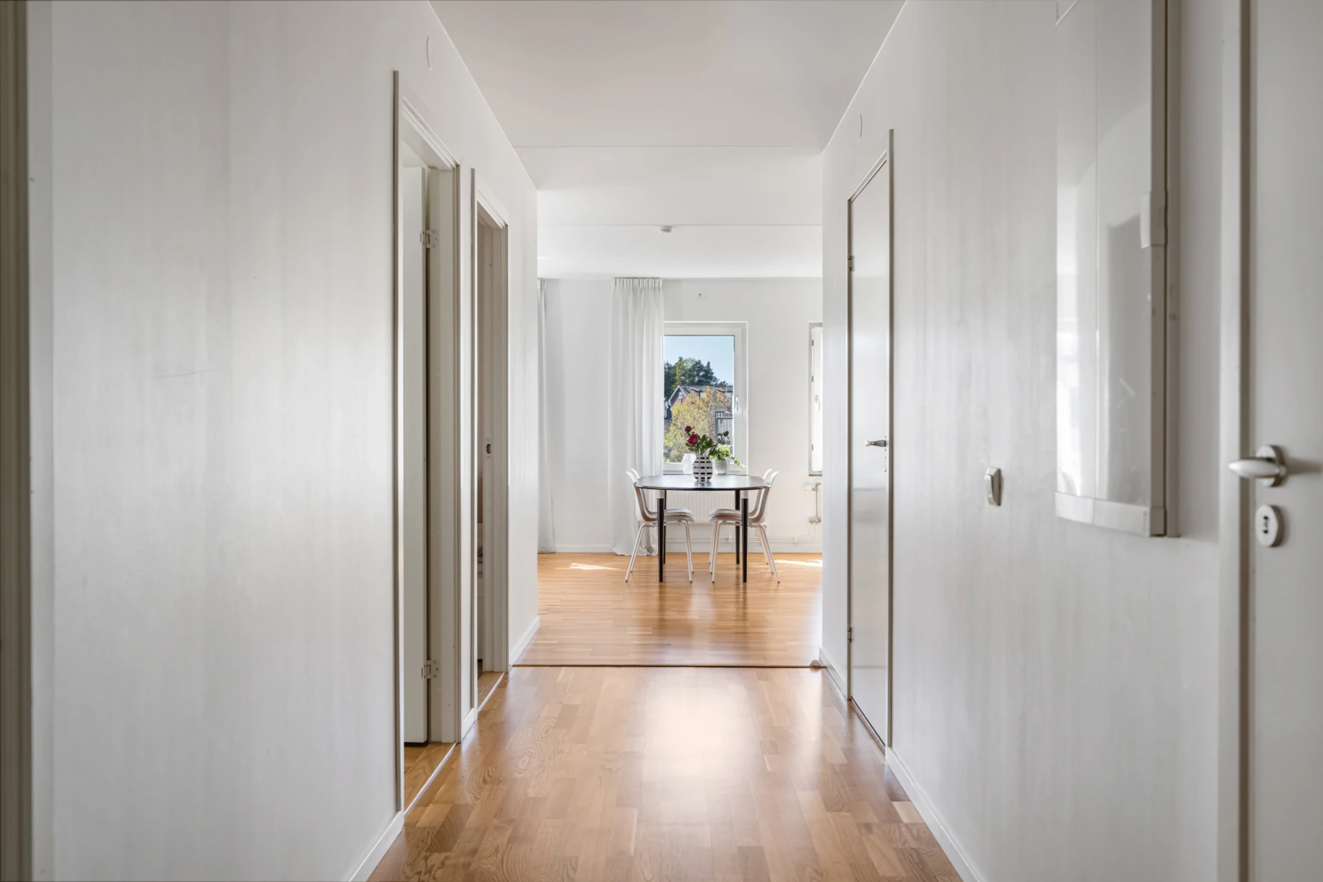 Välkomnande hall med ljust golv och ljusa väggar. Plats för avhägning samt annan önskad möblering. Garderober med god förvaring.