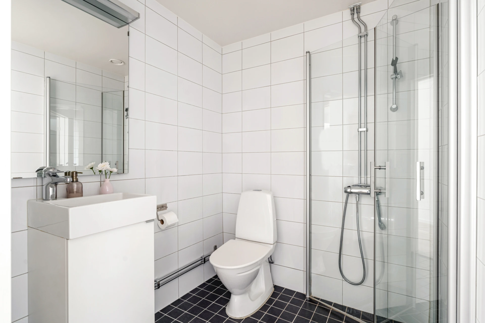 Mörkt klinkergolv och ljust kaklade väggar. Badrummet är utrustat med dusch, glasväggar, handfat med kommod samt spegelskåp ovan och WC.