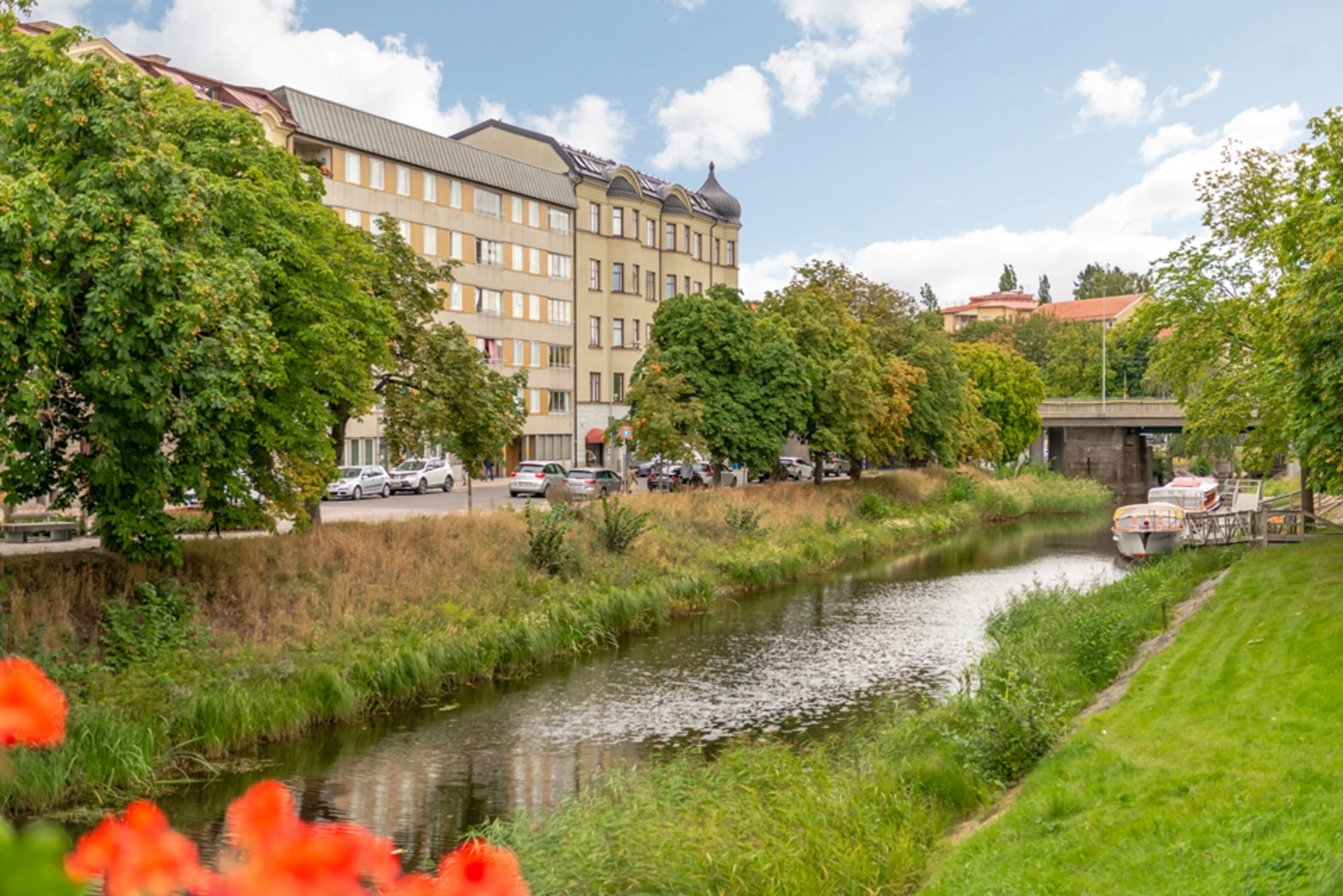 Stadsdelen omringas av Pråmkanalen med slussen och broarna och Klarälven med den gamla stenbron. I de inre delarna finns stora, stadsmässiga byggnader i puts och tegel och småskaliga butikslokaler längs huvudgatorna. Bostadshusen varierar mellan mindre trähus från 1920-talet, gedigna flerbostadshus från 1950-talet och större komplex från 1960- och 70-talet samt kvarterskompletteringar från senare tid.
