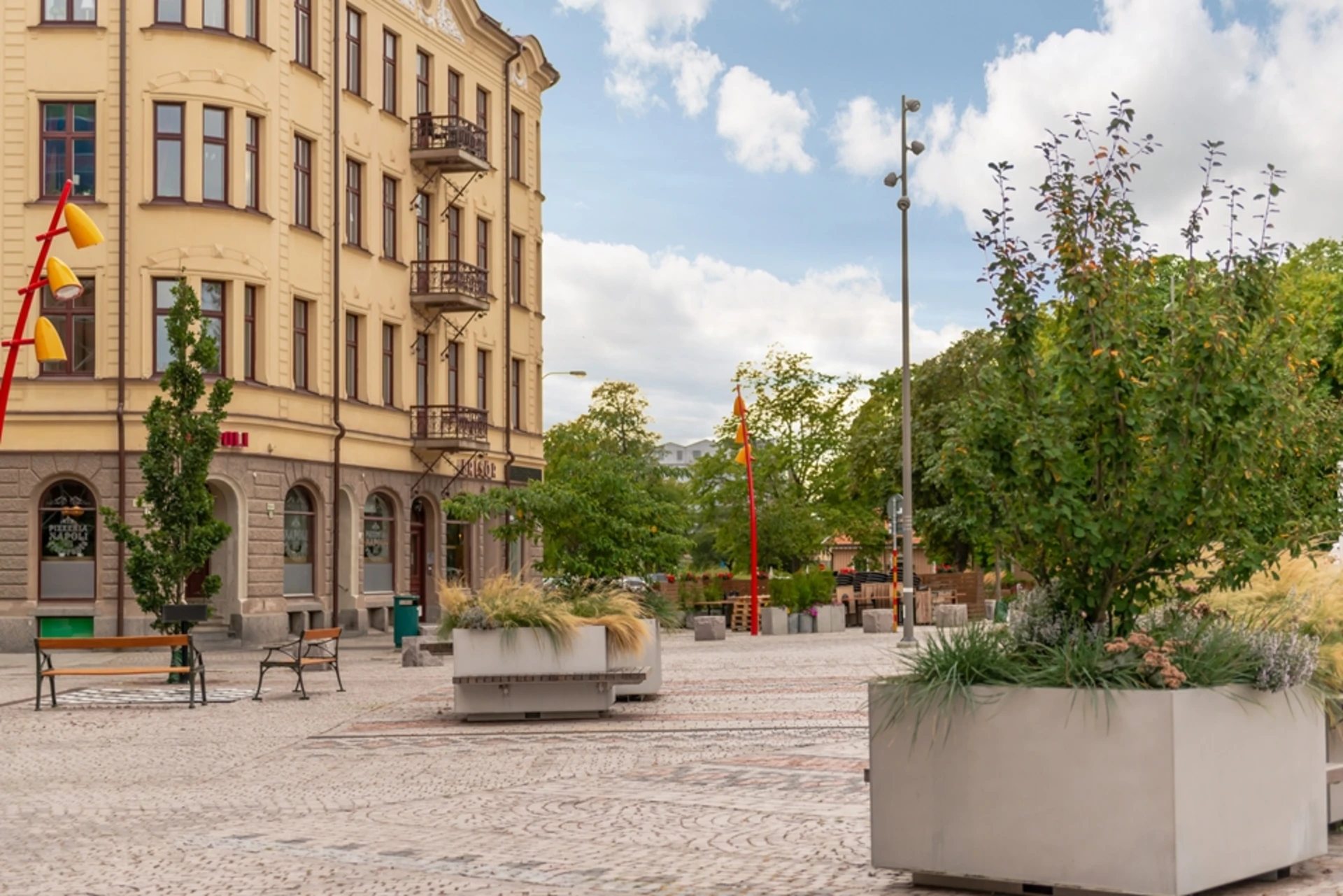 Mataffär, restauranger, småbutiker, vårdcentral.
