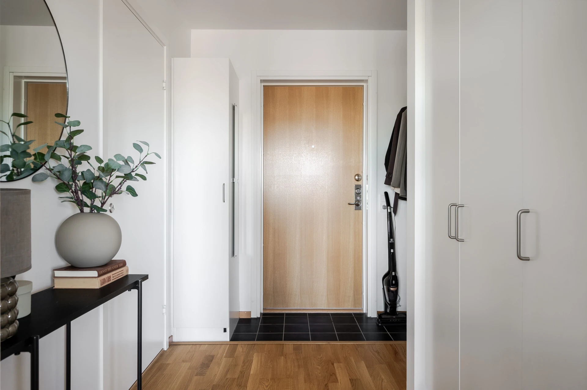 Klinkergolv och målade väggar. Här finns bra klädförvaring i fyra garderober.