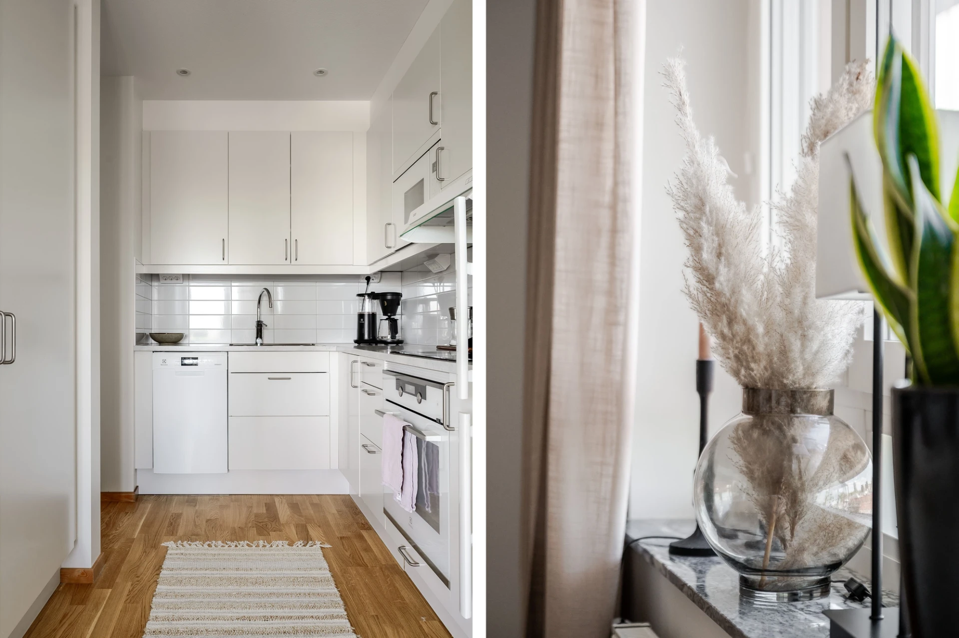 Parkettgolv och målade väggar. Ljusa, släta köksluckor med vitt kakel ovan bänkskivan. Den maskinella utrustningen består av spis med glashäll, ugn, integrerad mikro, diskmaskin samt kyl/frys.