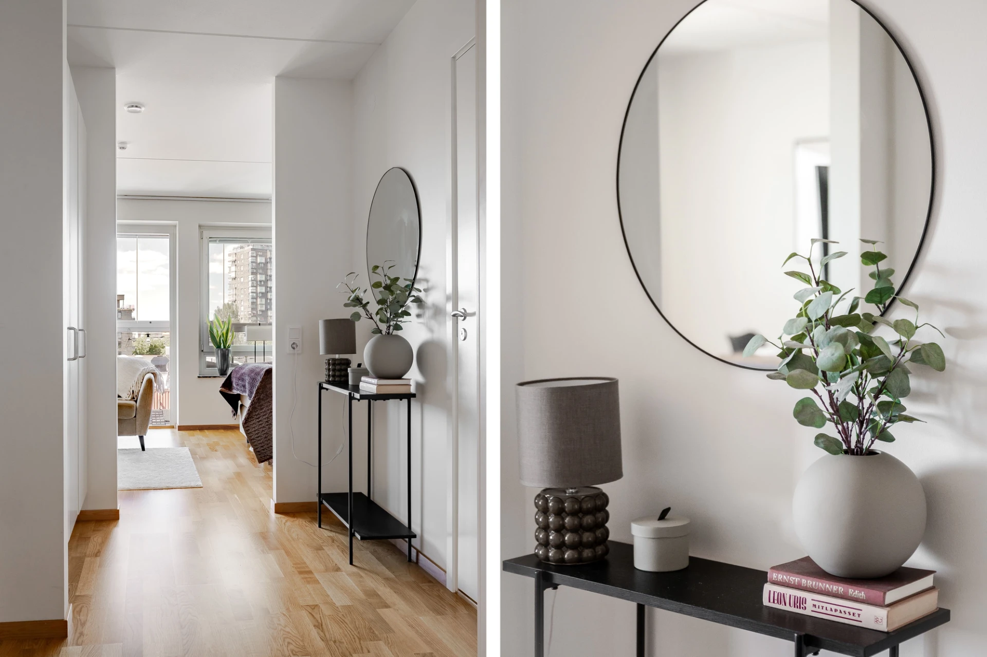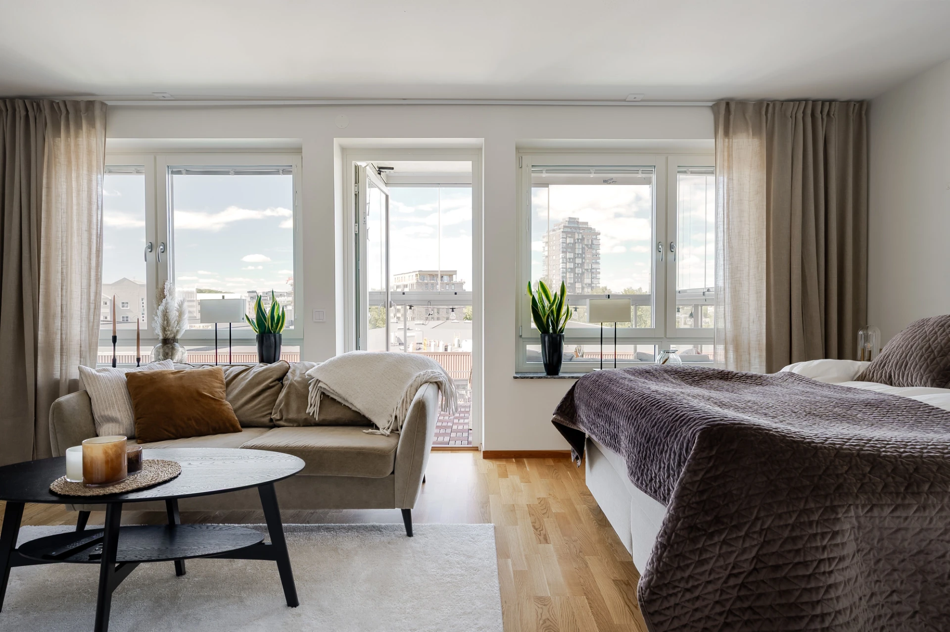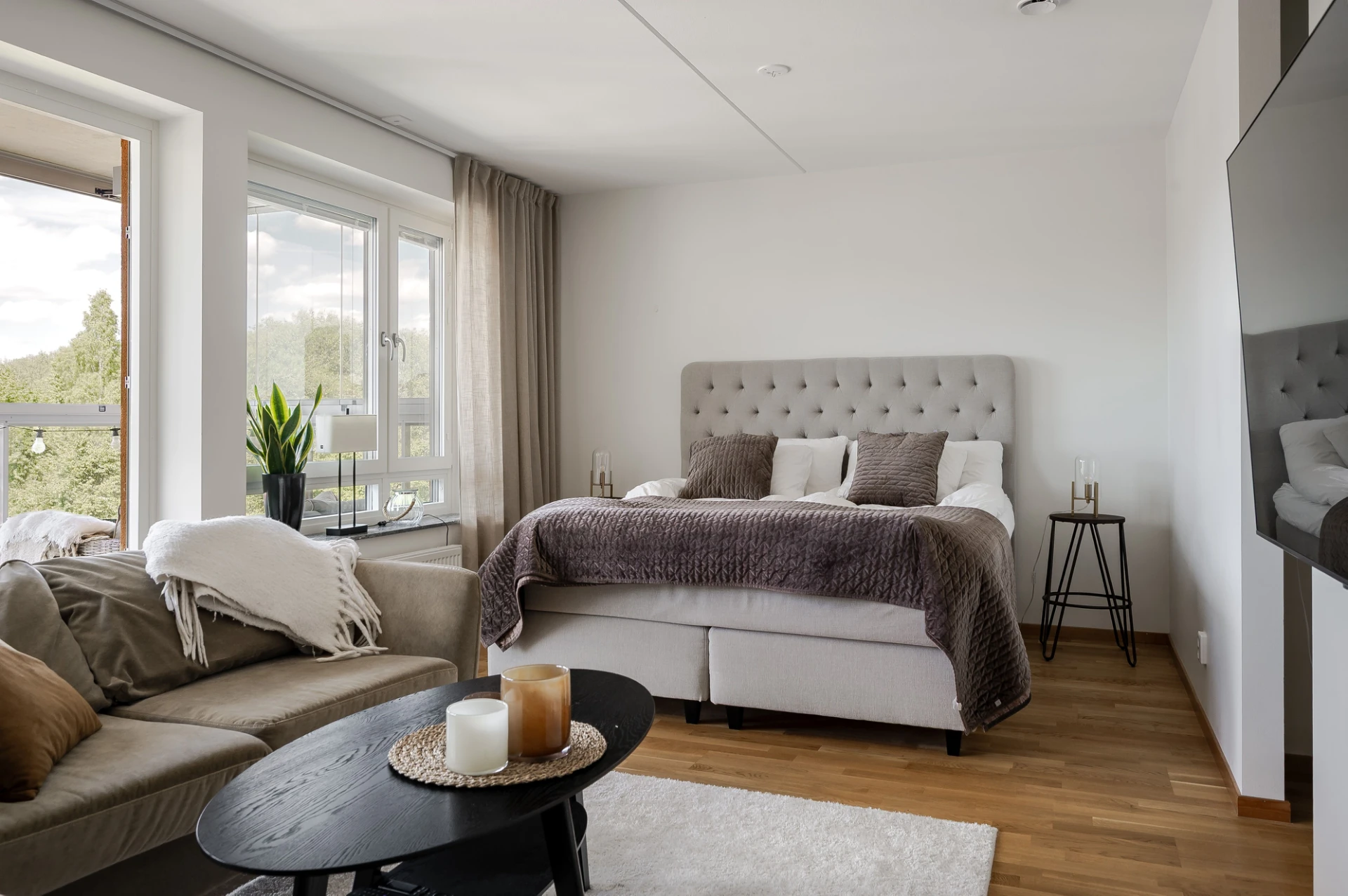 Parkettgolv och målade väggar. Flera olika möbleringsalternativ med plats för soffa, dubbelsäng samt matbord. Härifrån nås den inglasade balkongen med kvällssol. Trätrall på golvet.