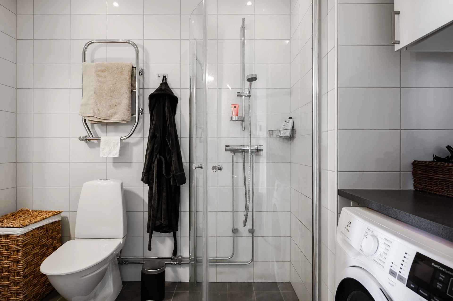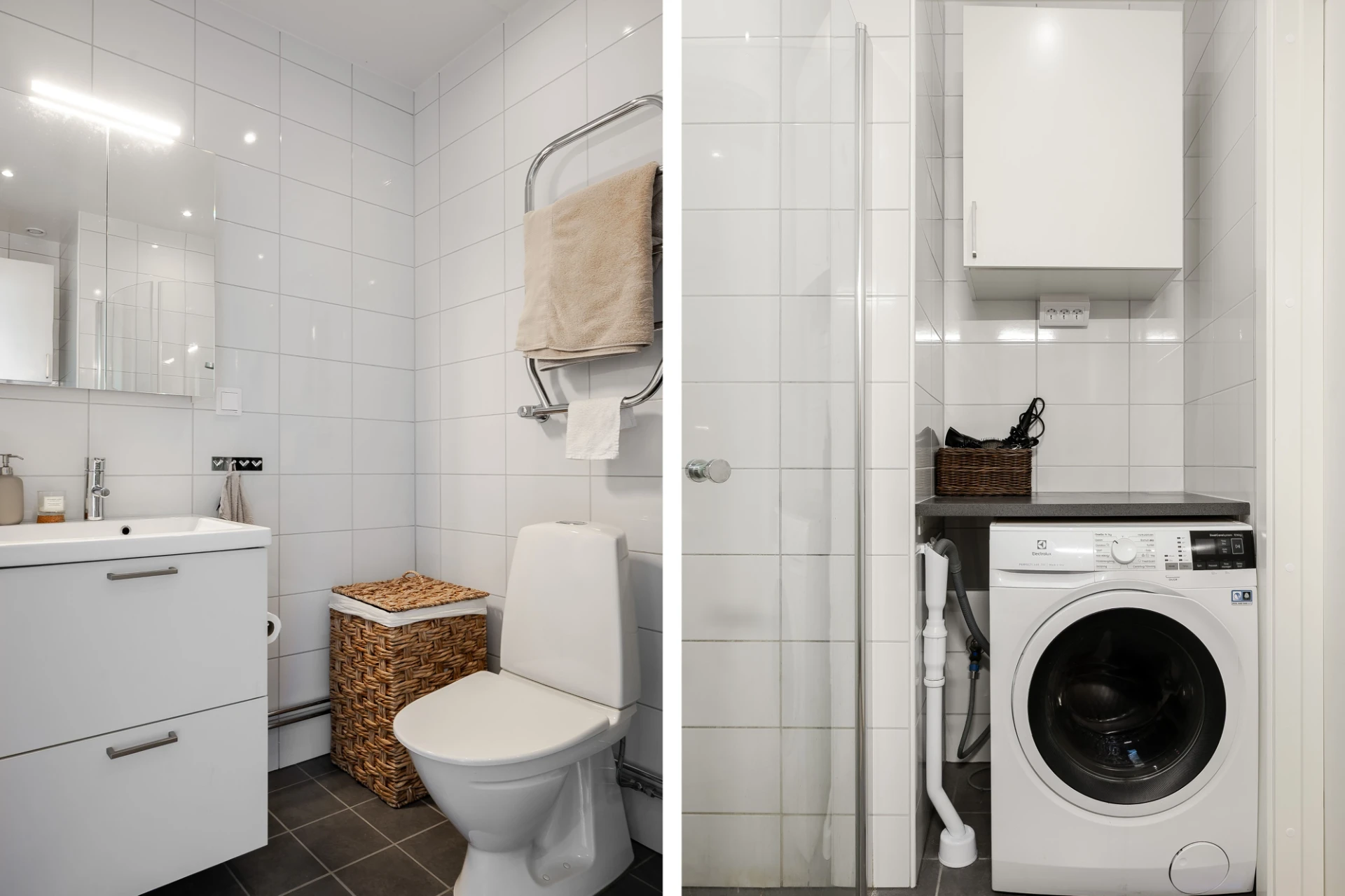 Vitt kakel på väggar och grått klinker på golvet. Här finns WC, handfat med kommod, spegelskåp, handdukstork och kombinerad tvättmaskin/torktumlare. Ovan tvättmaskinen finns en arbetsbänk samt förvaring i skåp.