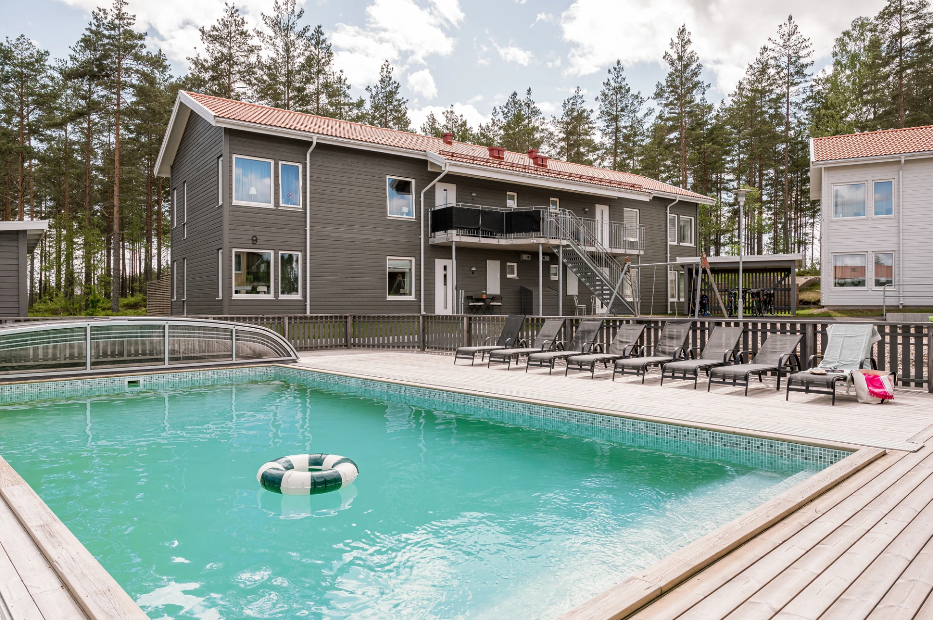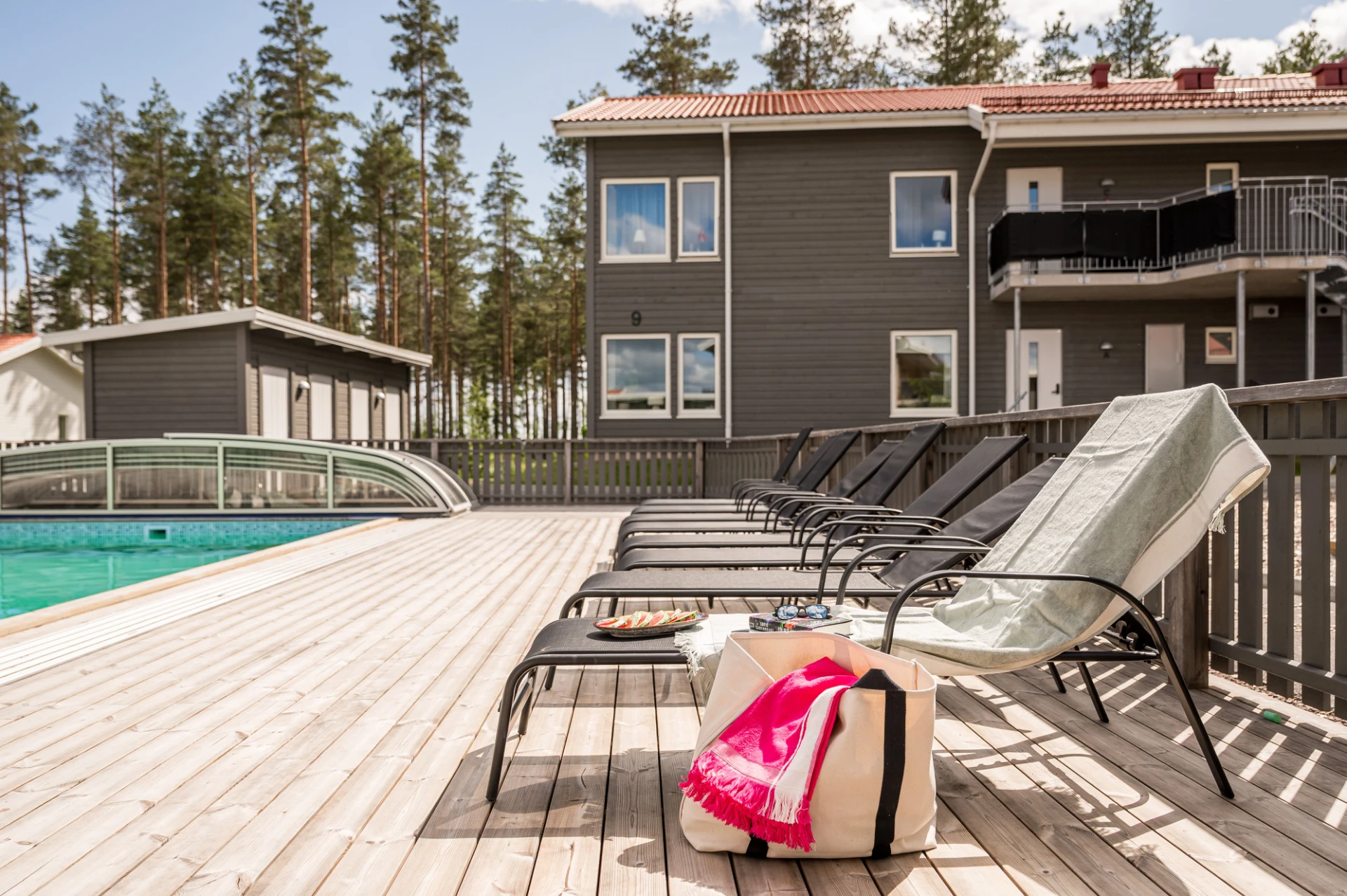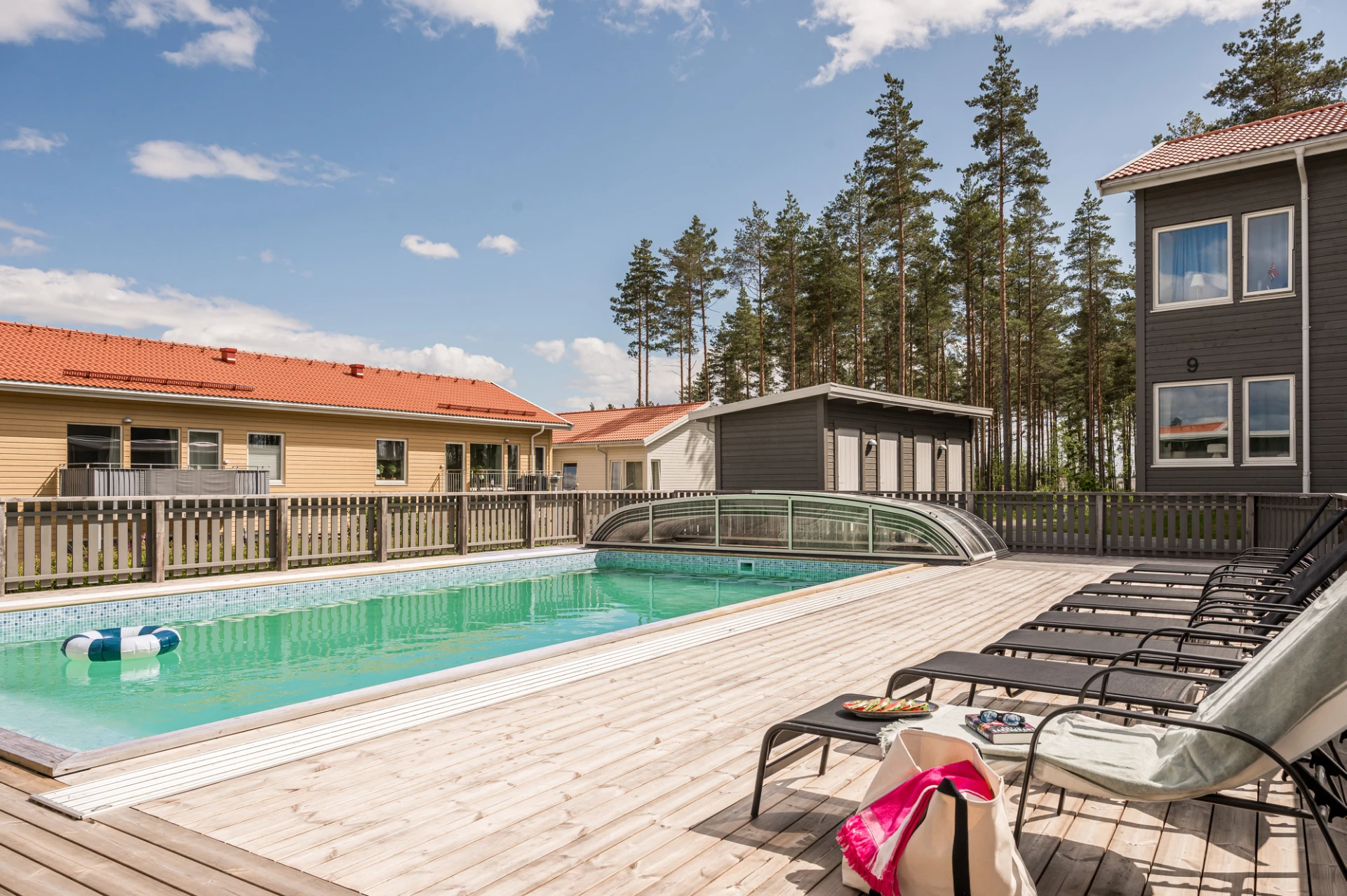 Gemensam gård med pool med tillhörande soldäck. Det finns även en lekplats och en aktivitetsbod.