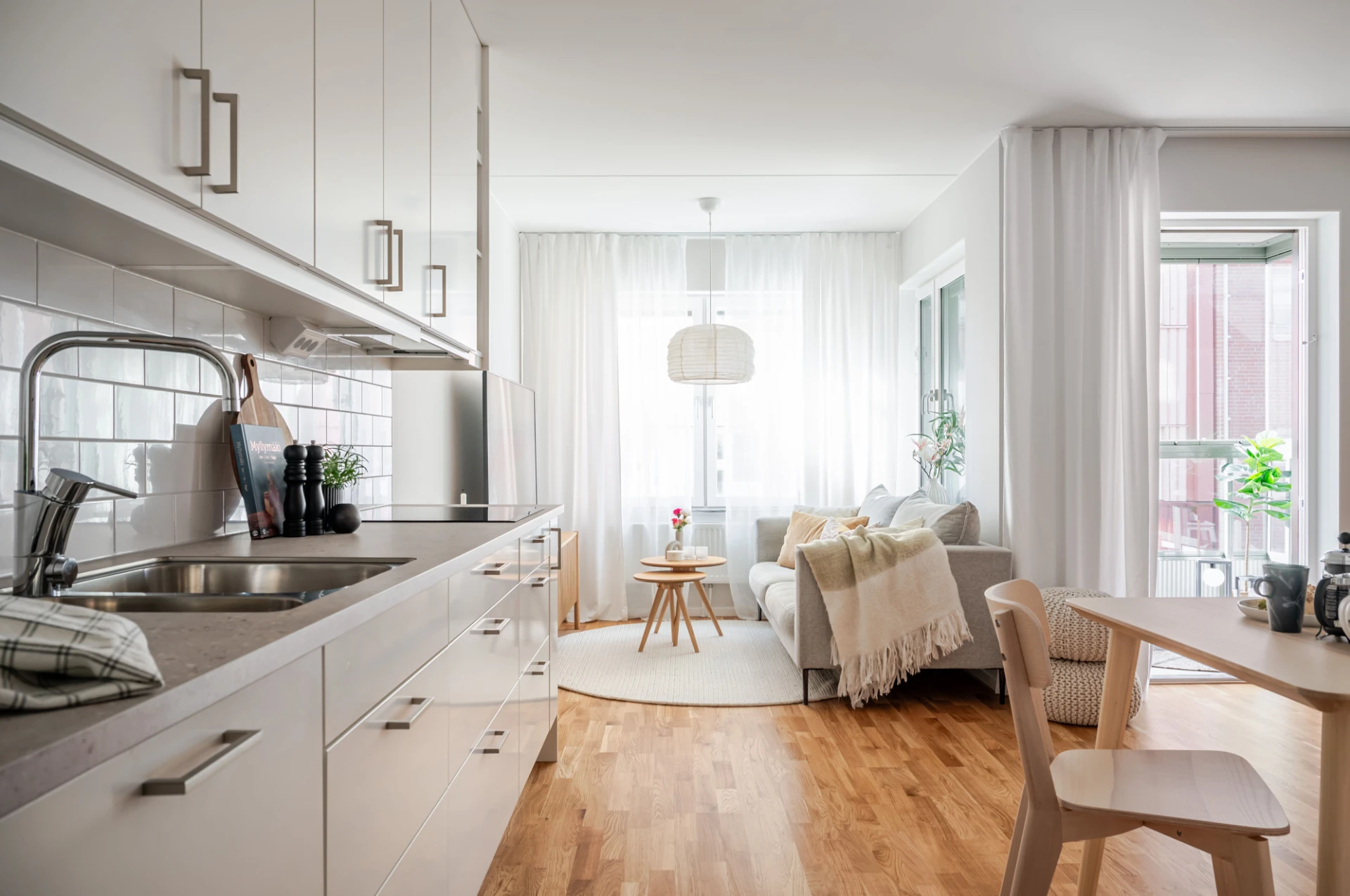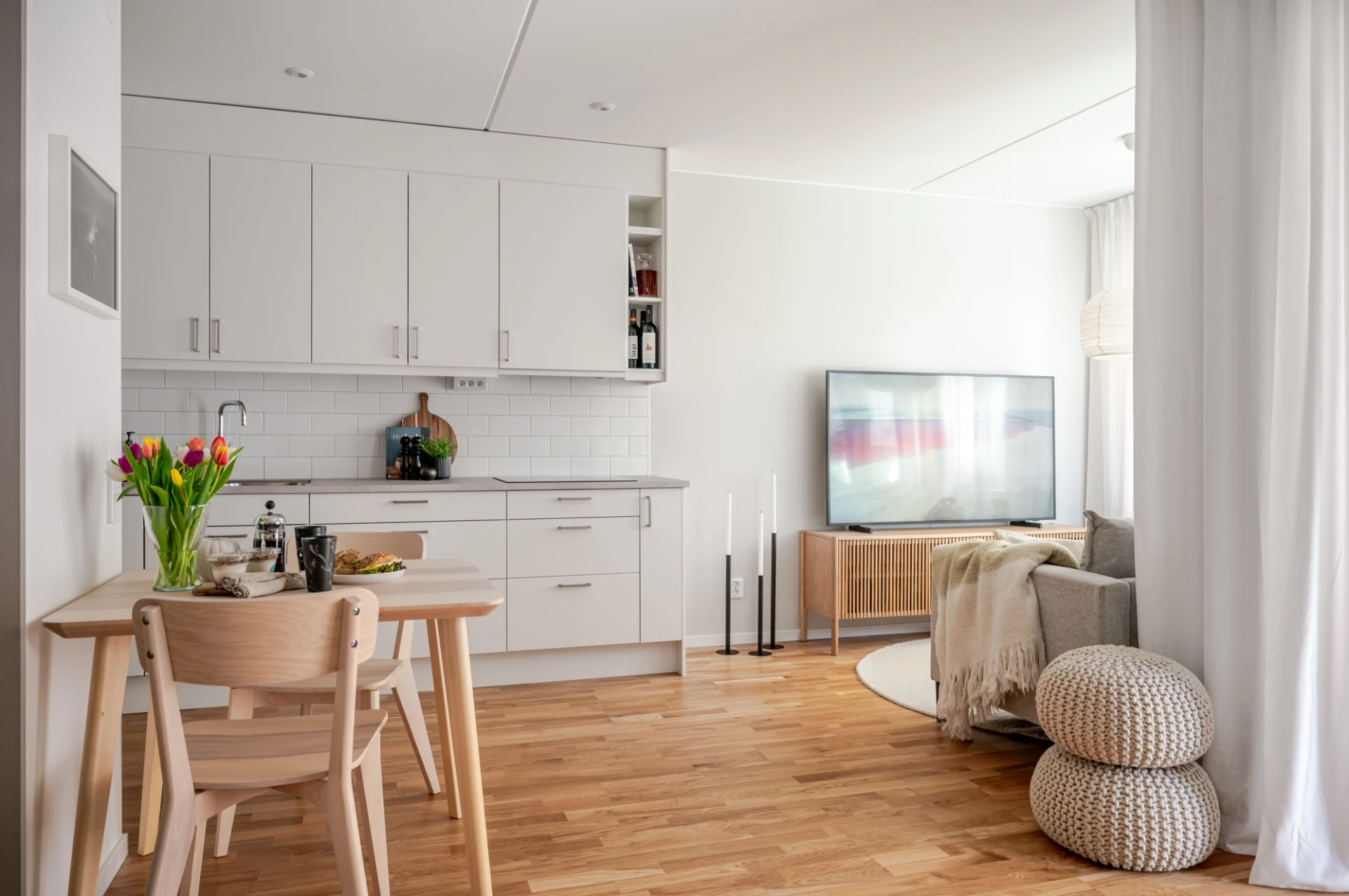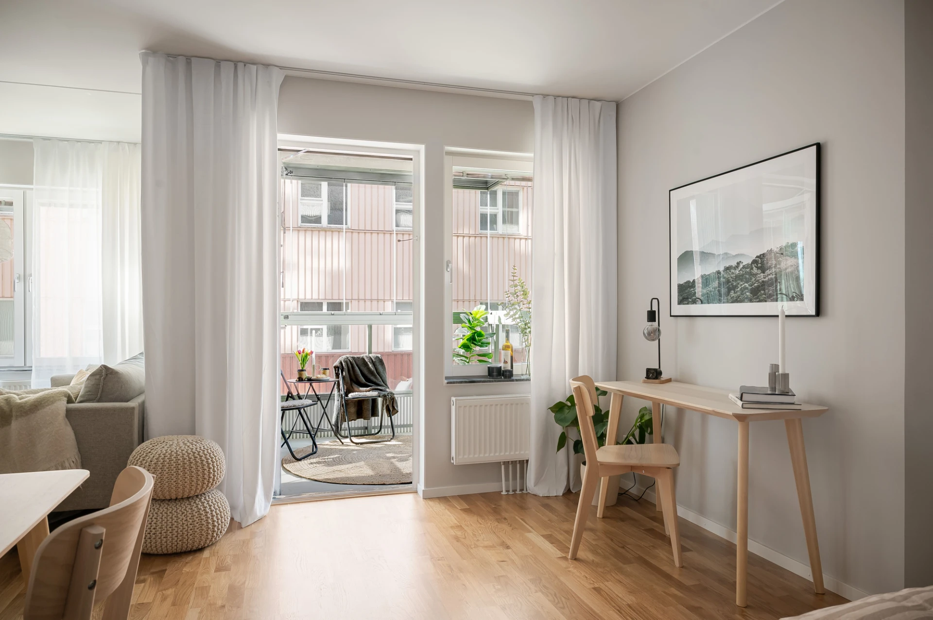 Parkettgolv och målade väggar. Öppen planlösning mot köket och utgång till den inglasade balkongen.