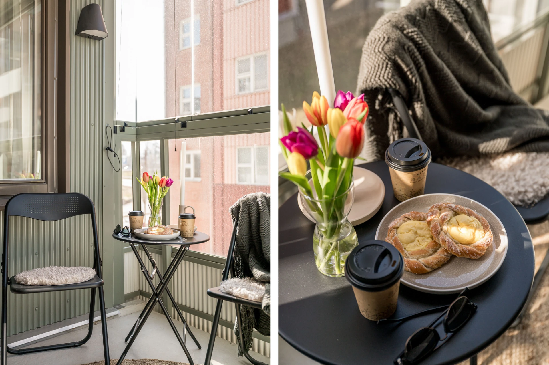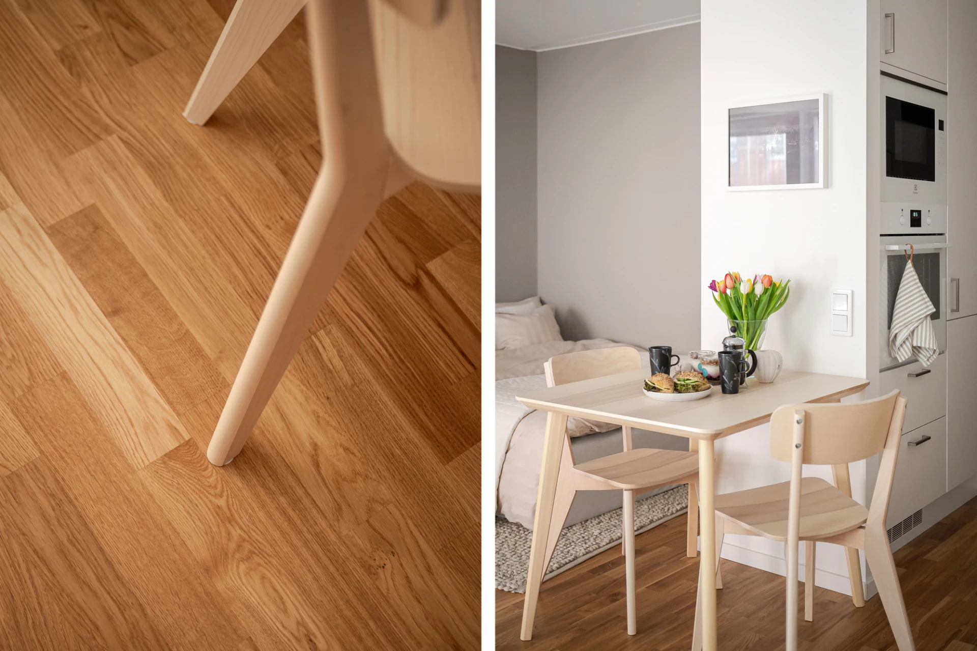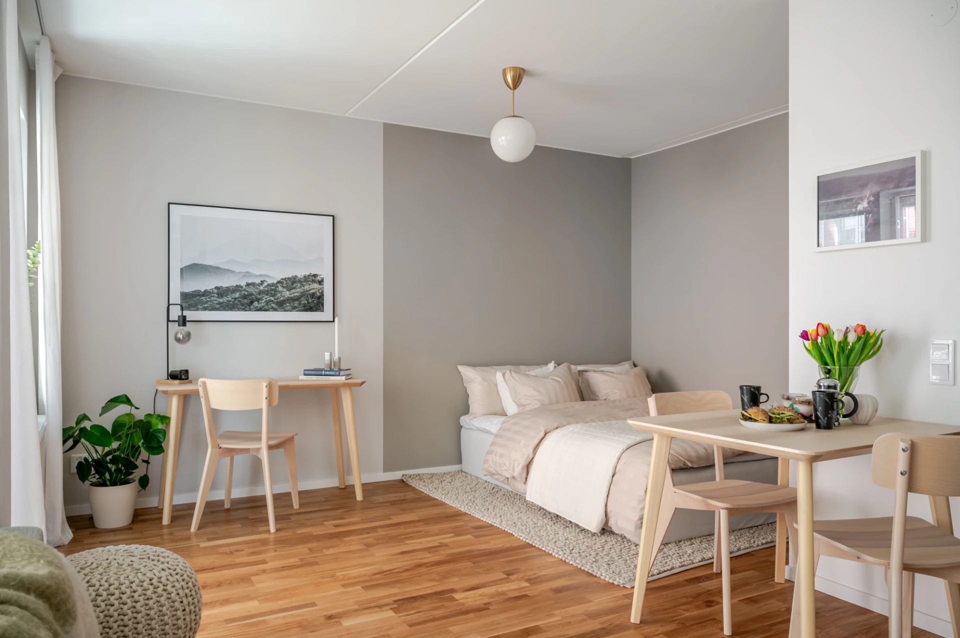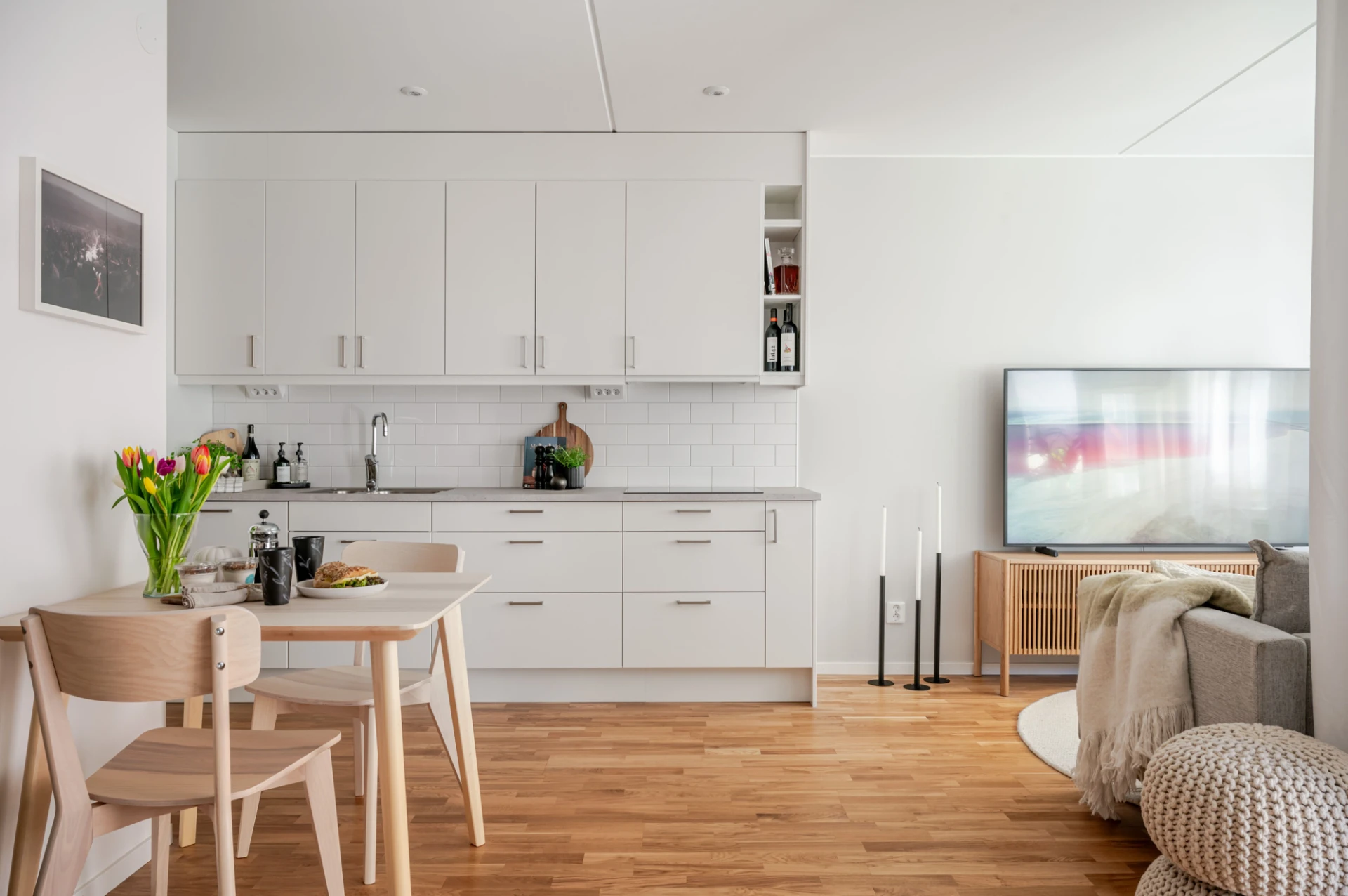Parkettgolv och målade väggar. Öppen planlösning mot köket och utgång till den inglasade balkongen.
