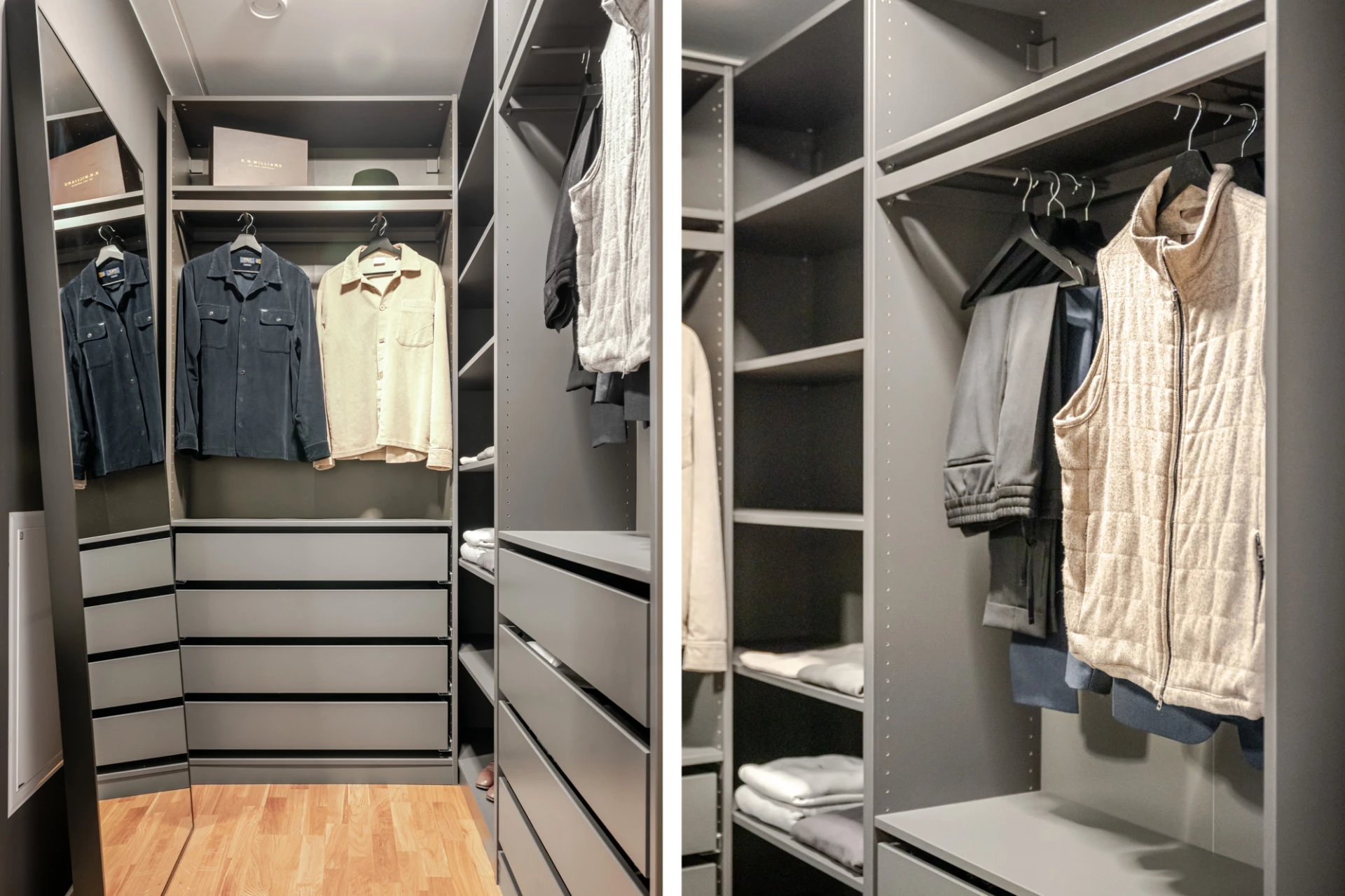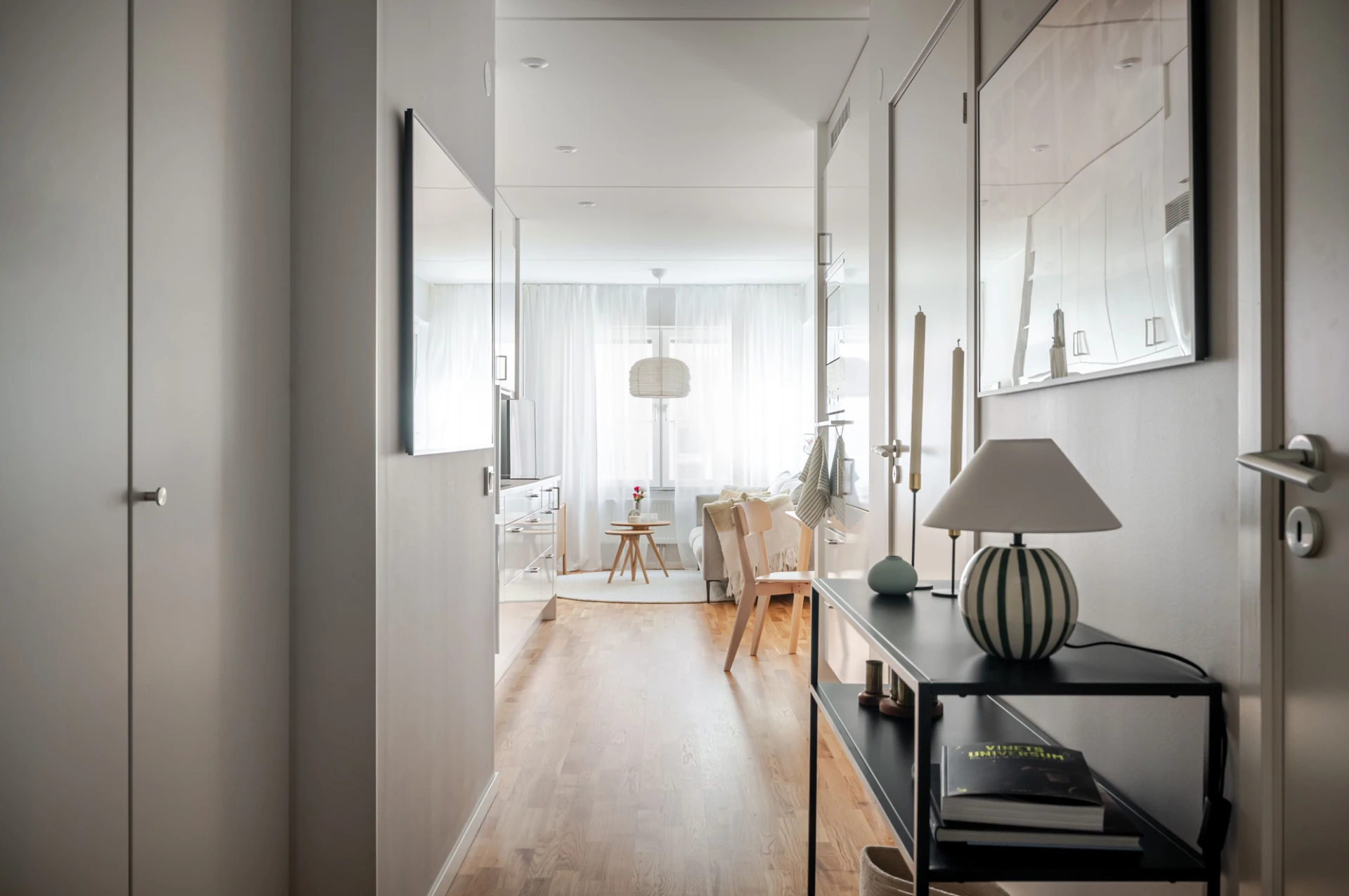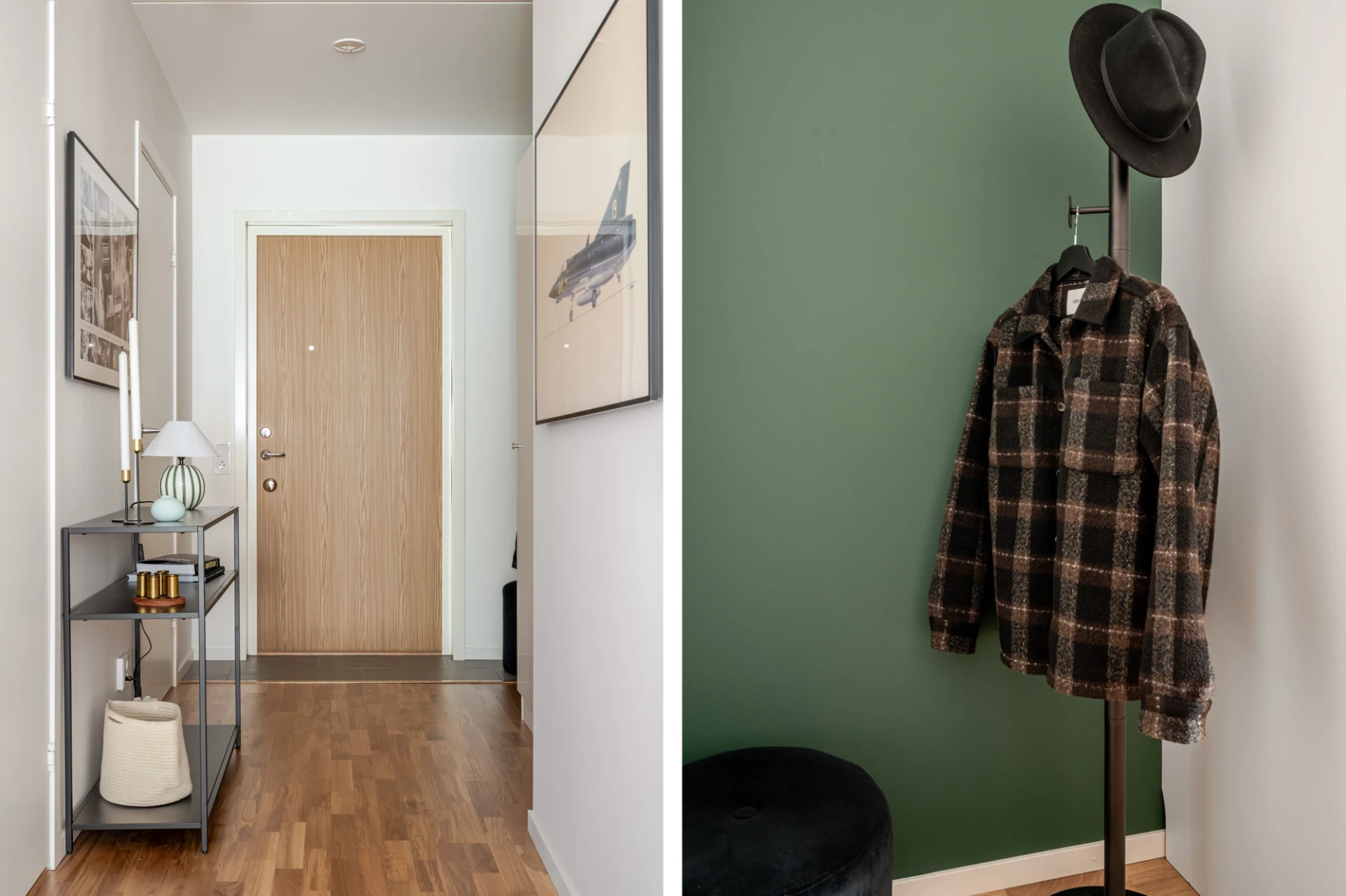 Klinkergolv som övergår till parkettgolv som är genomgående i hela lägenheten och målade väggar. Här ges god klädförvaring, både i de två garderoberna i hallen samt i den angränsande klädkammaren med PAX-system.