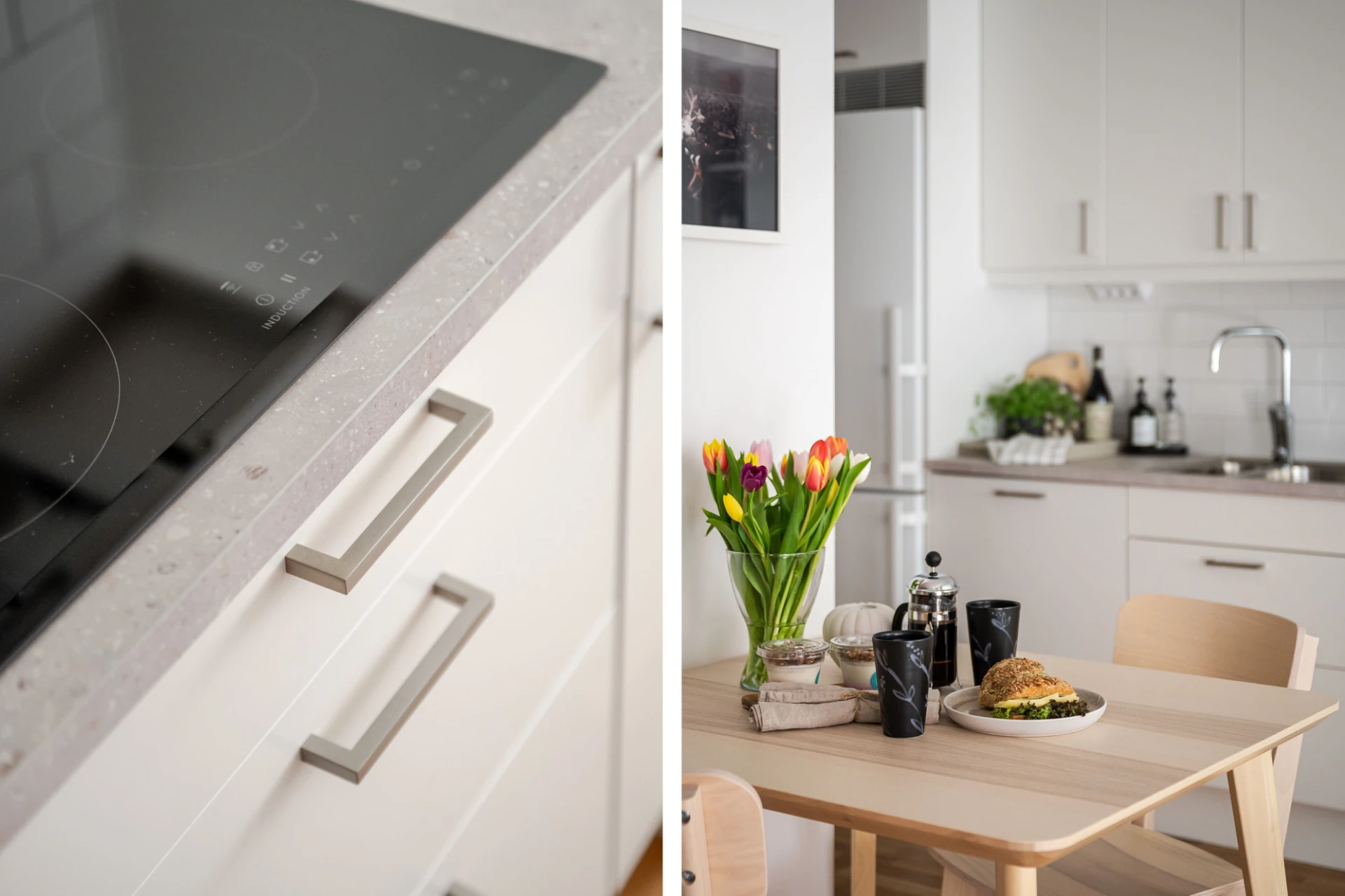 Parkettgolv och målade väggar. Vita, släta köksluckor med vitt kakel ovan bänkskivan. Den maskinella utrustningen består av spishäll, spisfläkt, inbyggnadsugn- och mikro, integrerad diskmaskin samt kyl- och frys.