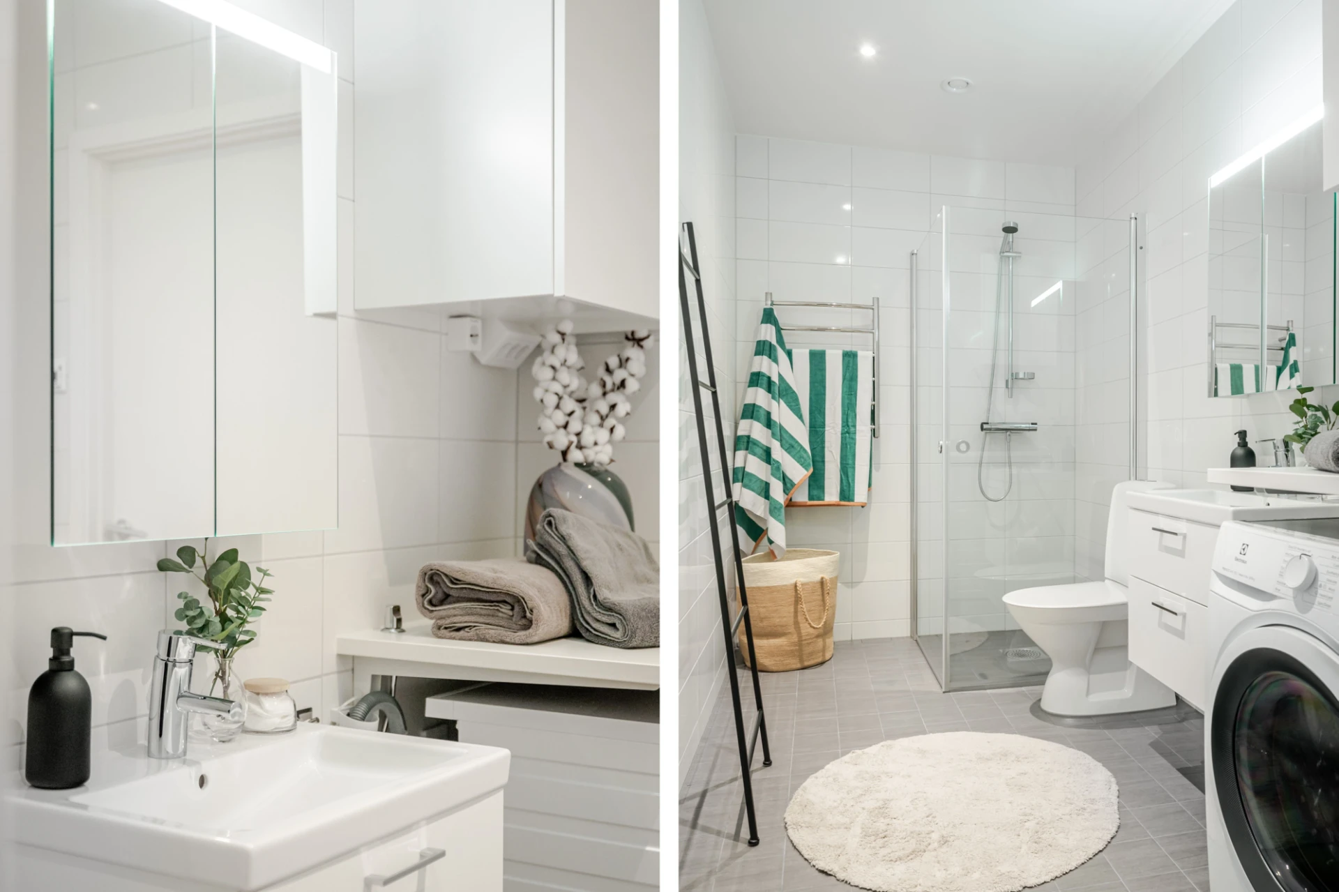 Helkaklat duschrum med WC, handfat med kommod, spegelskåp, handdukstork, dusch med glasväggar samt kombitvättmaskin.