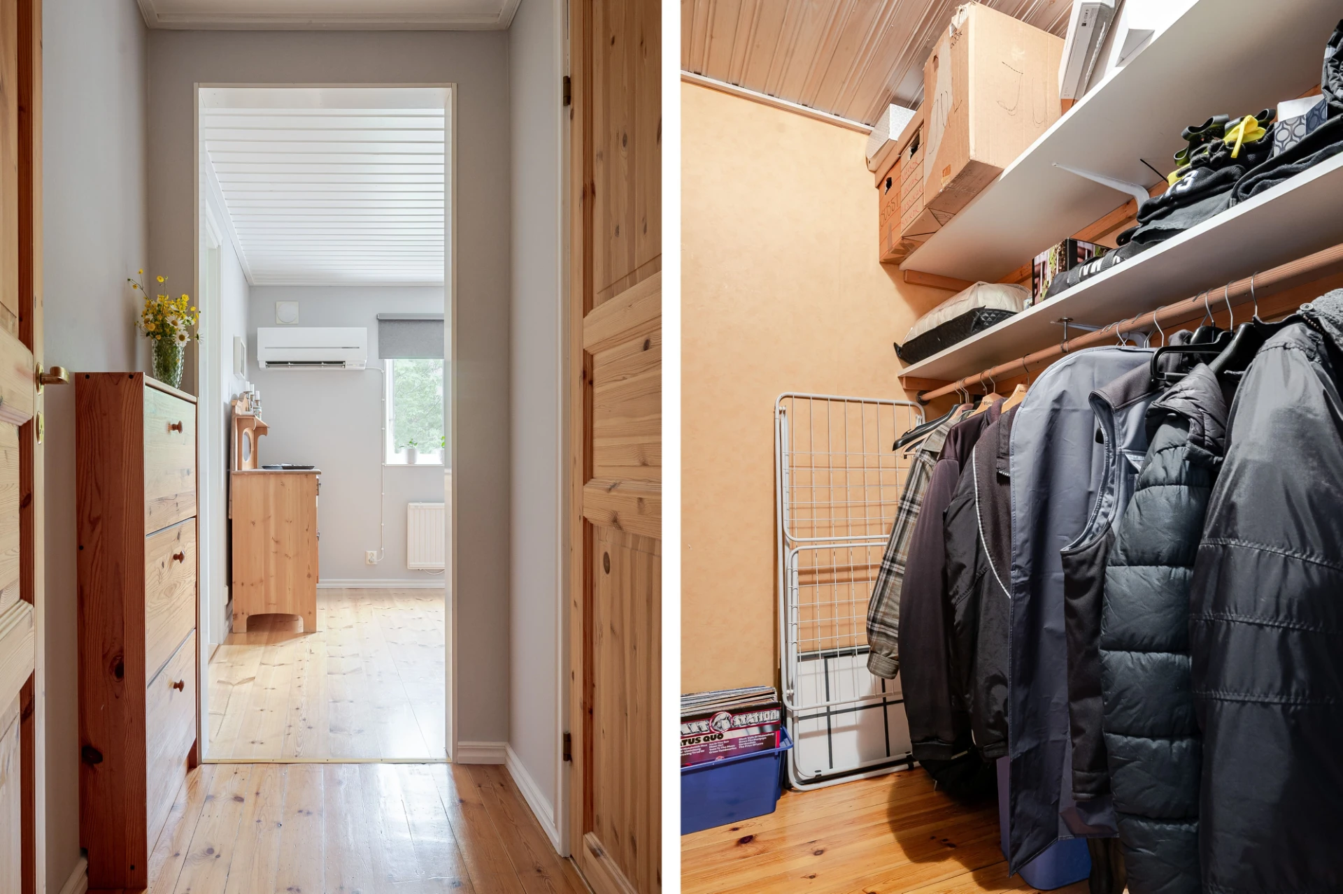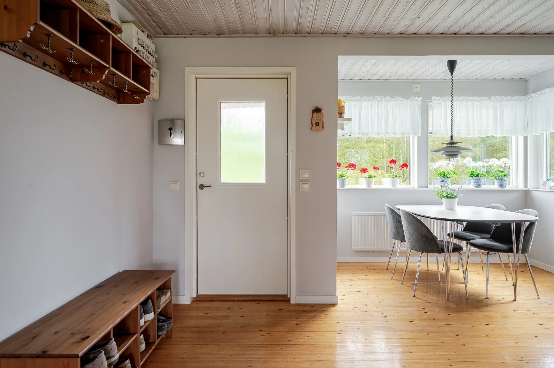 Välkomnande entré med avhängningsmöjligheter till höger. Ljusa väggar och vackert plankgolv.