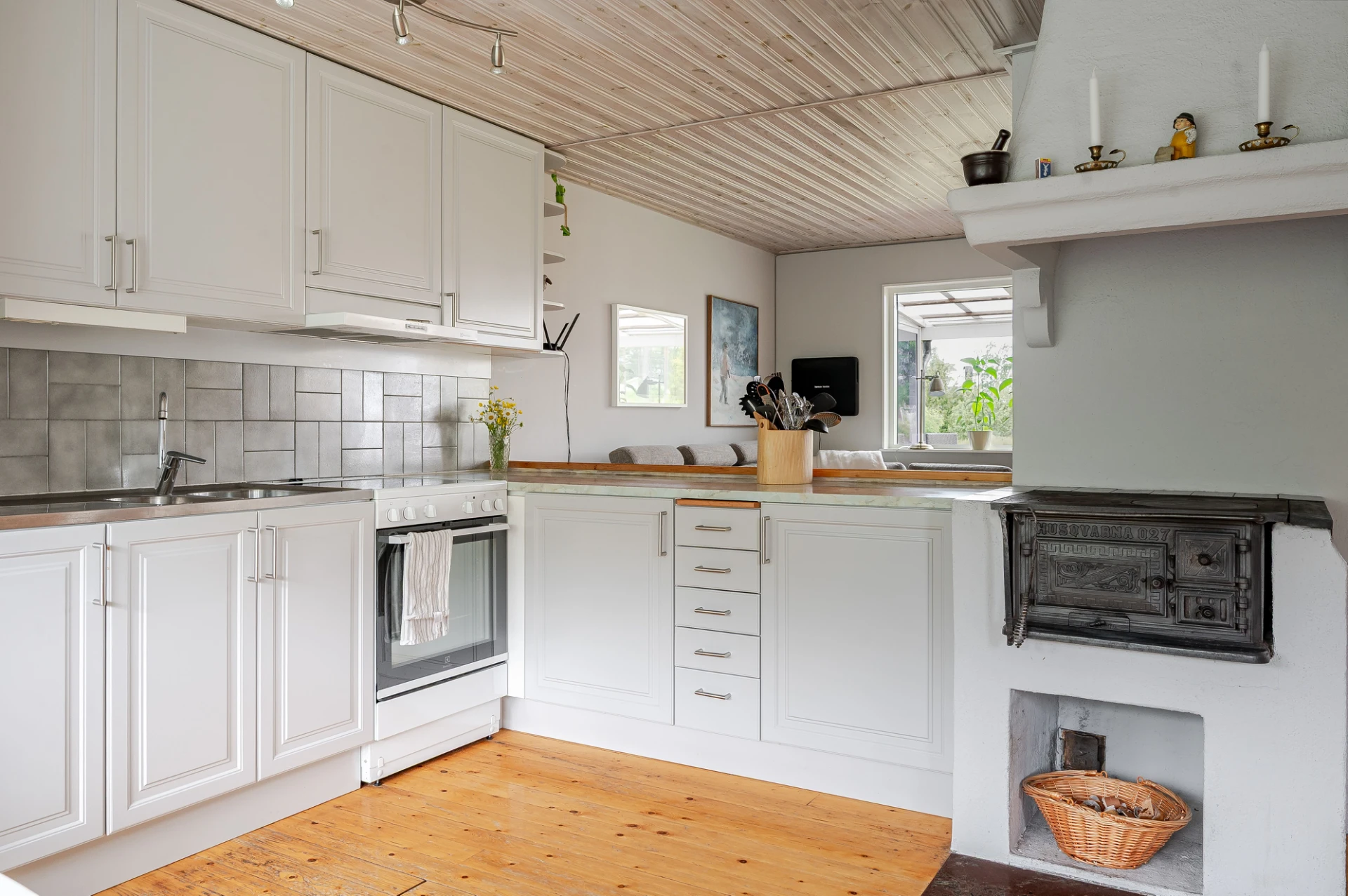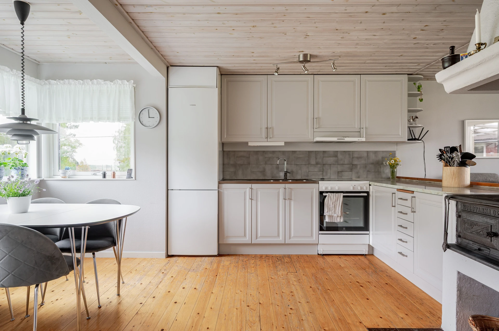 Rymligt kök med goda arbetsytor och ljusa köksluckor. Här har ni gott om plats för en matgrupp. Köket är utrustat med spis, fläkt, halv kyl och frys, diskho samt en underbar vedspis. Plankgolv och ljusa tapeter.