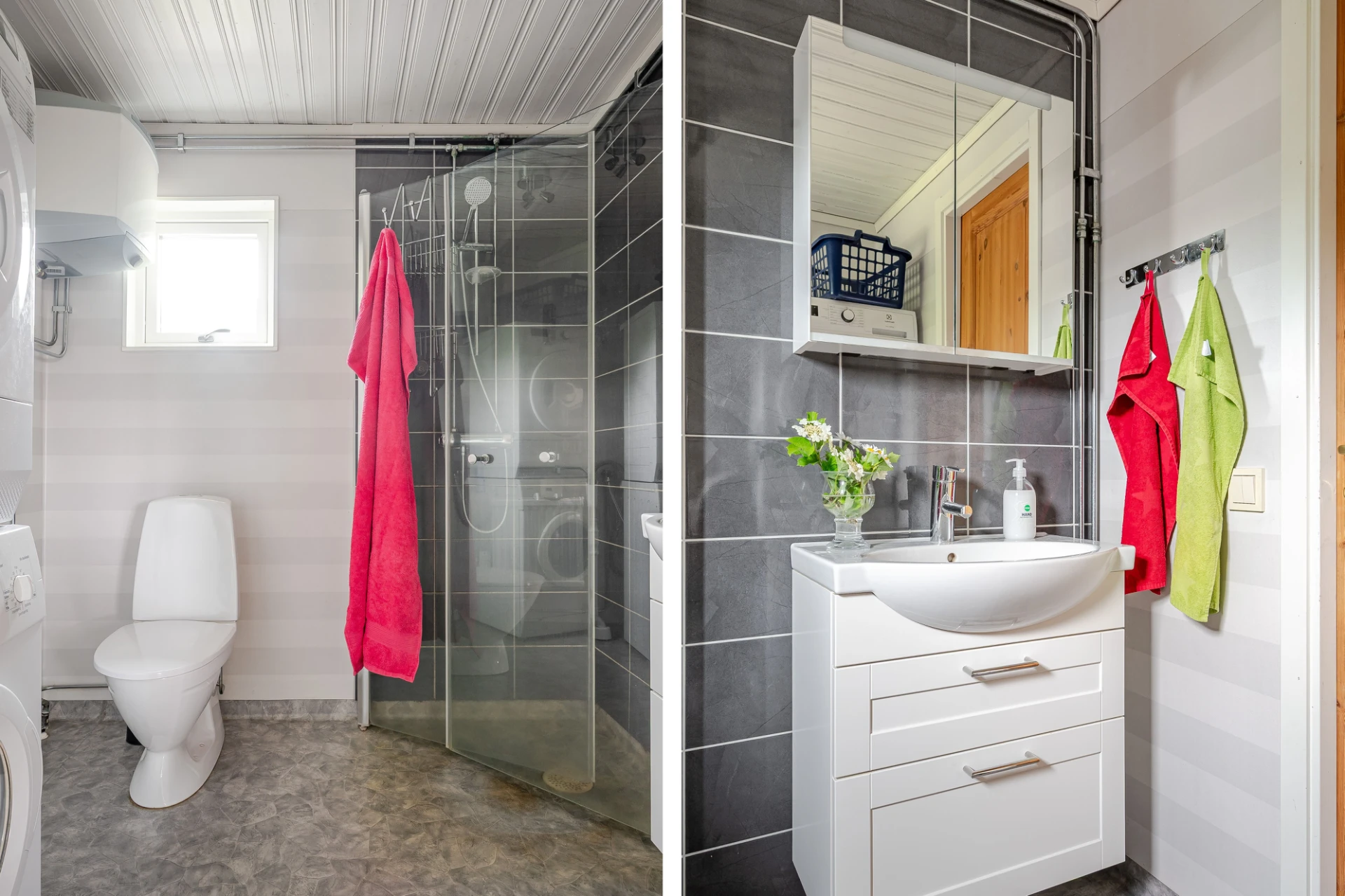 Fräscht badrum i ljusa toner. Här finner ni en tvättmaskin, torktumlare, handfat med kommod, spegelskåp och dusch. På golvet ligger en grå plastmatta och väggarn är klädda i både plastmatta och kakel i gråa toner.