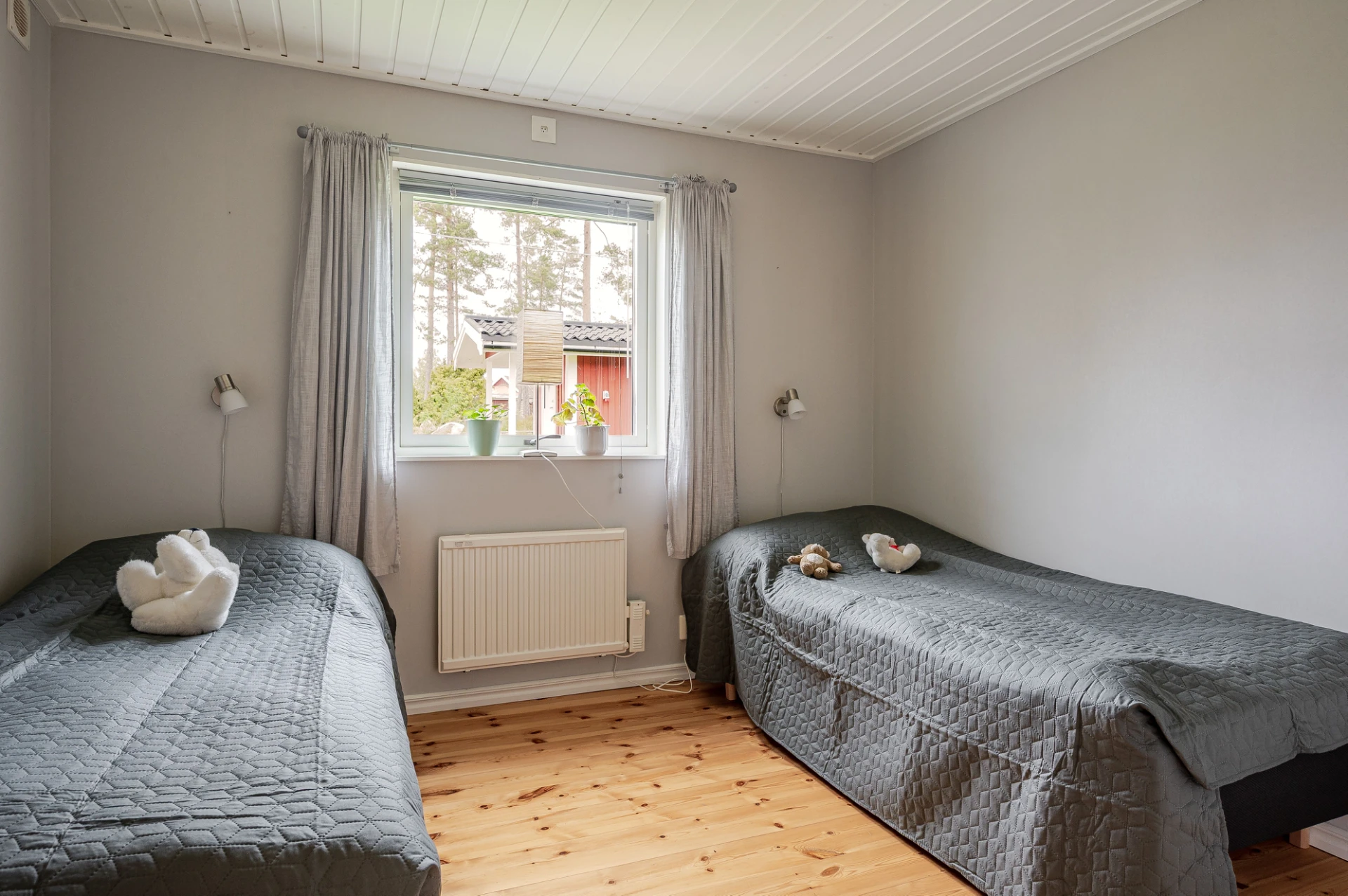 Trivsamt sovrum med plast för två sägnar och tillhörande möblemang. Plankgolv och ljusgråa väggar.