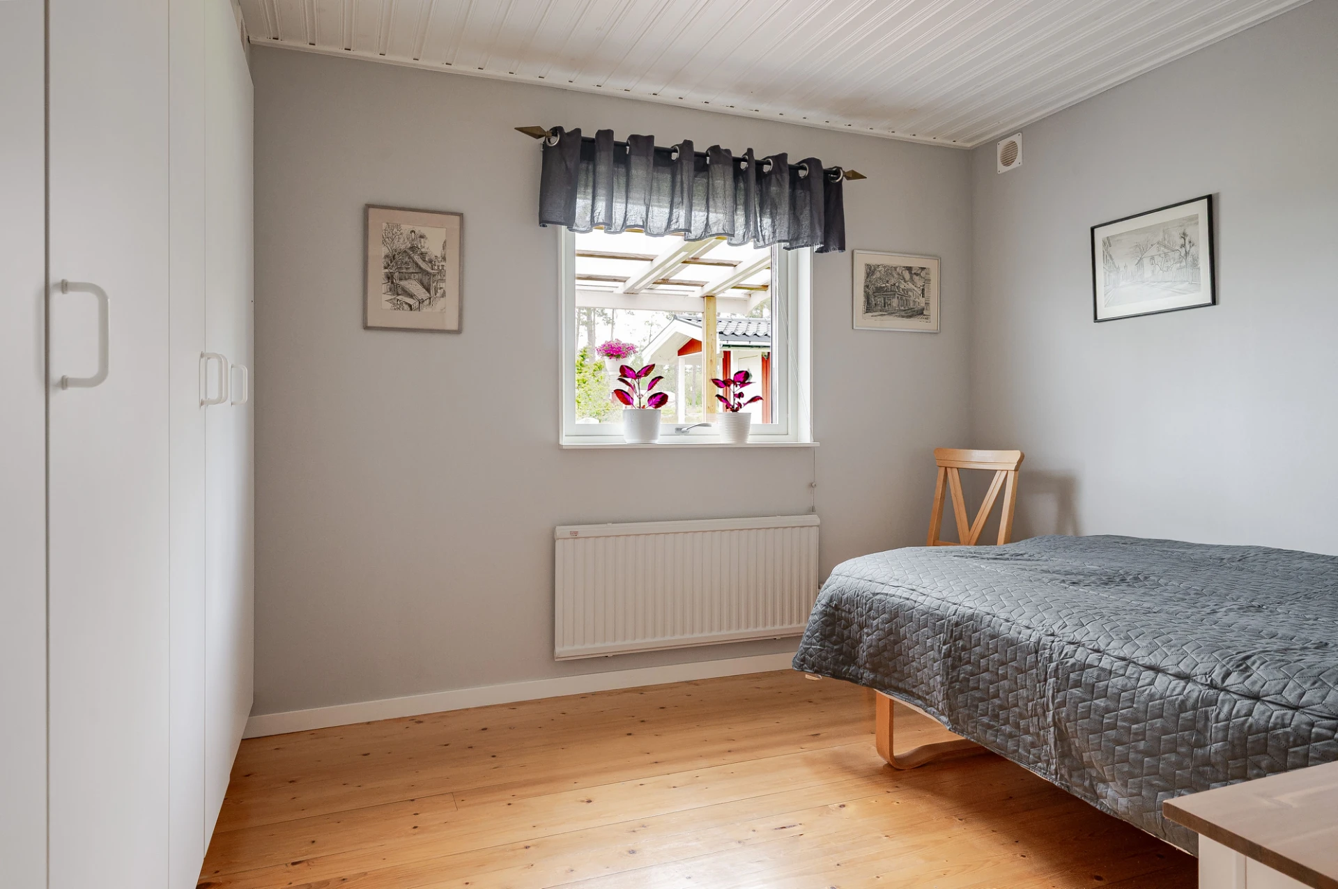 Ombonat sovrum med plats för en större säng och tillhörande möblemang. Här finner ni gott om förvaring i tre garderober. Plankgolv och ljusgråa tapeter.