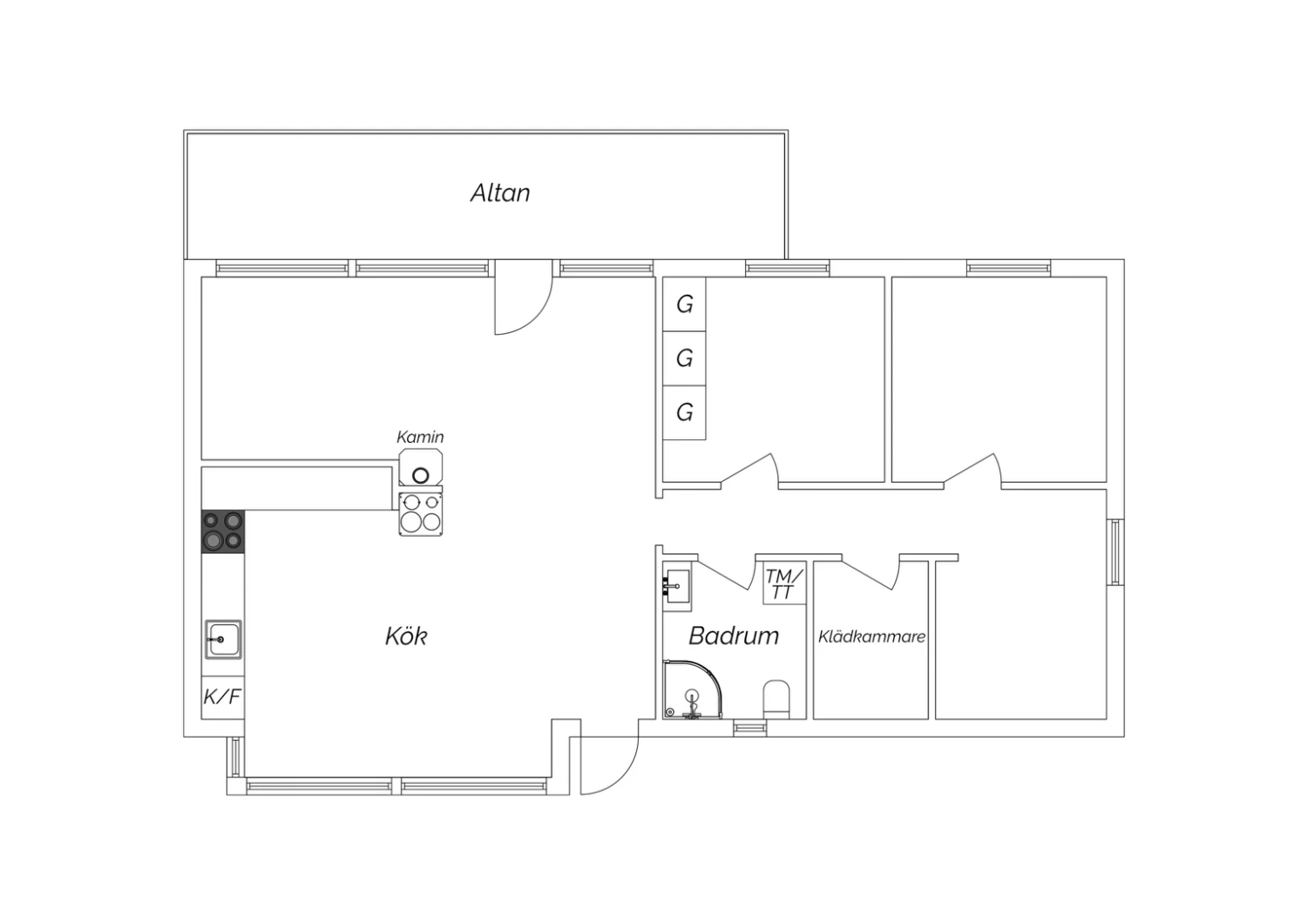 Mellan kök och vardagsrum är det en öppen planlösning. Här får ni plats med en soffgrupp och tillhörande möbler, här finner även ni en mysig kamin. Fönster åt två vädersträck släpper in härligt dagsljus hela dagen.Plankgolv ovh ljusa tapeter. Härifrån når ni den otroliga altanen i nordvästläge.