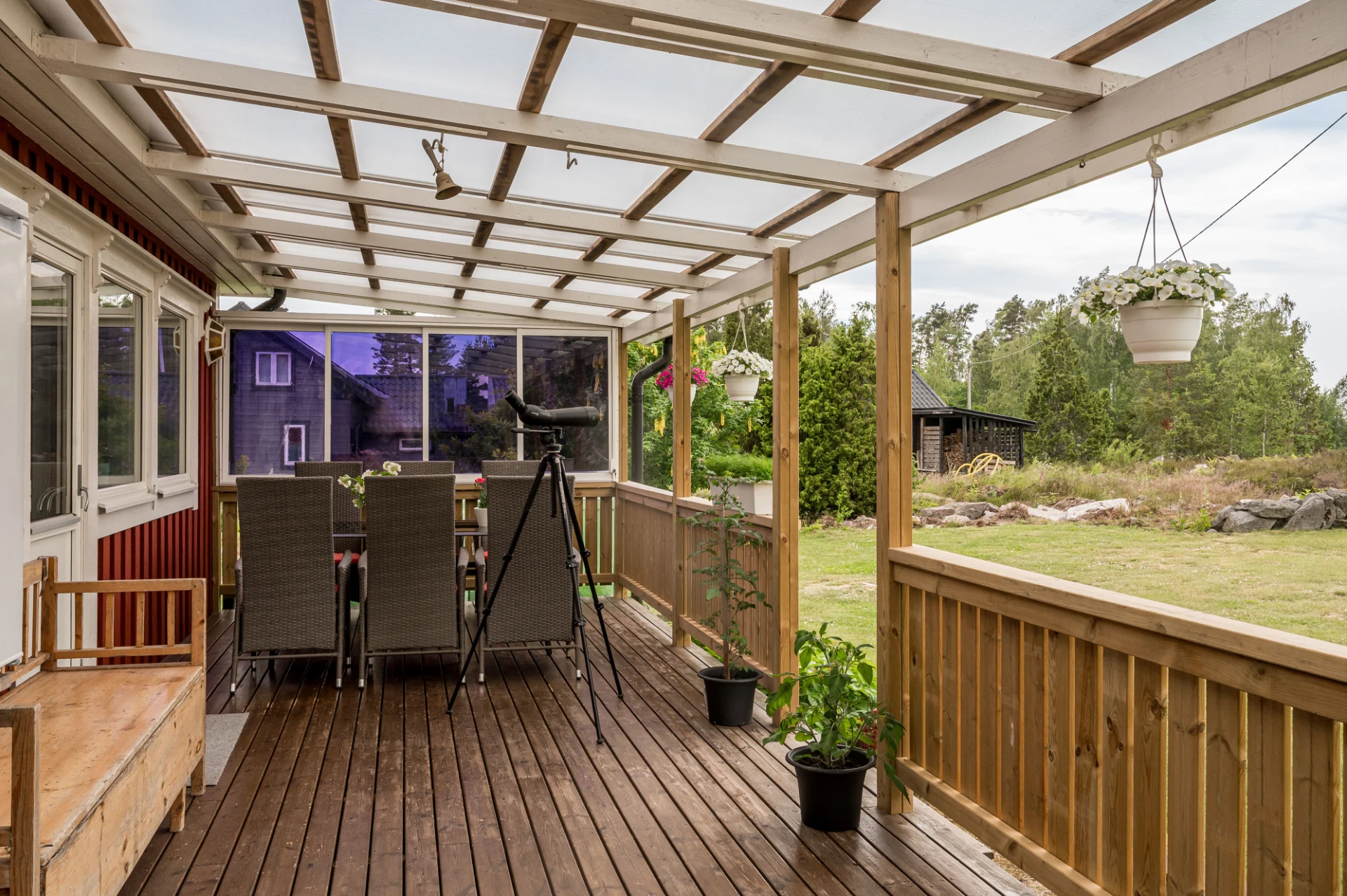 Beskrivning uteplats: Altan i österläge finns i anslutning till hallen samt en alten om 27 kvm med tak i nordväst läge finns i anslutning till vardagsrummet. Vidare finns en lummig uteplats i nordöst läge med stenbord och eldstad.
