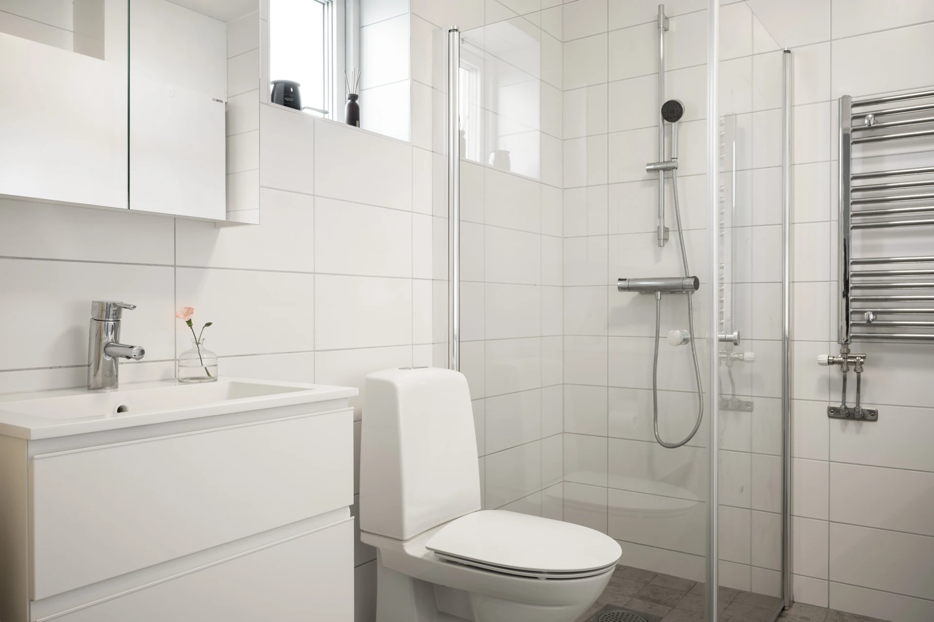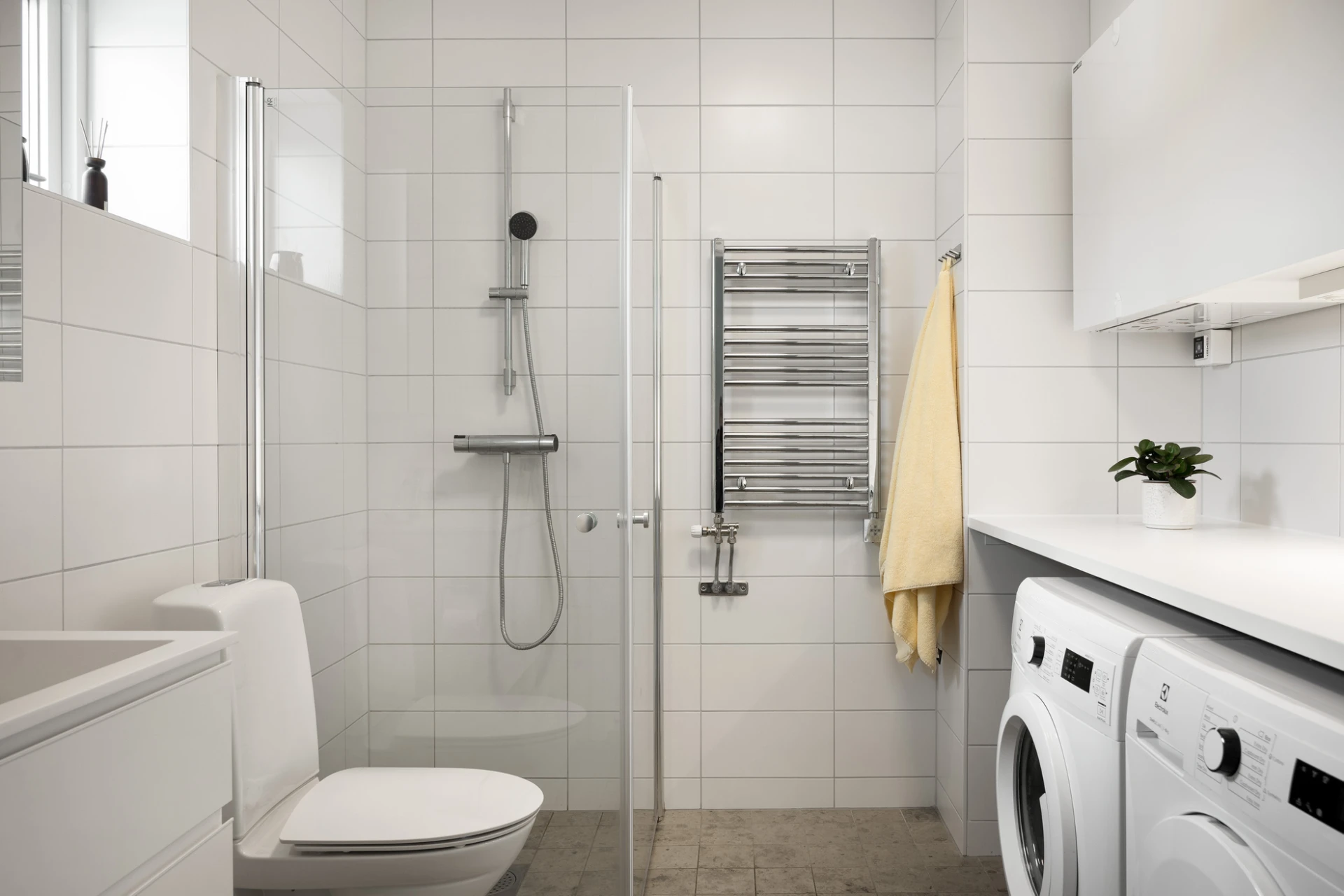Bostaden erbjuder två sovrum, varav ett rymligt master bedroom med inbyggda garderober. Det helkaklade badrummet är stilrent och utrustat med dusch samt egna tvättmöjligheter som underlättar vardagen.