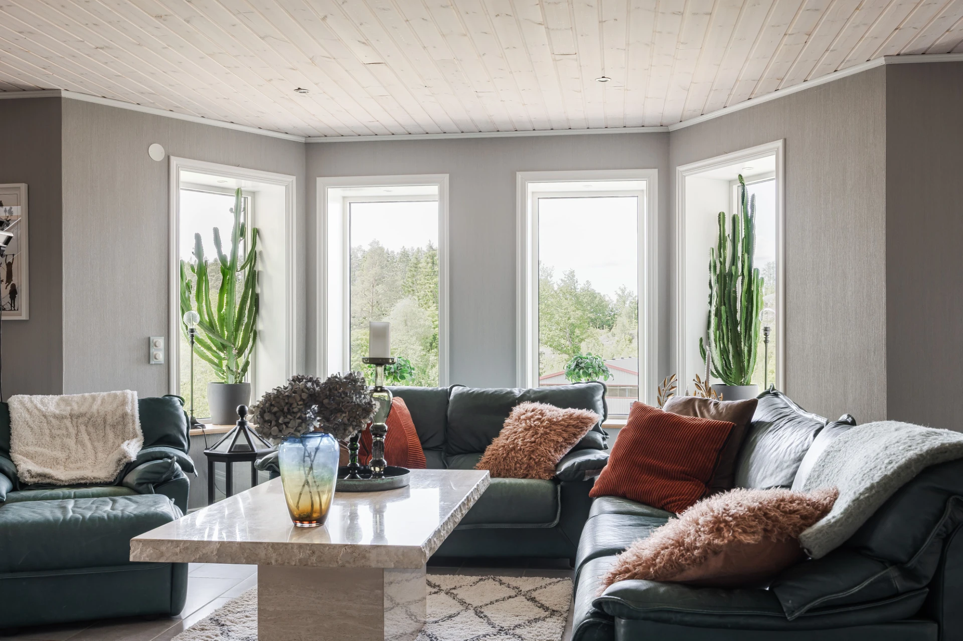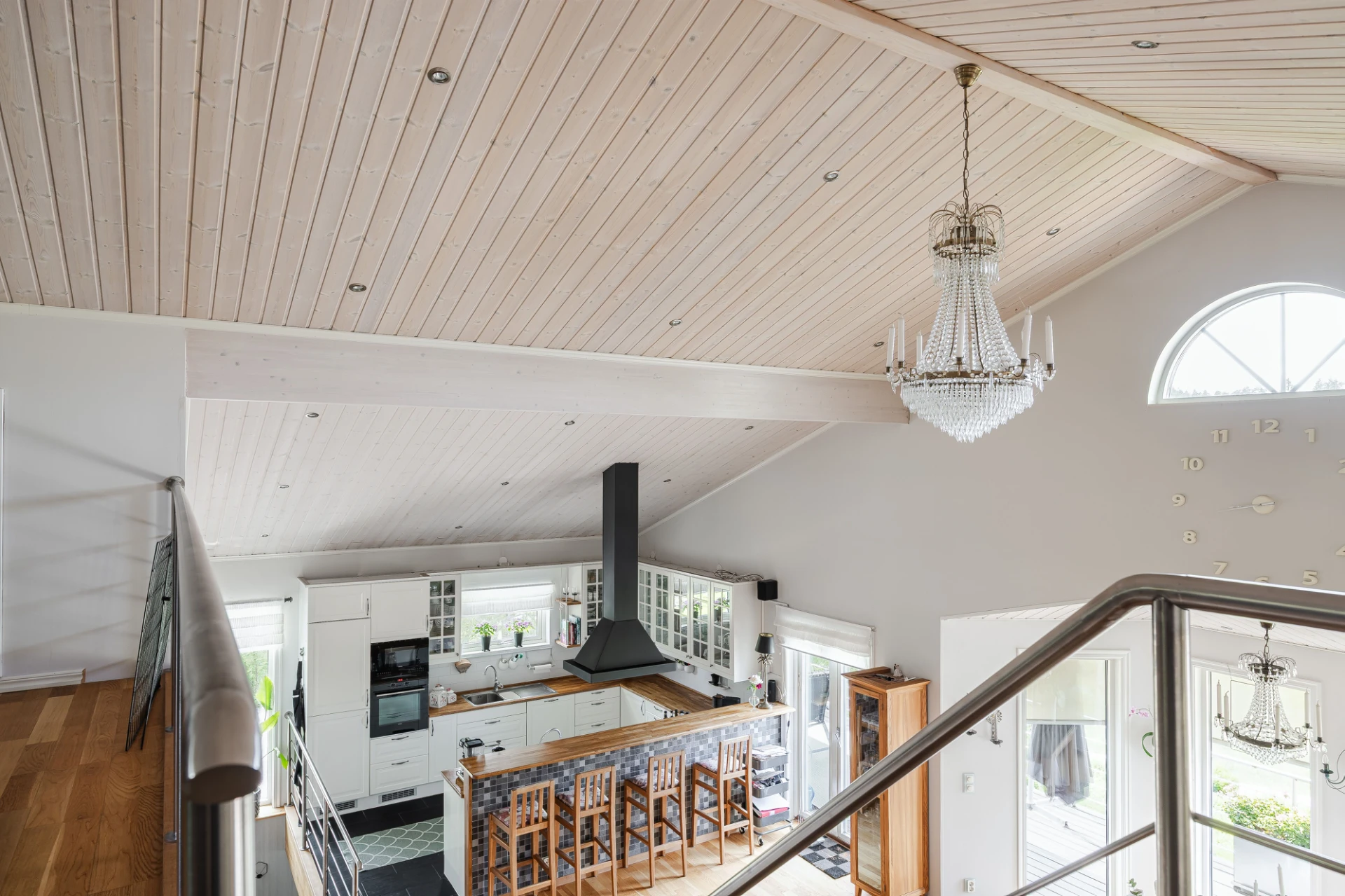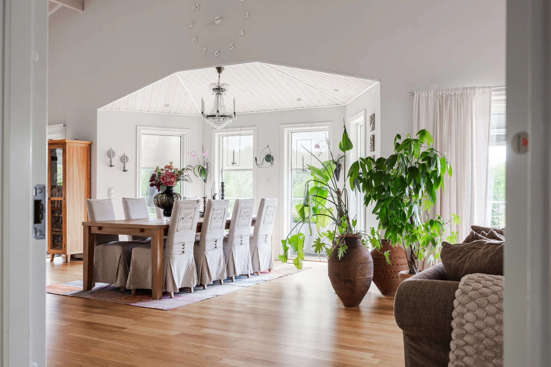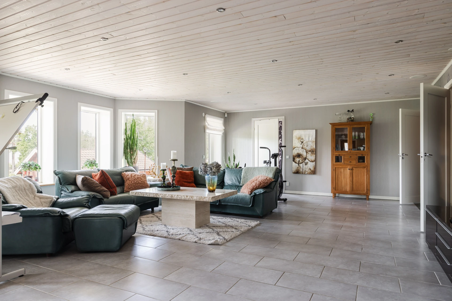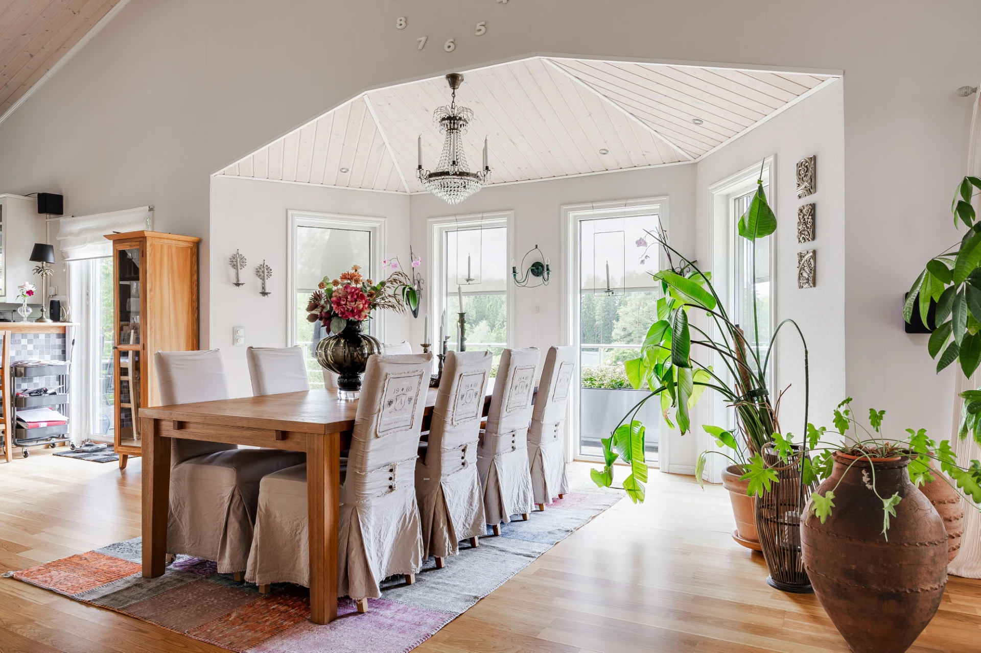 Villan bjuder på högt i tak, stora fönsterpartier och ett fantastiskt ljusinsläpp som skapar en öppen och luftig känsla i hela huset. De stora sällskapsytorna är perfekta för både familjeliv och sociala tillställningar – här finns gott om plats för långa middagar, mysiga filmkvällar och umgänge i stora grupper.