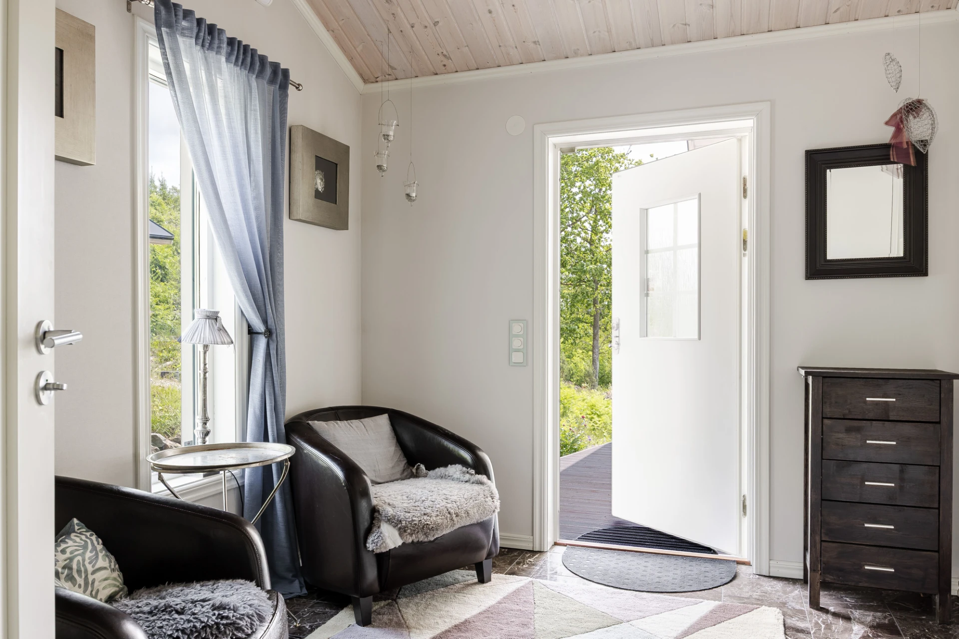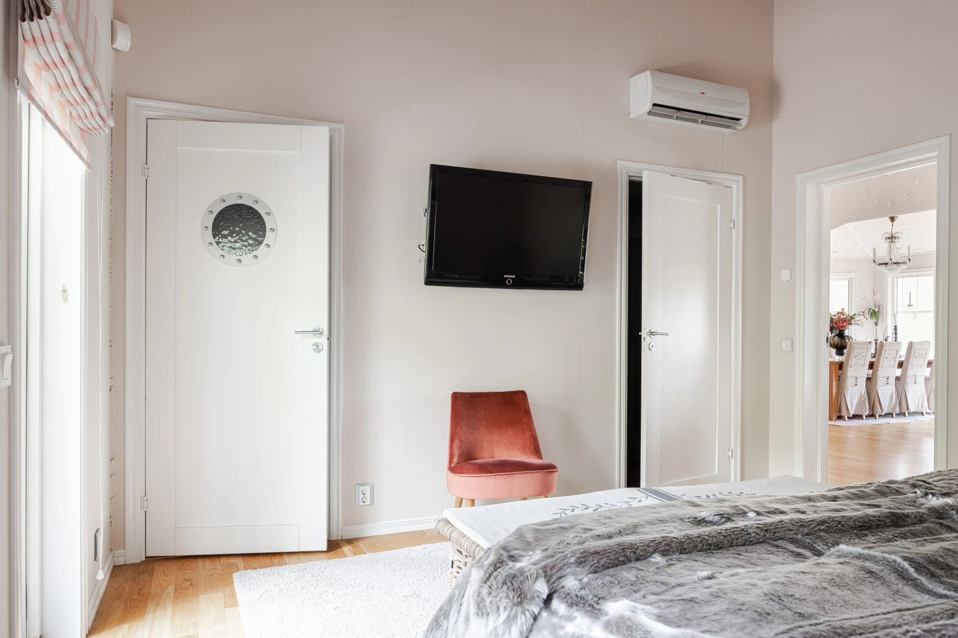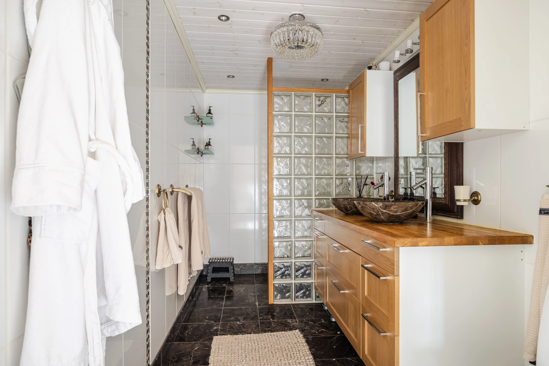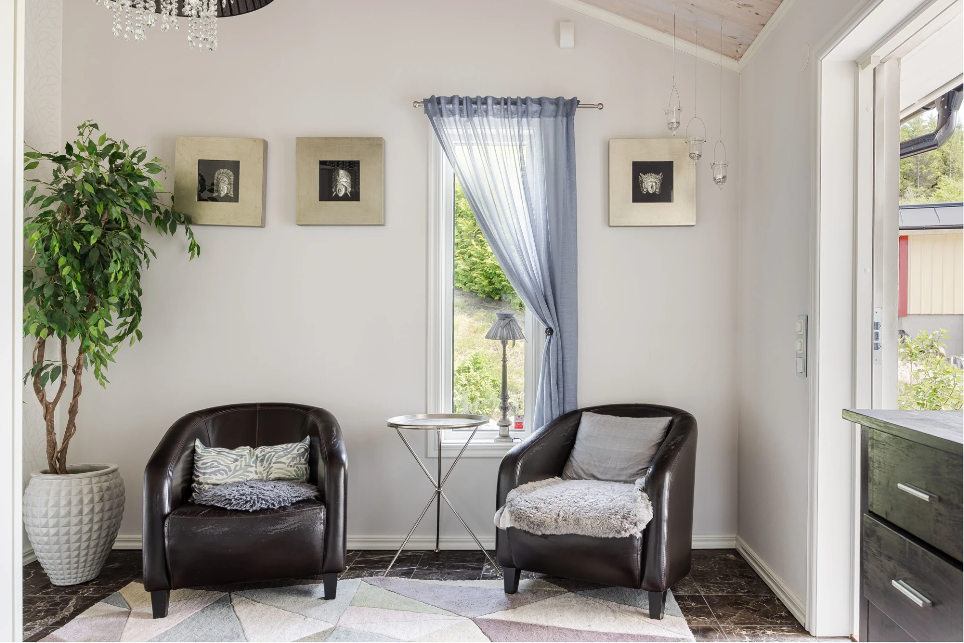 Villan bjuder på högt i tak, stora fönsterpartier och ett fantastiskt ljusinsläpp som skapar en öppen och luftig känsla i hela huset. De stora sällskapsytorna är perfekta för både familjeliv och sociala tillställningar – här finns gott om plats för långa middagar, mysiga filmkvällar och umgänge i stora grupper.