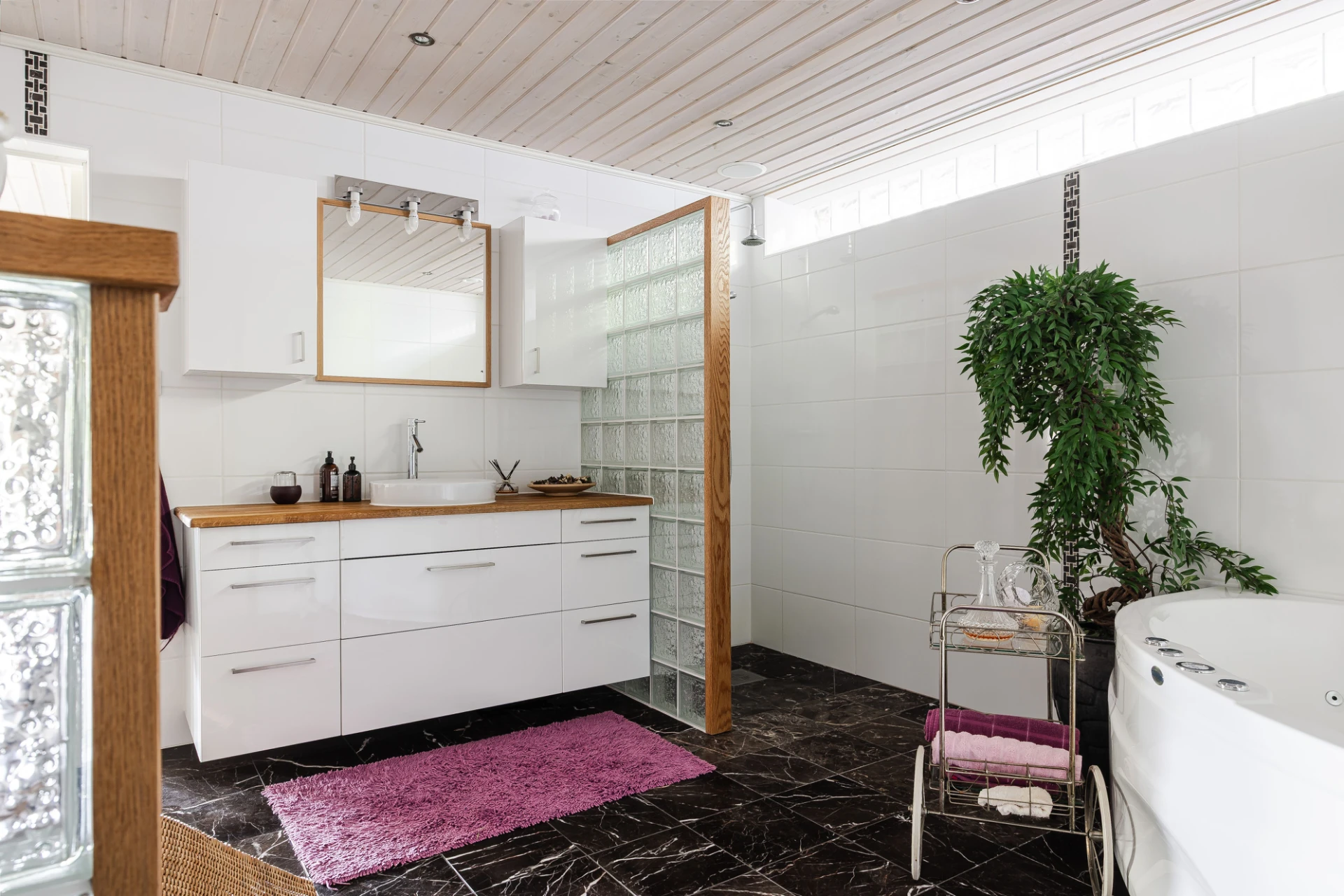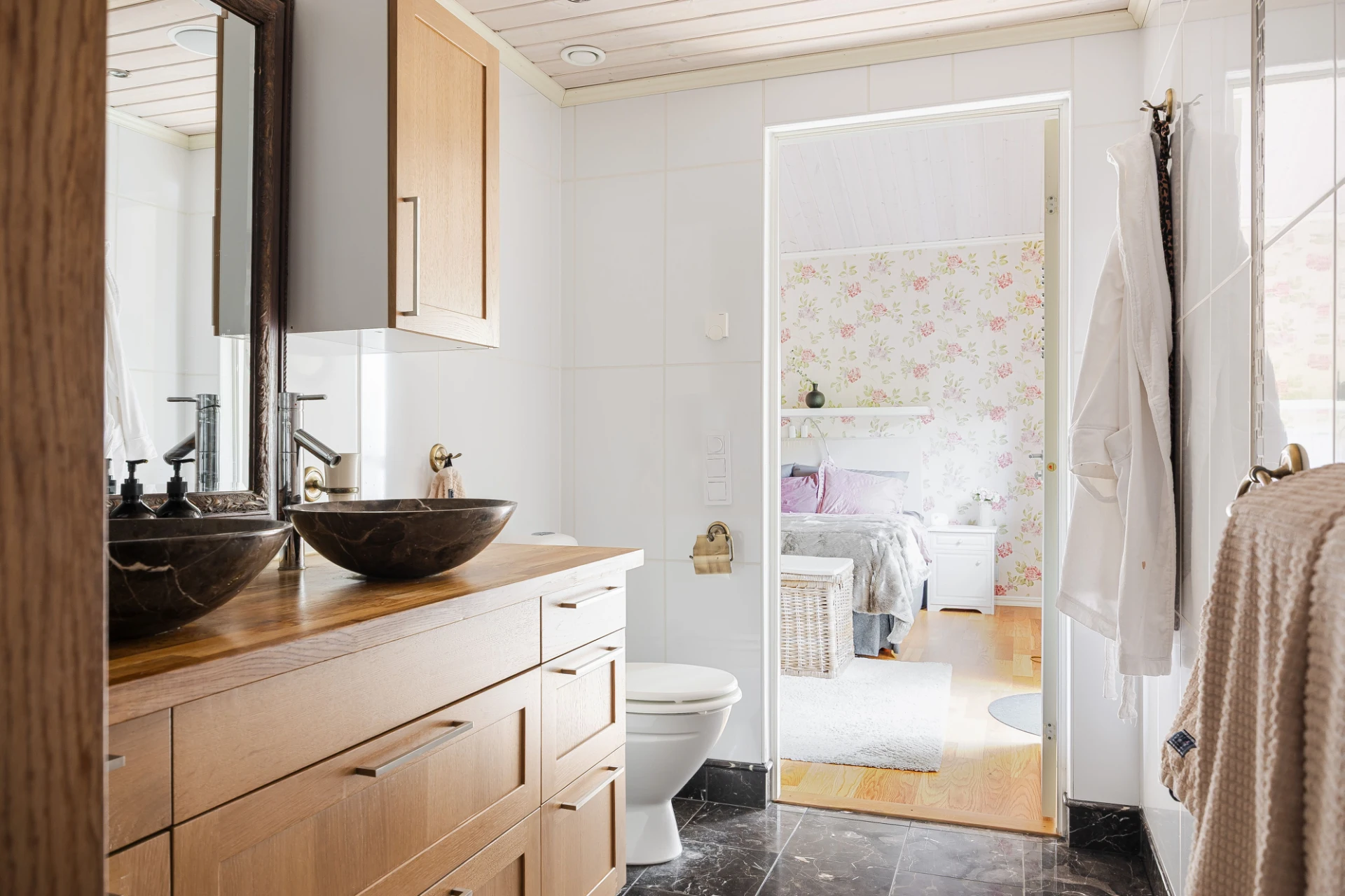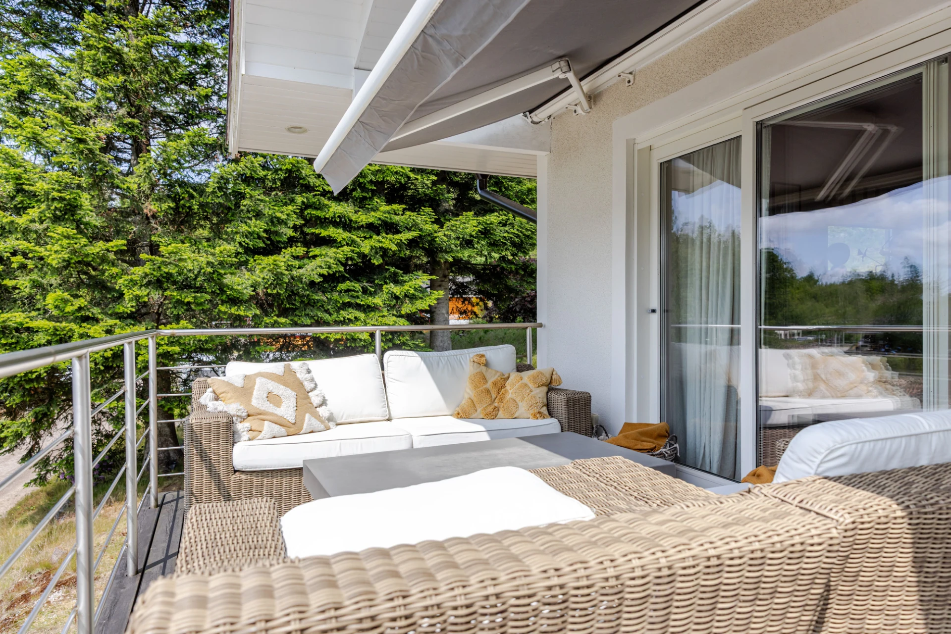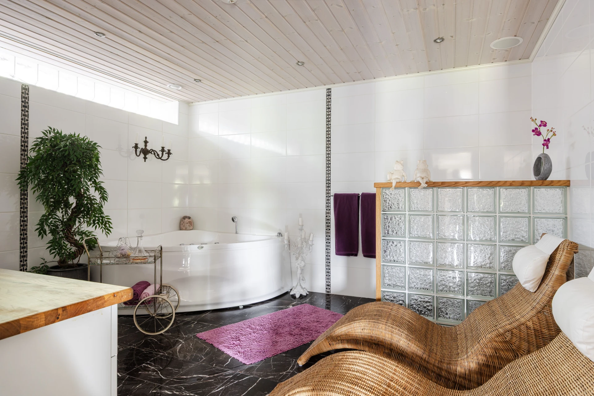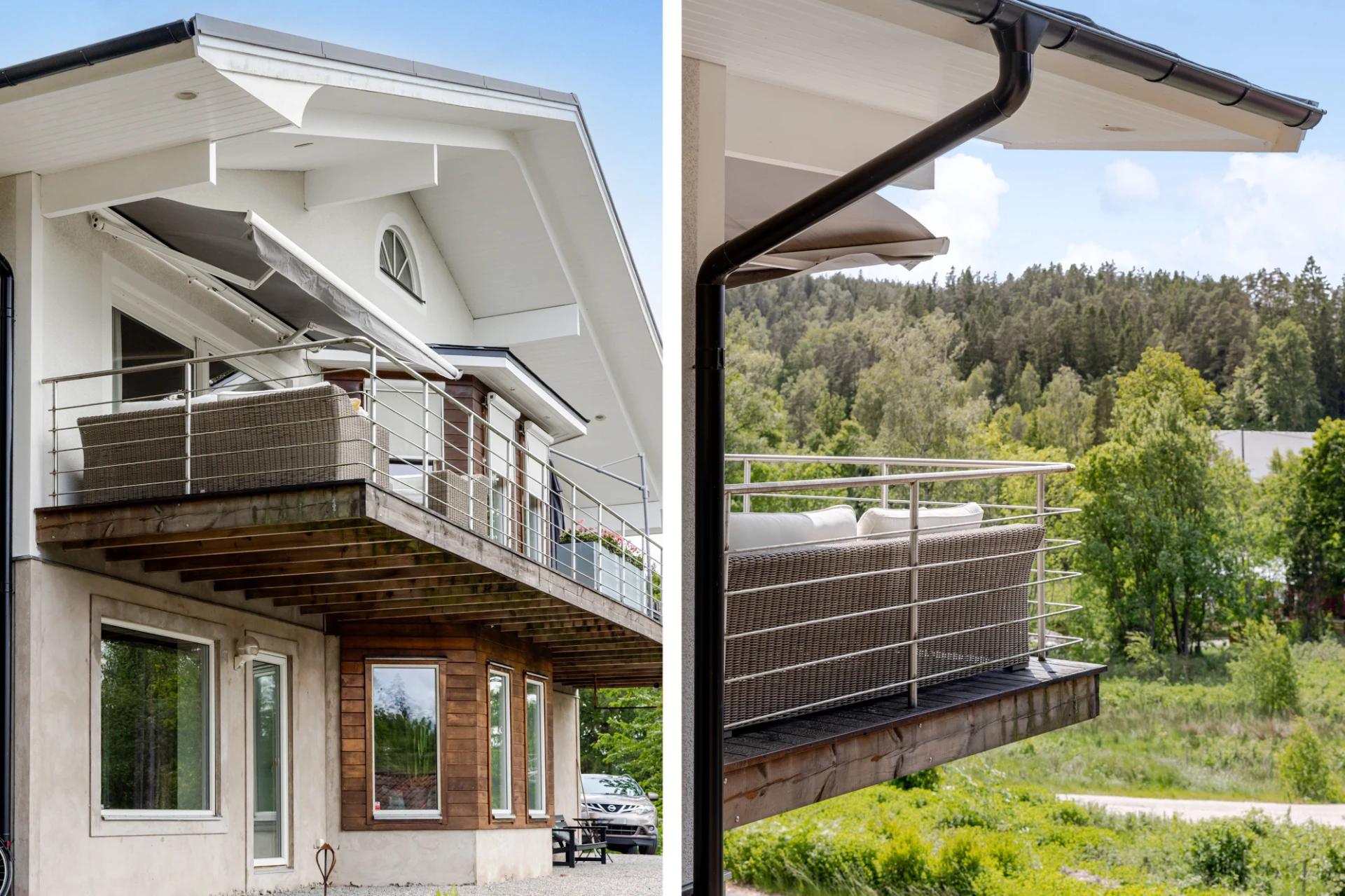 Villan bjuder på högt i tak, stora fönsterpartier och ett fantastiskt ljusinsläpp som skapar en öppen och luftig känsla i hela huset. De stora sällskapsytorna är perfekta för både familjeliv och sociala tillställningar – här finns gott om plats för långa middagar, mysiga filmkvällar och umgänge i stora grupper.