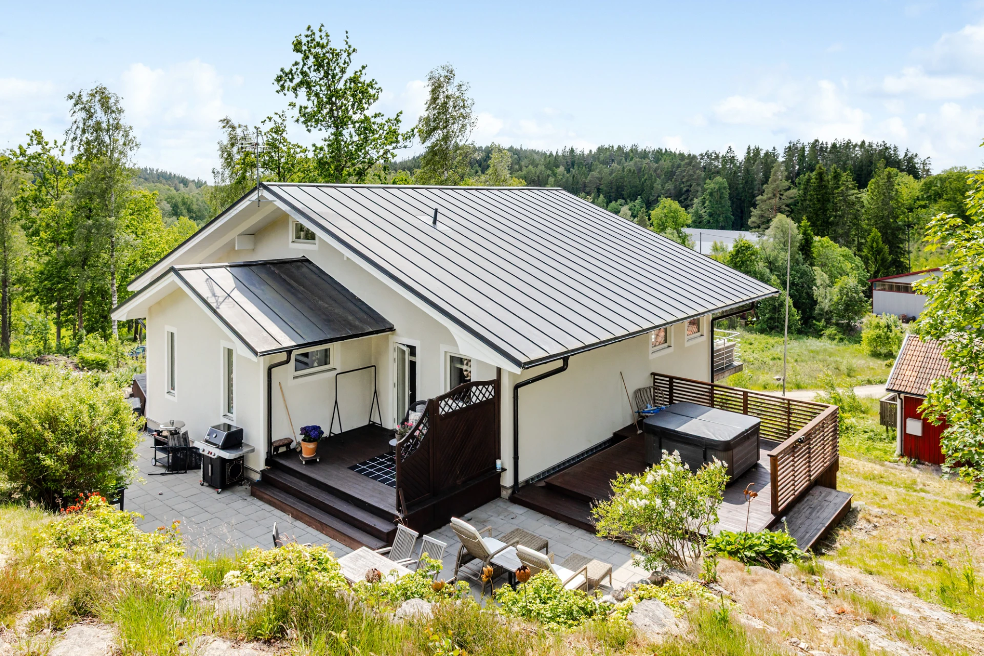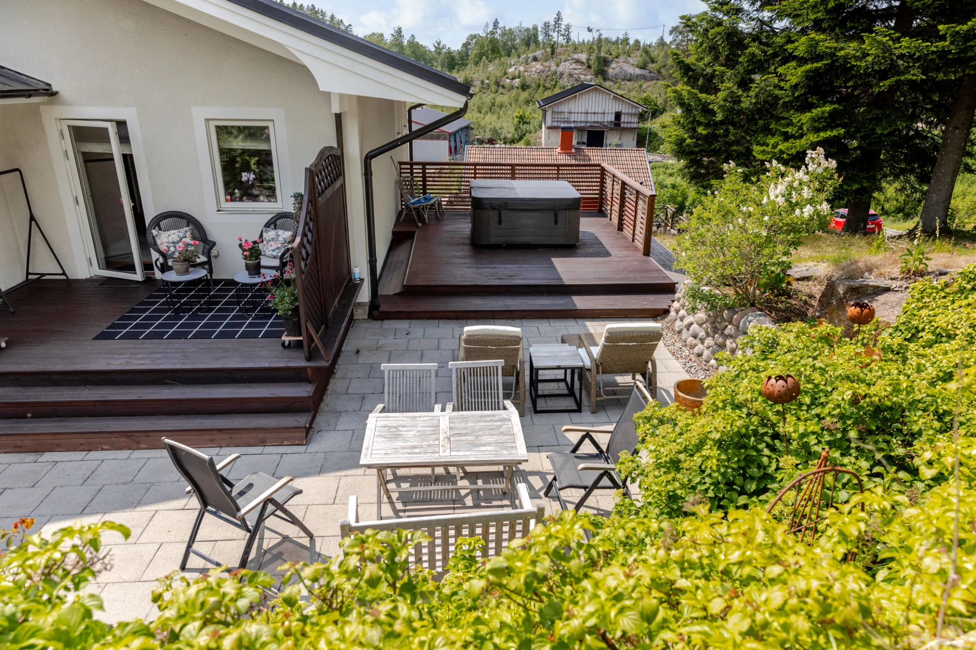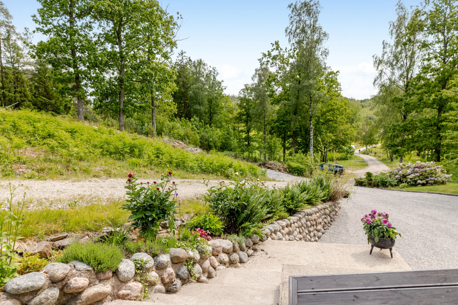 Villan omges av en trivsam naturskön tomt med uteplatser i olika väderstreck – perfekt för sommarens grillkvällar, lek och avkoppling.