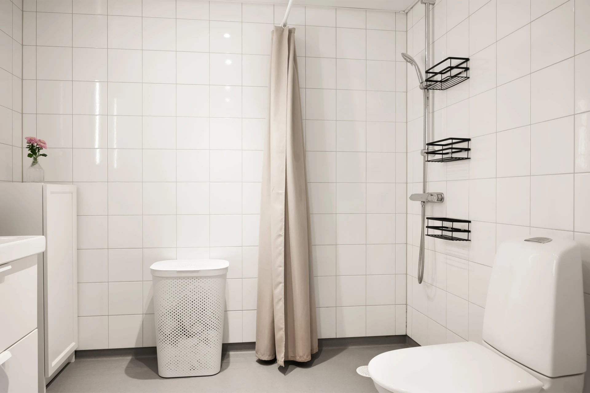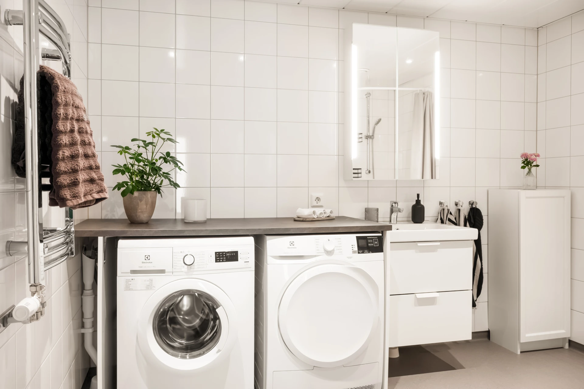 Fräscht och stort badrum med tvättmaskin, torktumlare och förvaring