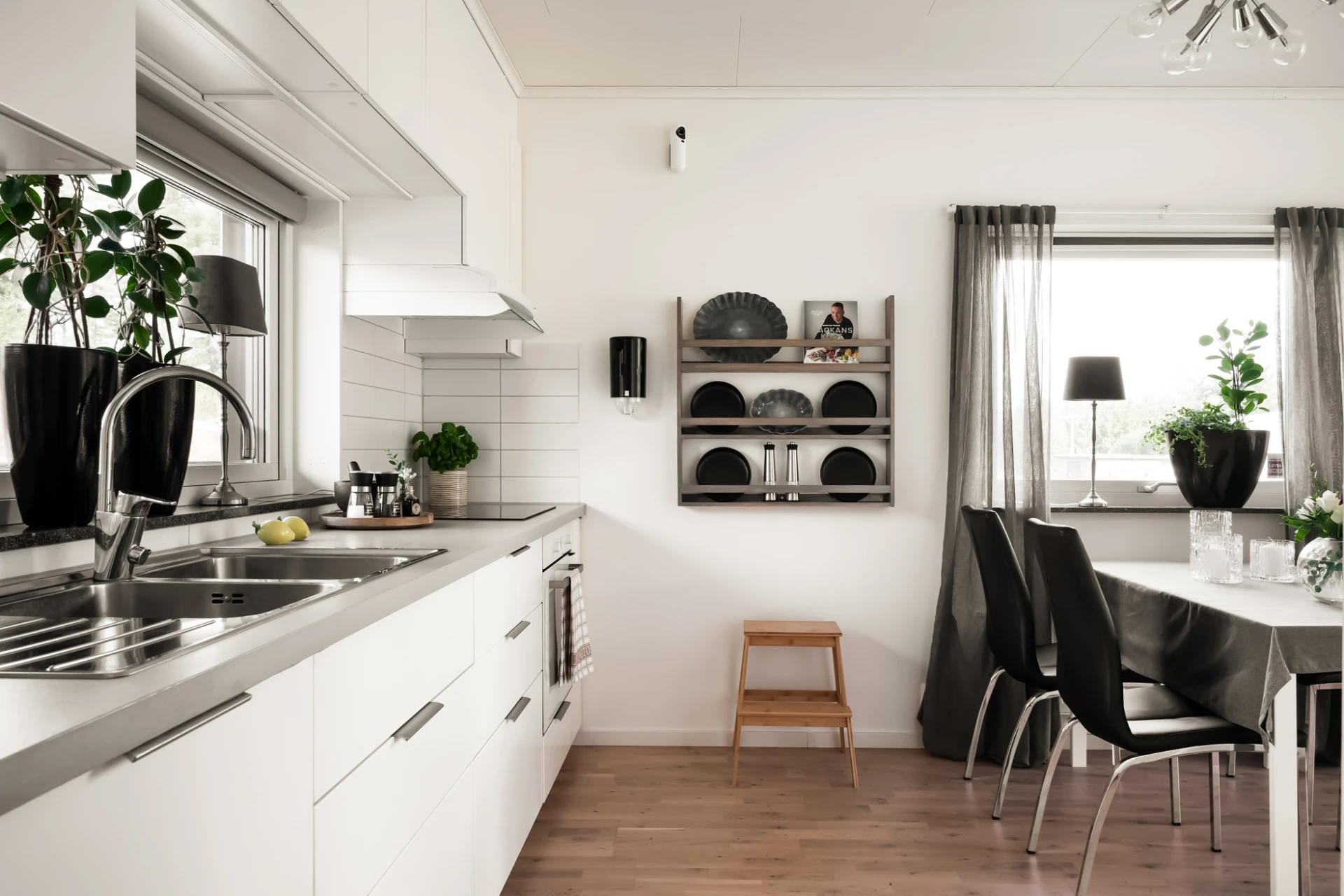 Ljust kök med öppen planlösning mot vardagsrummet – socialt och inbjudande