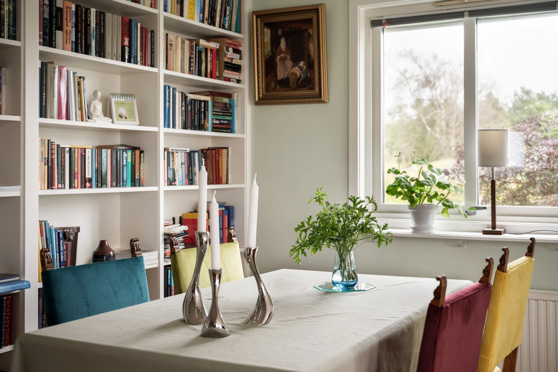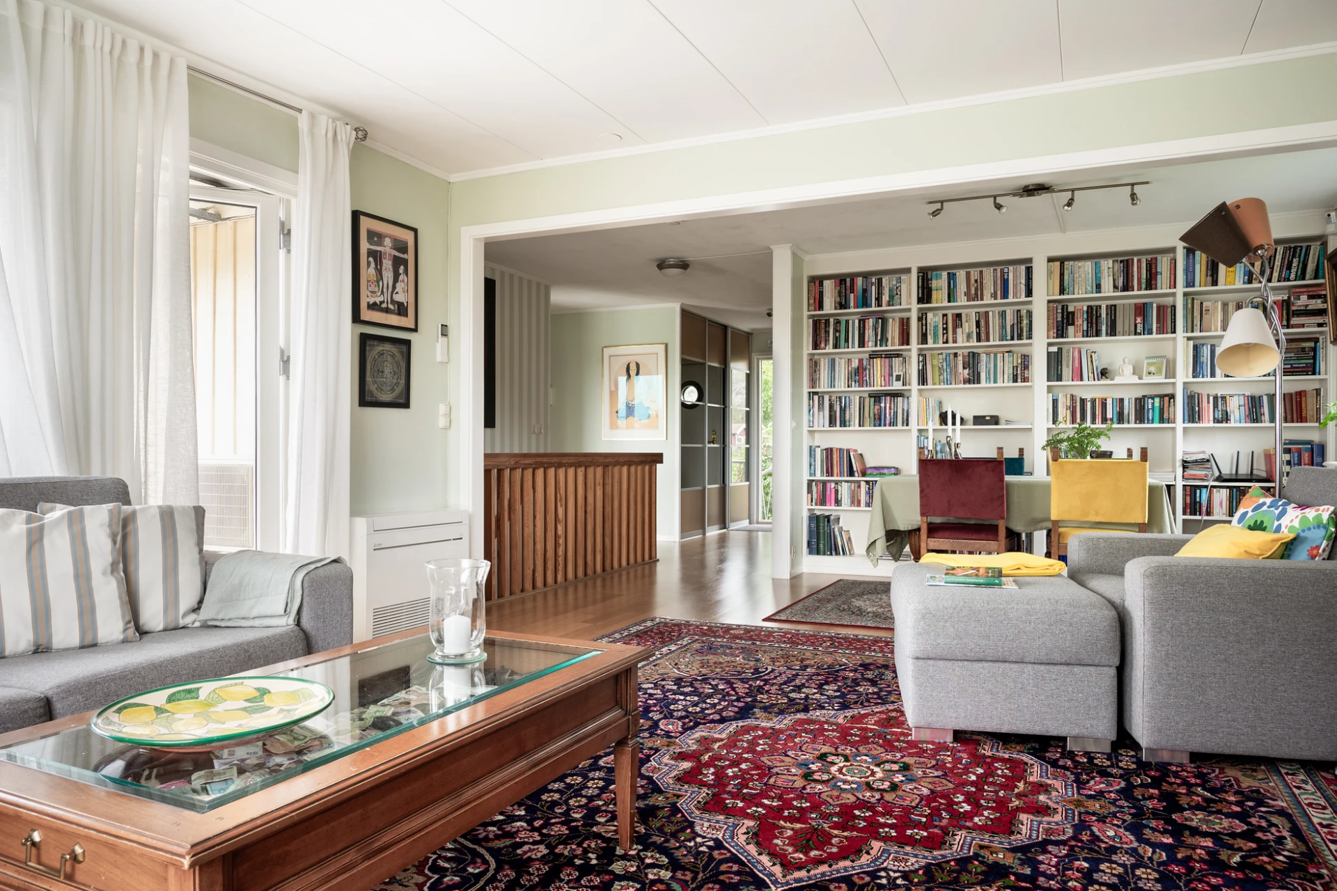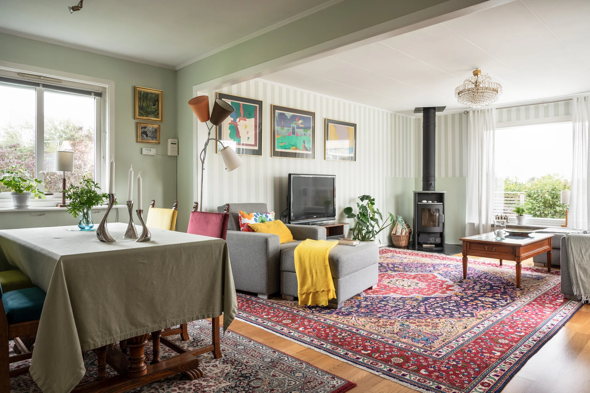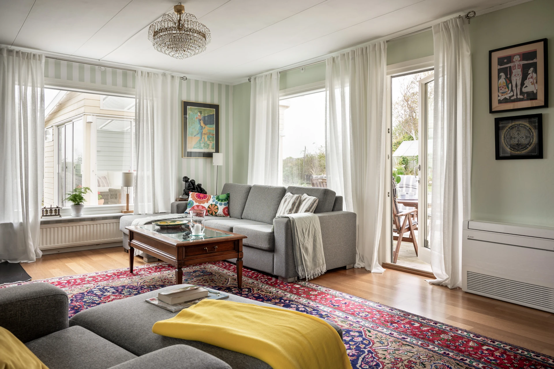 Parkettgolv och tapetserade väggar. Här finns plats för soffa med tillhörande möblemang samt matbord för cirka sex personer. Här finns även en kamin och altandörr med utgång till alten och det inglasade uterummet.
