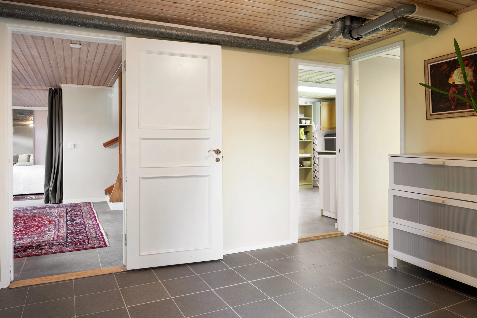 Klinkergolv och ljusa väggar. Här finns plats för avhängning i en klädkammare.