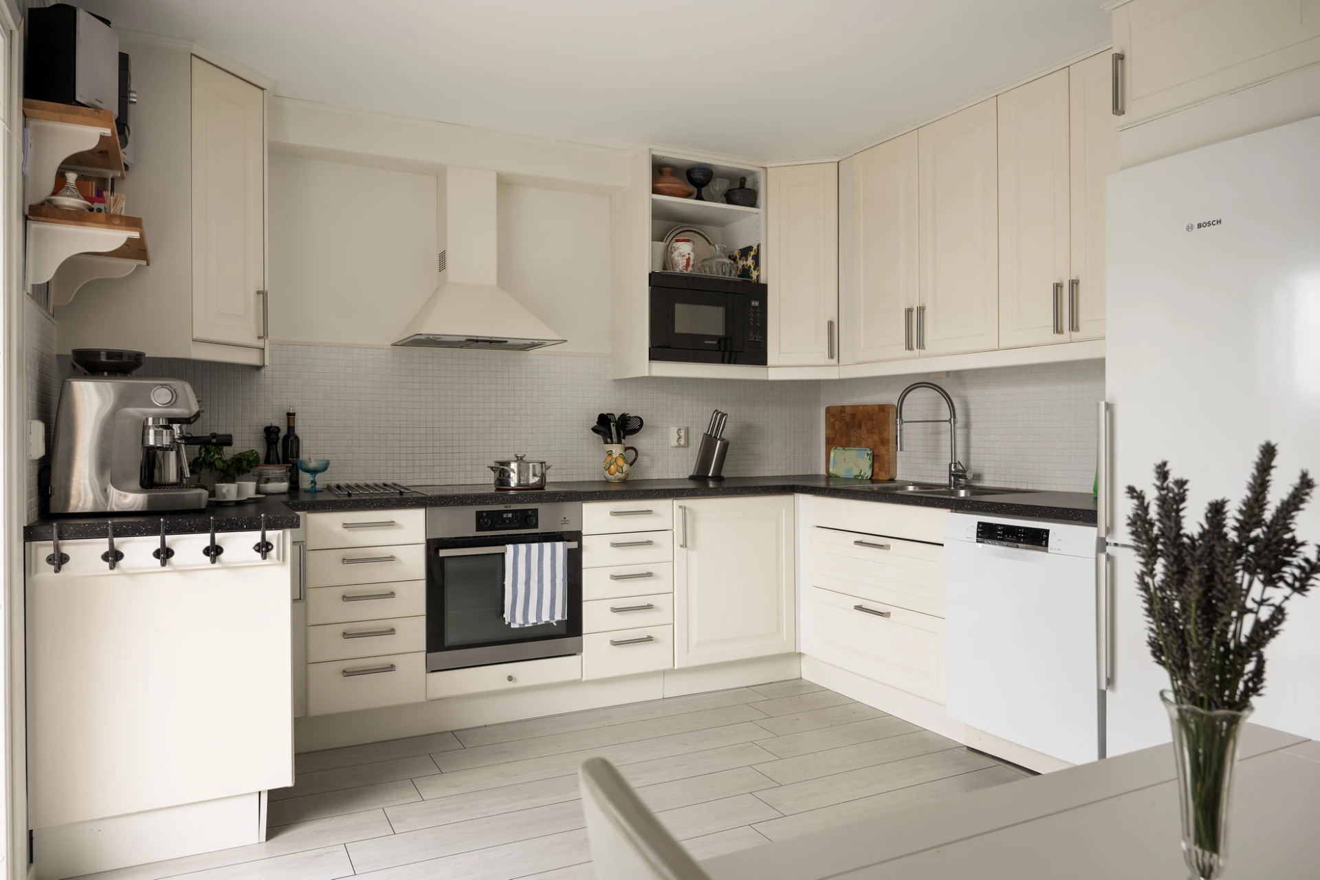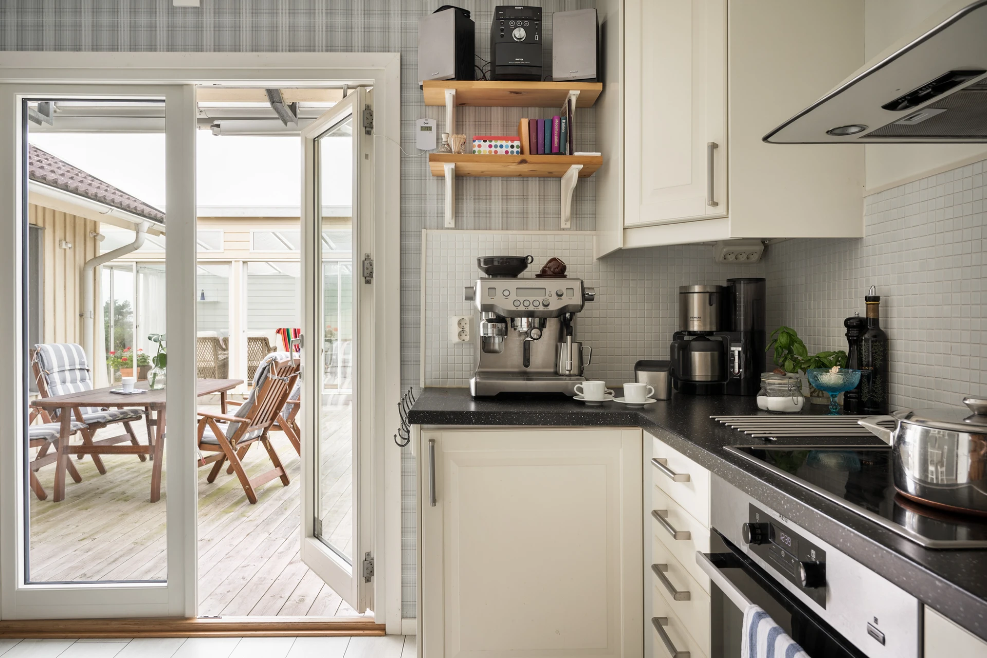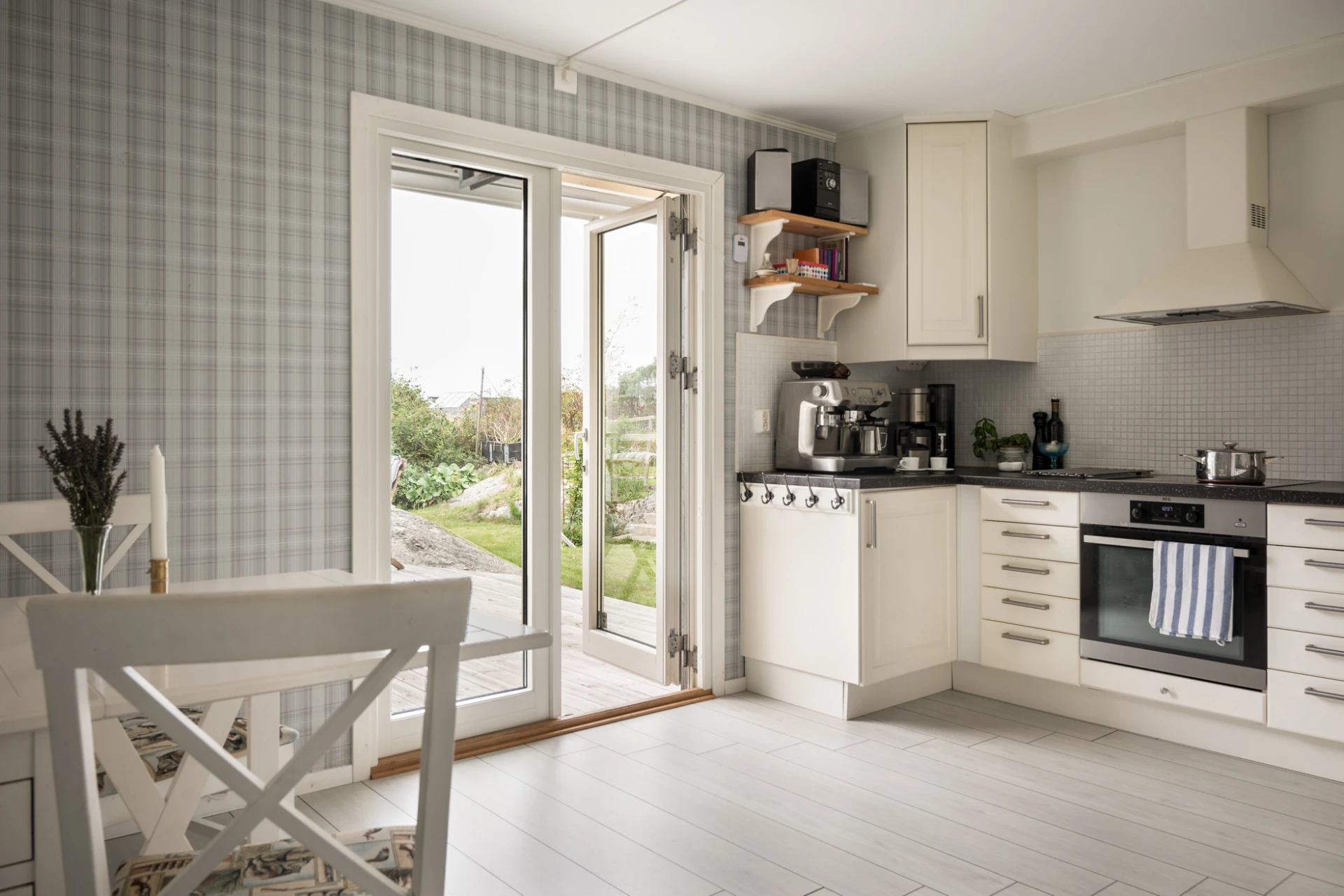 Parkettgolv med golvvärme och ljusa väggar. Köksinredning i vitt och ovanför arbetsbänken i laminat sitter kakel. Köket är utrustat med kombinerad kyl och frys, spis, inbyggd ugn, inbyggd mikro, diskmaskin och ett skafferi. Matplats för cirka fyra personer. Härifrån nås bostadens altan som leder ut till både trädgården och det inglasade uterummet.