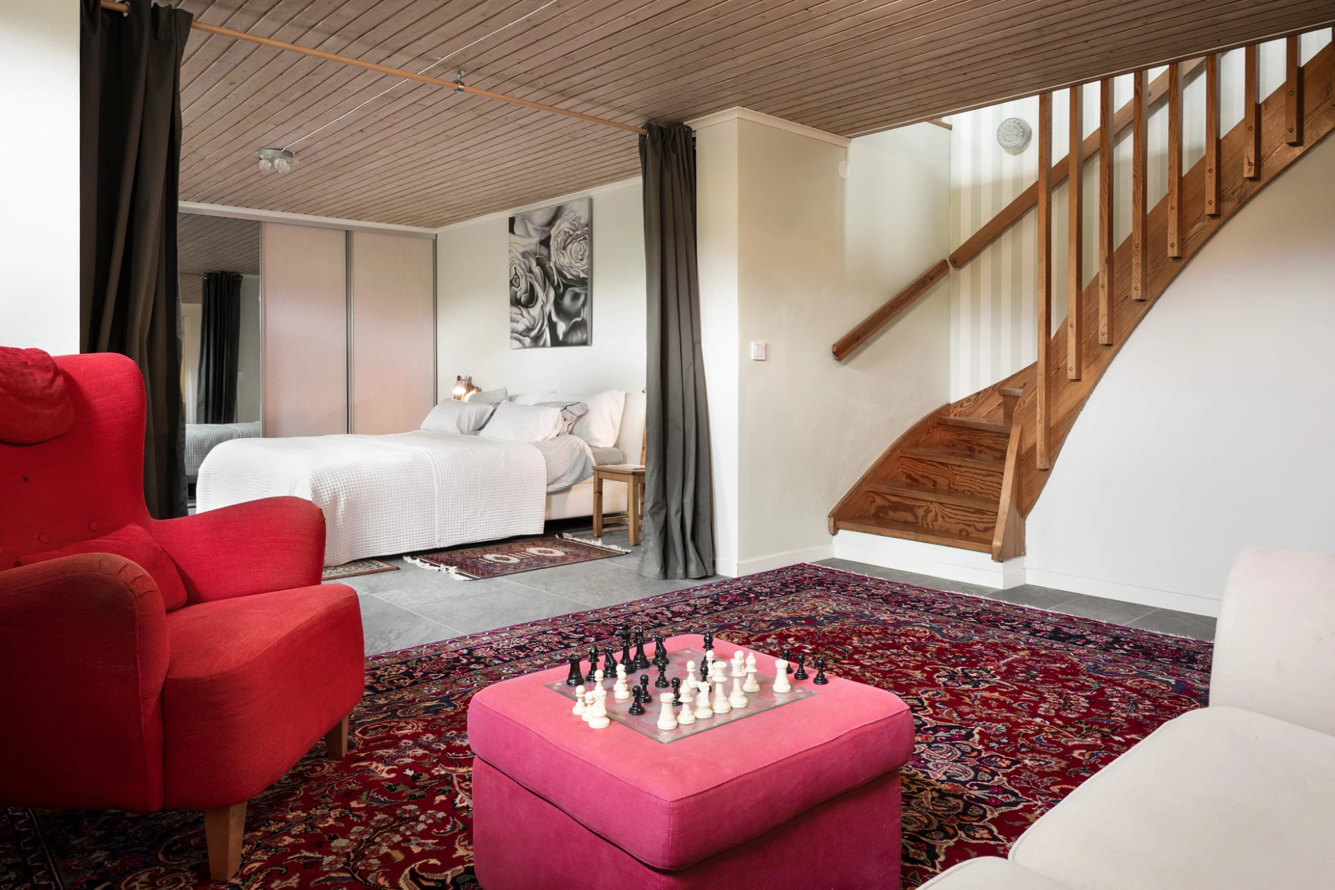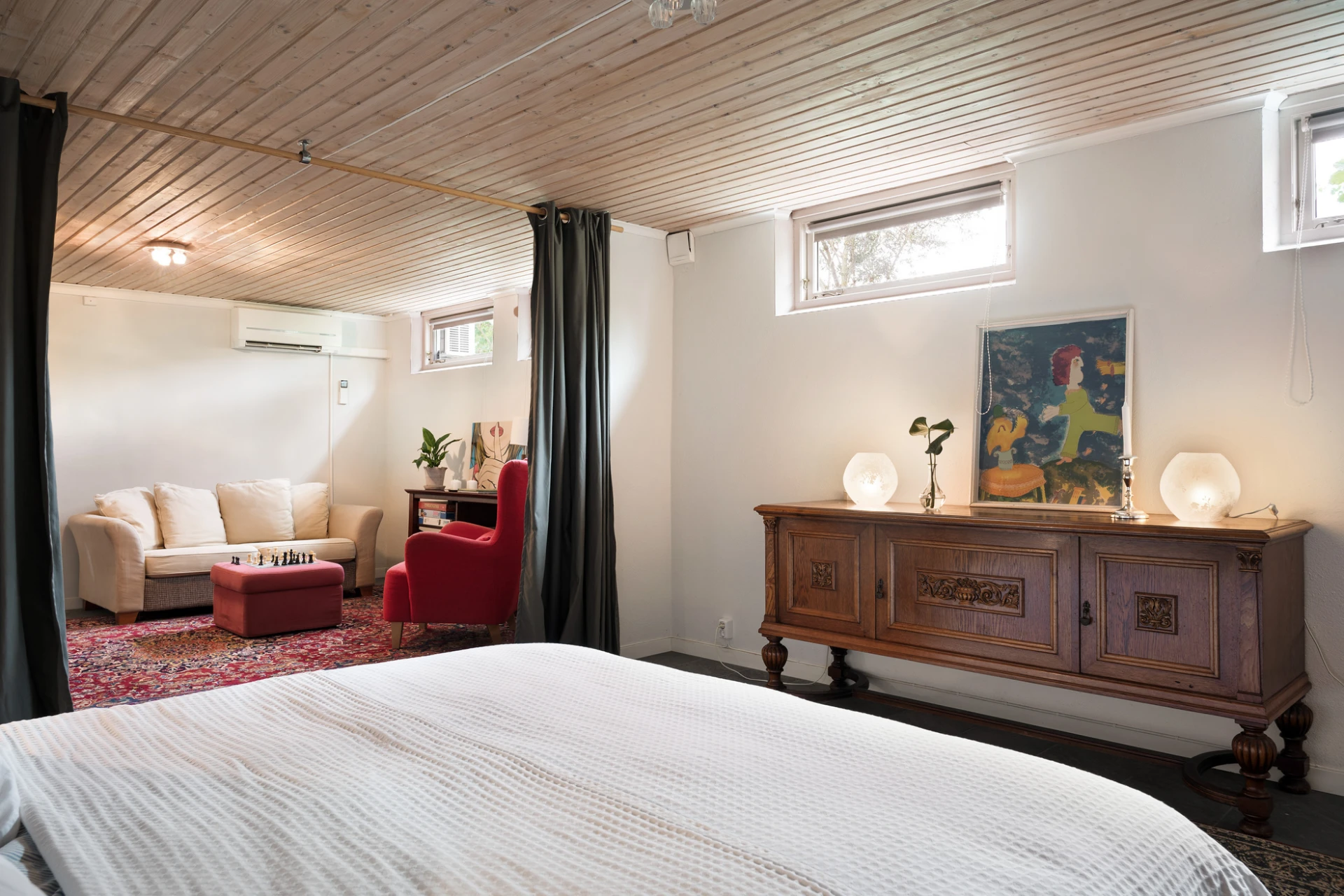 Klinkergolv med el golvvärme och tapetserade väggar. Här finns plats för soffa och dubbelsäng med tillhörande möblemang. Förvaring sker i en stor skjutdörrsgarderob.