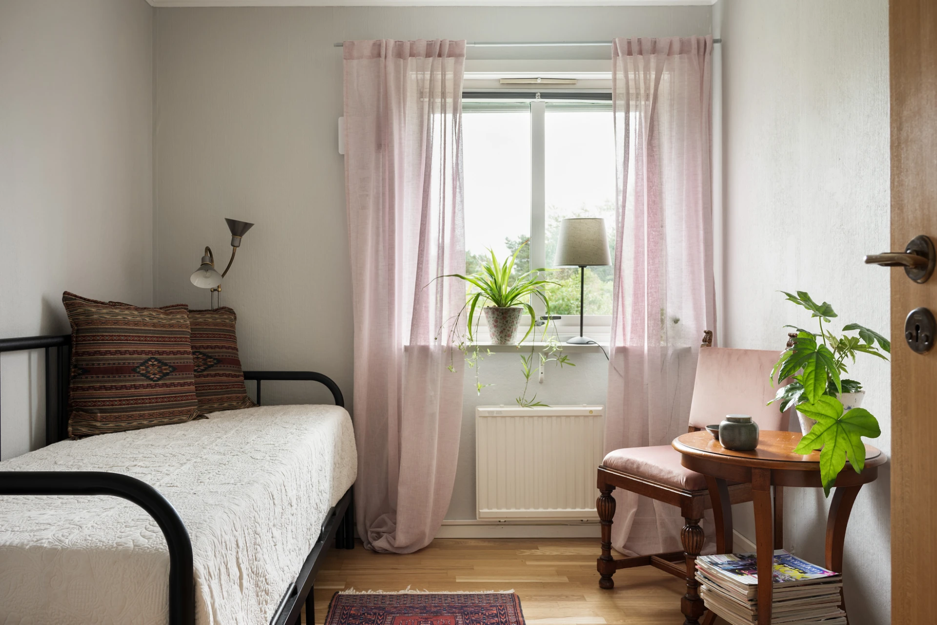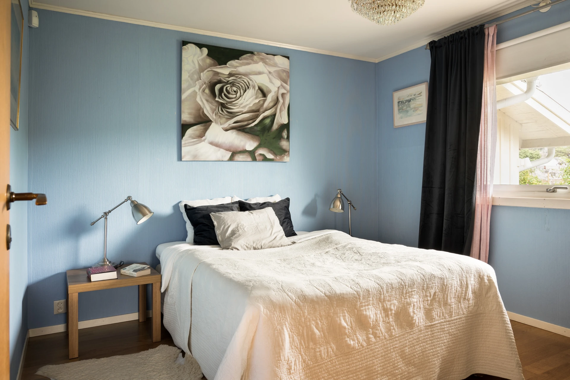 Parkettgolv och tapetserade väggar. Här finns plats för dubbelsäng med tillhörande möblemang. Förvaring sker i garderober.