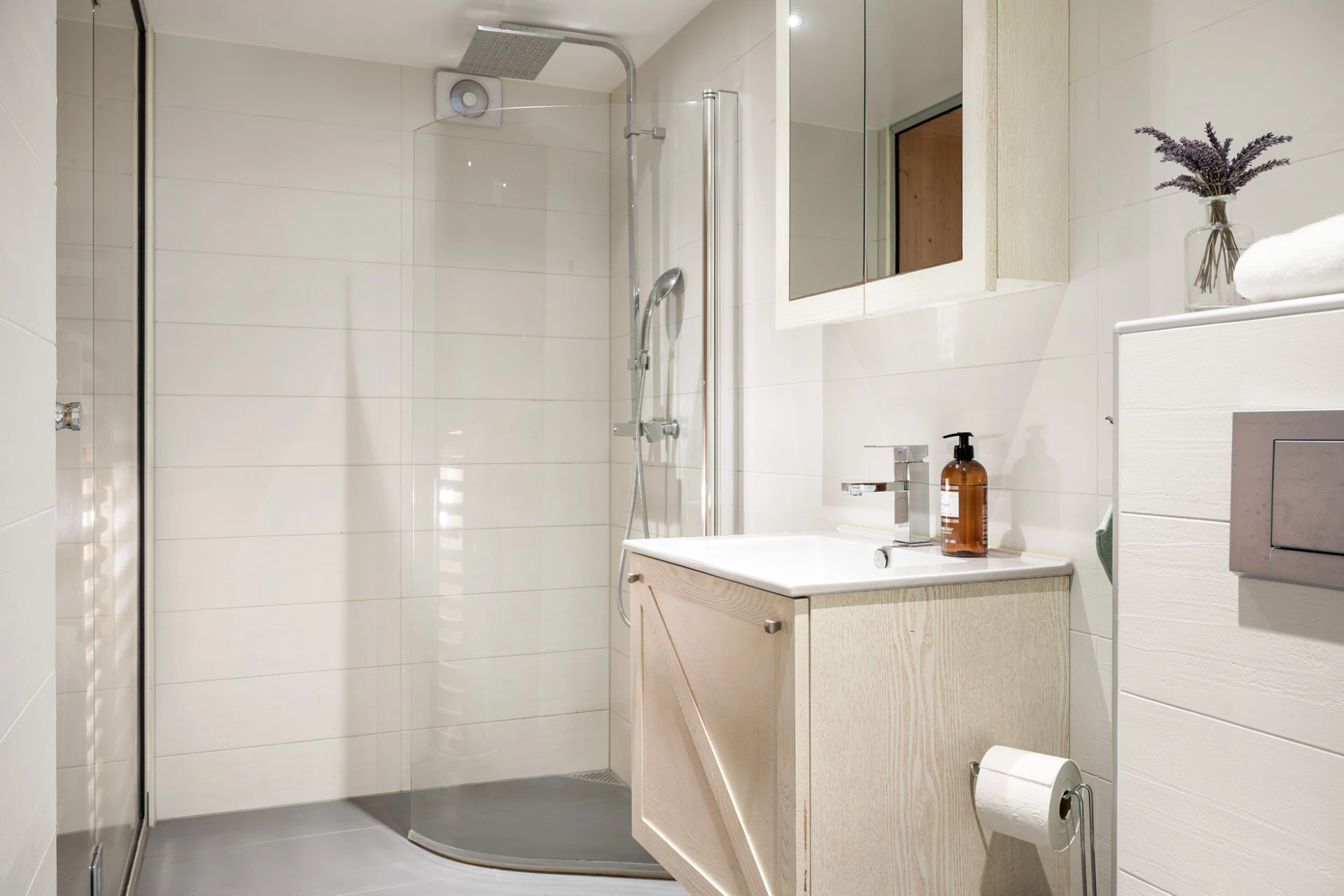 Klinkergolv med golvvärme (EL) och kaklade väggar i vitt. Badrummet är utrustat med vägghängd WC, handfat med kommod, dusch och bastu.