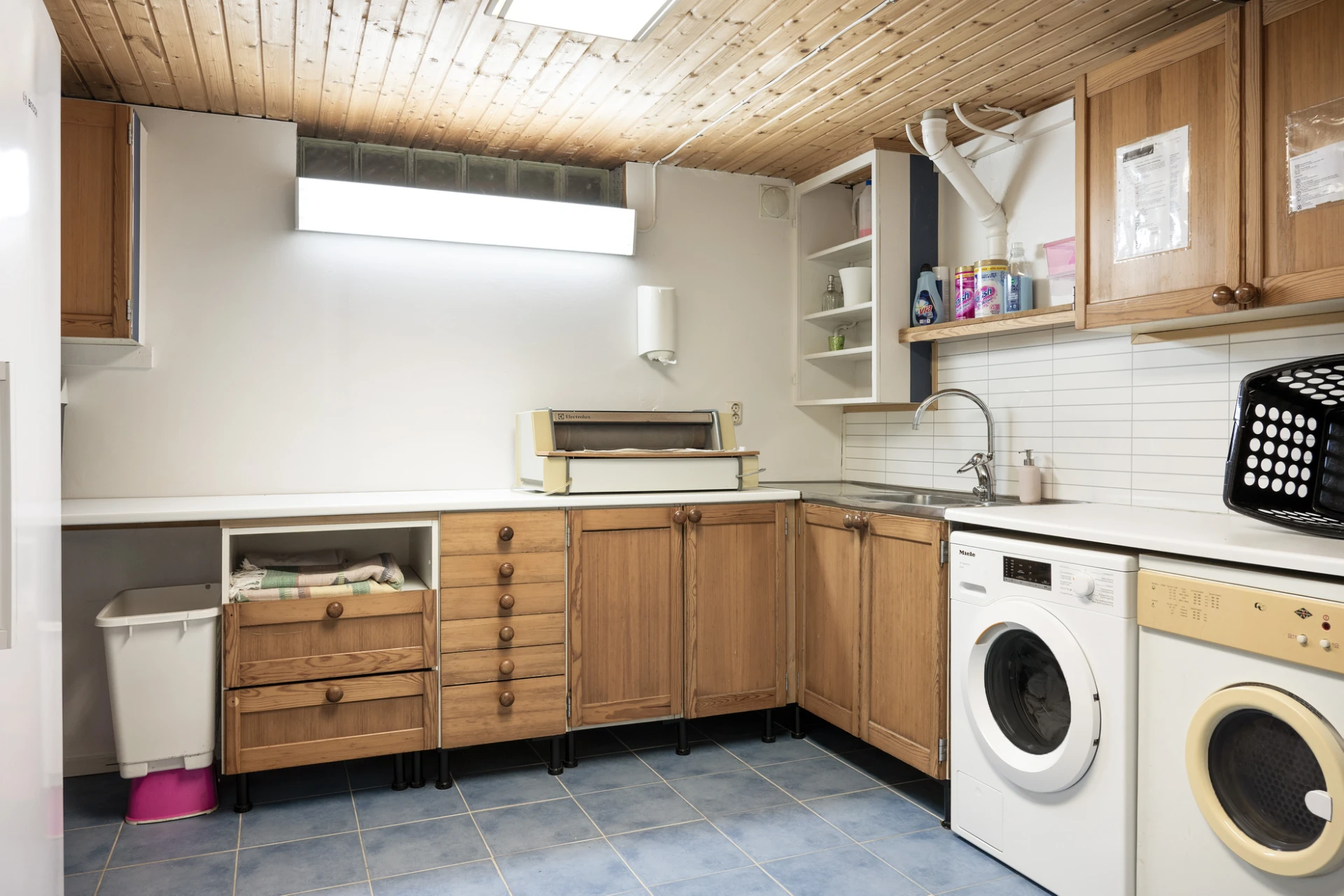 Klinkergolv och ljusa väggar. Tvättstugan är utrustad med diskho, tvättmaskin, torktumlare, tvättlina, förvaringsskåp samt arbetsbänk.