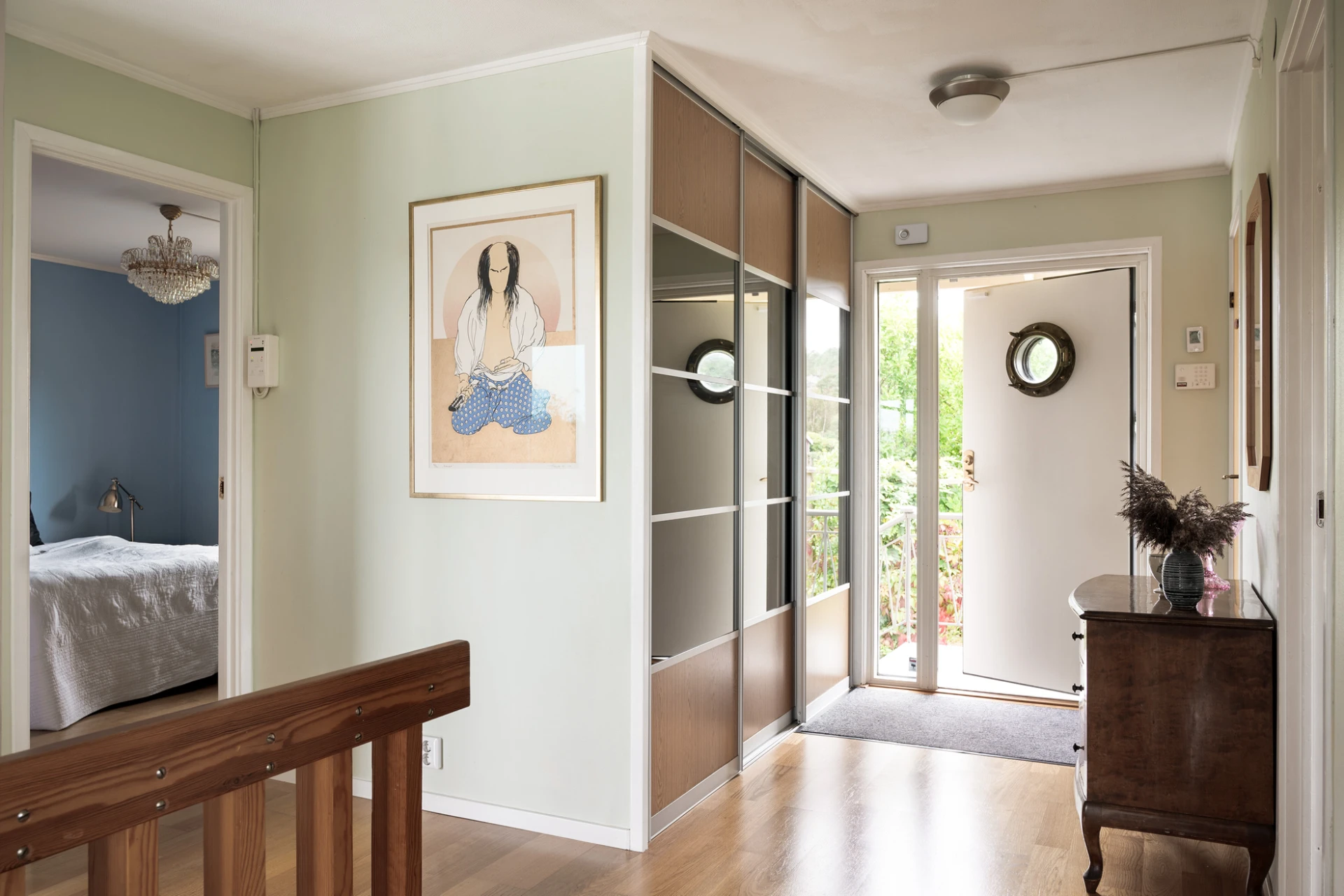 Parkettgolv och ljusa väggar. Här finns plats för avhängning och förvaring sker i en stor skjutdörrsgarderob.