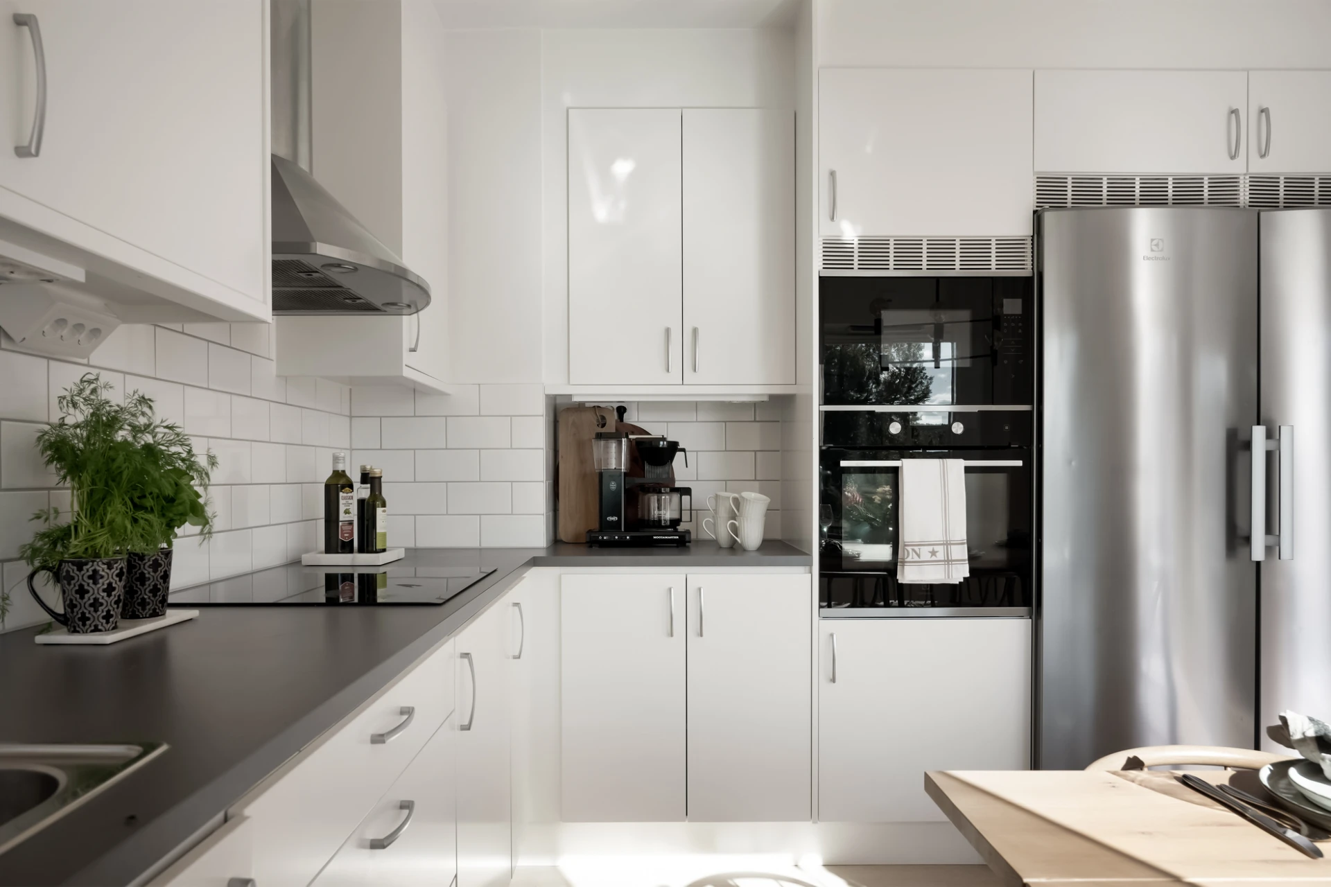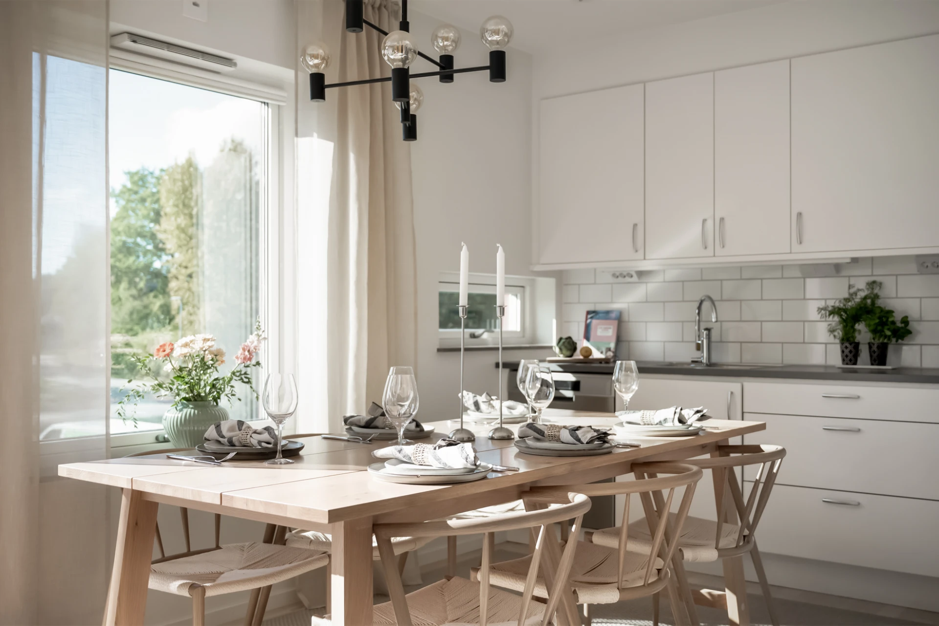 Vidare öppnar hemmet upp sig mot kök och vardagsrum i en härlig öppen planlösning. Här skapar ljusinsläppet från flera fönster en luftig känsla, och de neutrala färgerna gör det enkelt att sätta sin egen prägel. Köket är modernt och välplanerat med gott om arbetsytor, vit inredning och stilrena detaljer. Intill finns plats för ett stort matbord, perfekt för middagar med familj och vänner. Vardagsrummet erbjuder gott om plats för en bekväm soffgrupp och har direkt utgång till den stora balkongen – en given plats för lata sommardagar, frukost i solen eller härliga kvällar med utsikt över grönskan.