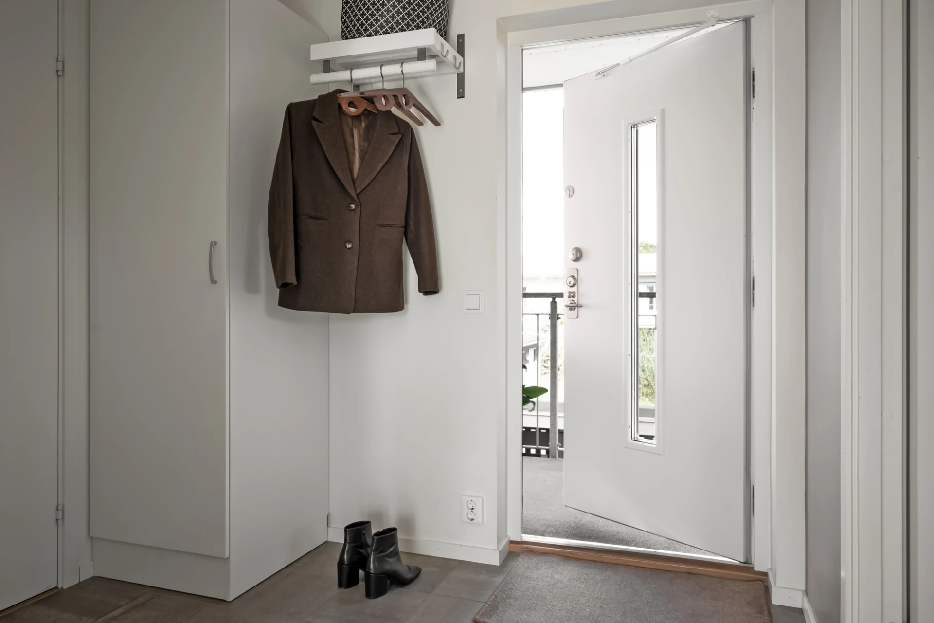 Redan i hallen möts du av ett välkomnande intryck med gott om förvaring i garderober. Direkt till höger ligger det helkaklade badrummet, smakfullt inrett med ljusa ytskikt, dusch, wc och tvättmaskin. På andra sidan hallen finner du det rofyllda sovrummet med plats för dubbelsäng och bra garderobslösningar som ger ordning och harmoni.