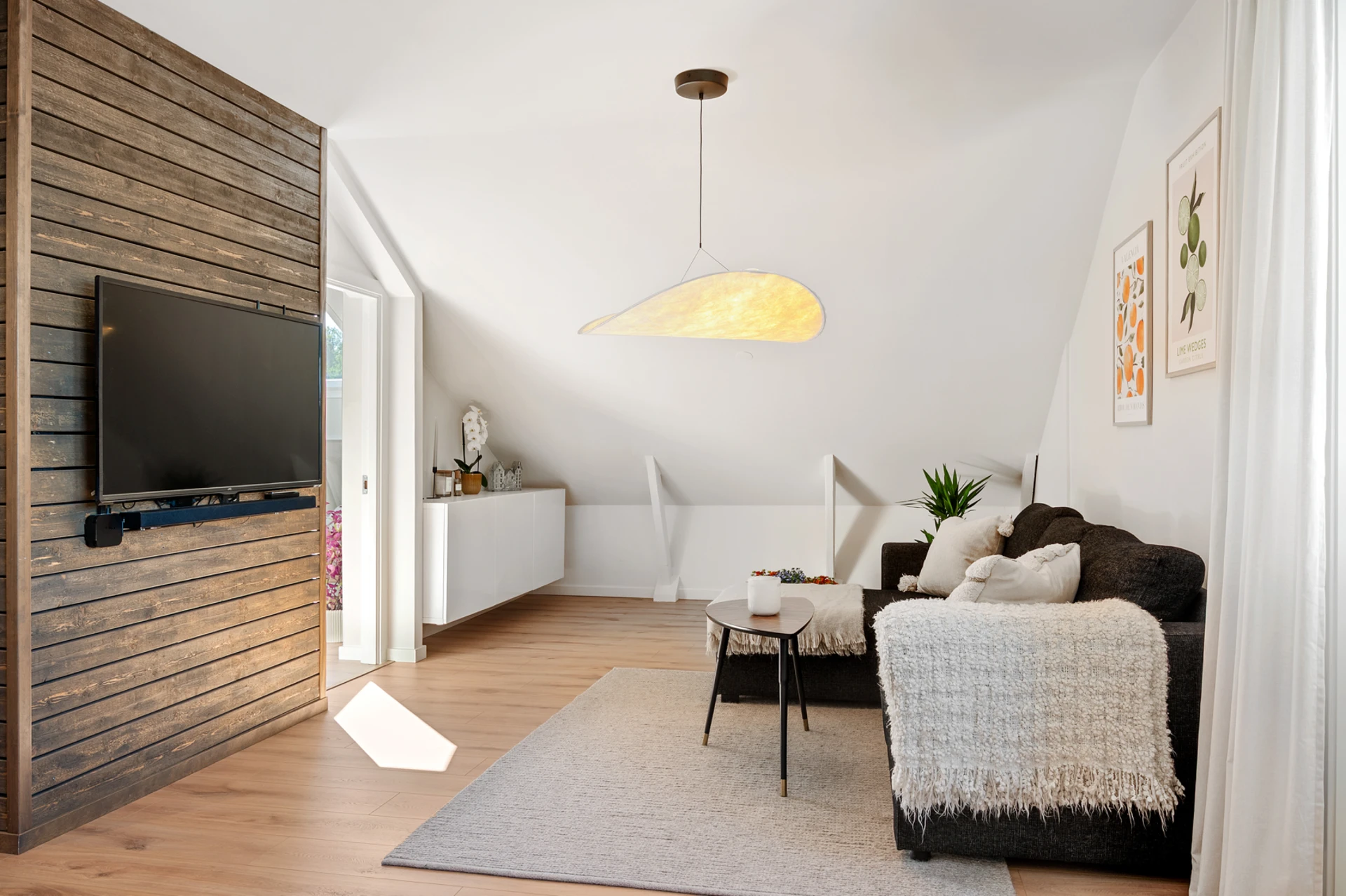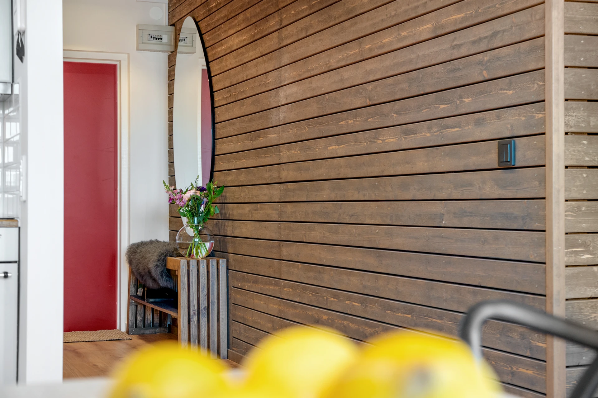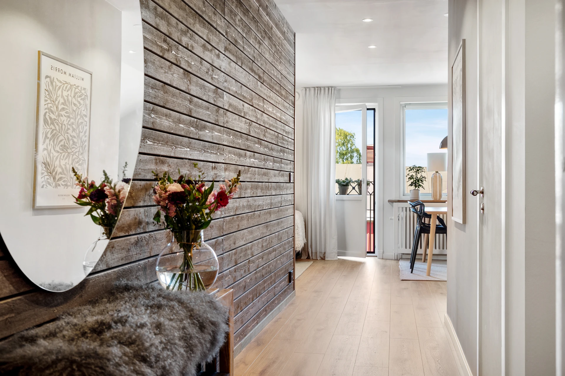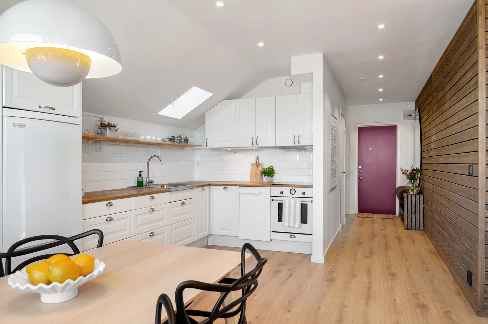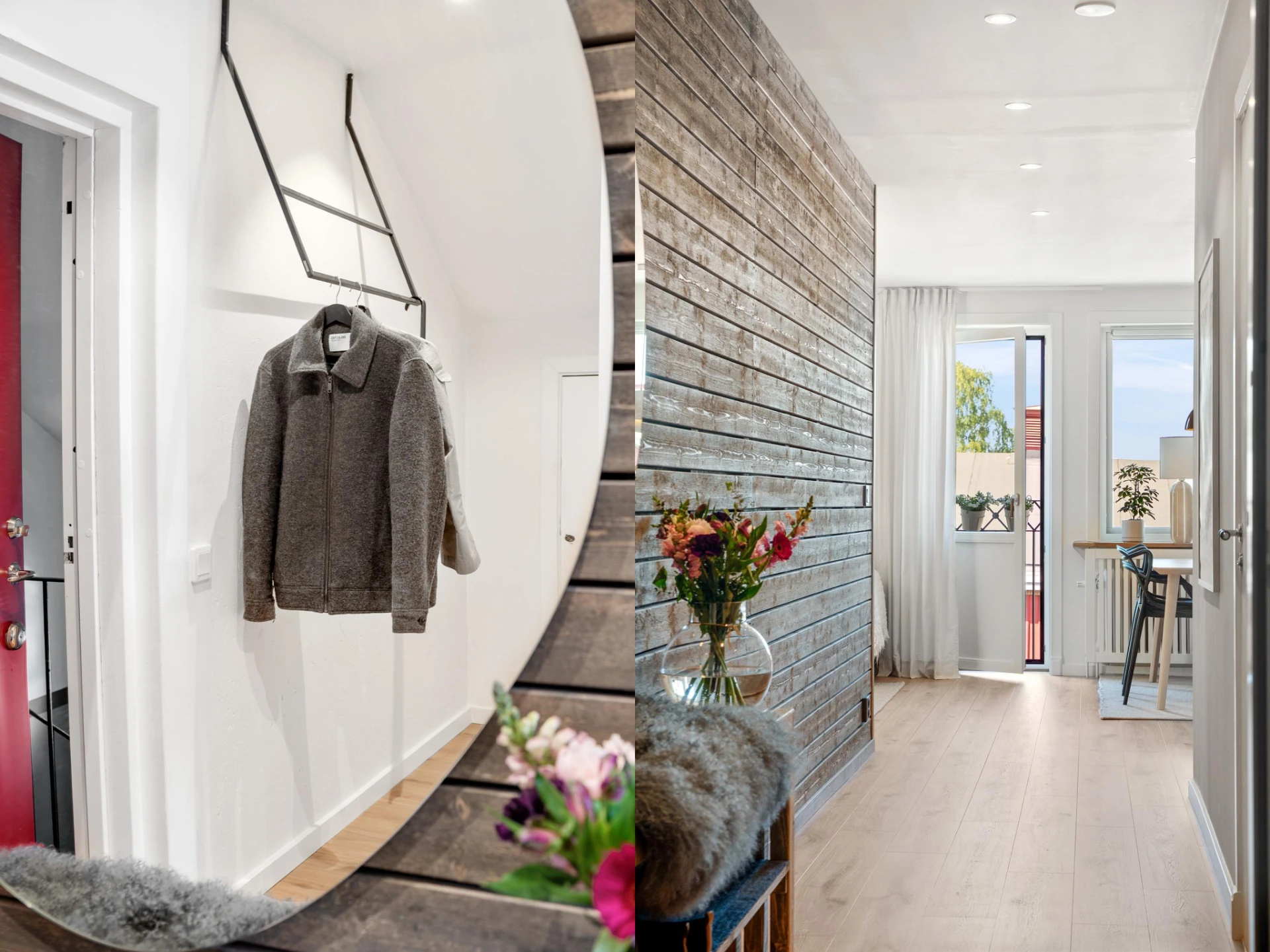 När du stiger in i hallen möts du av en vacker träpanel som löper längs väggen som leder dig in till kök och vardagsrum.