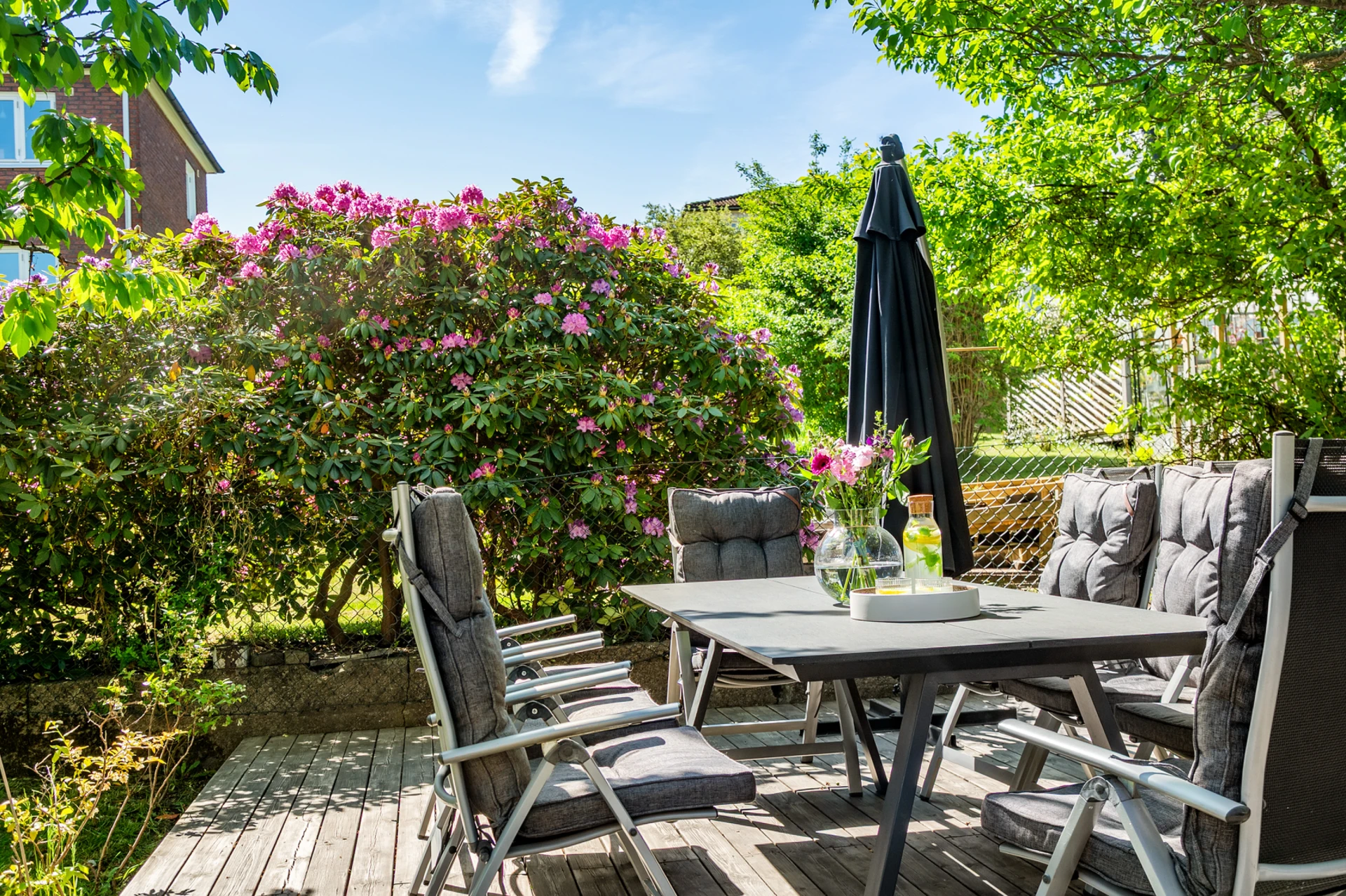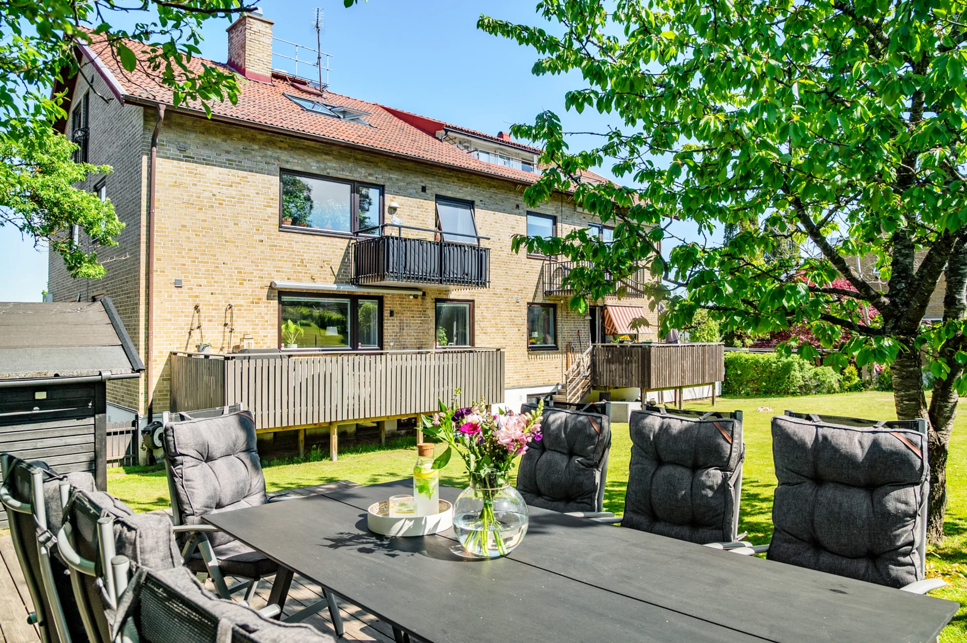 Gemensam trädgård med utemöbler.