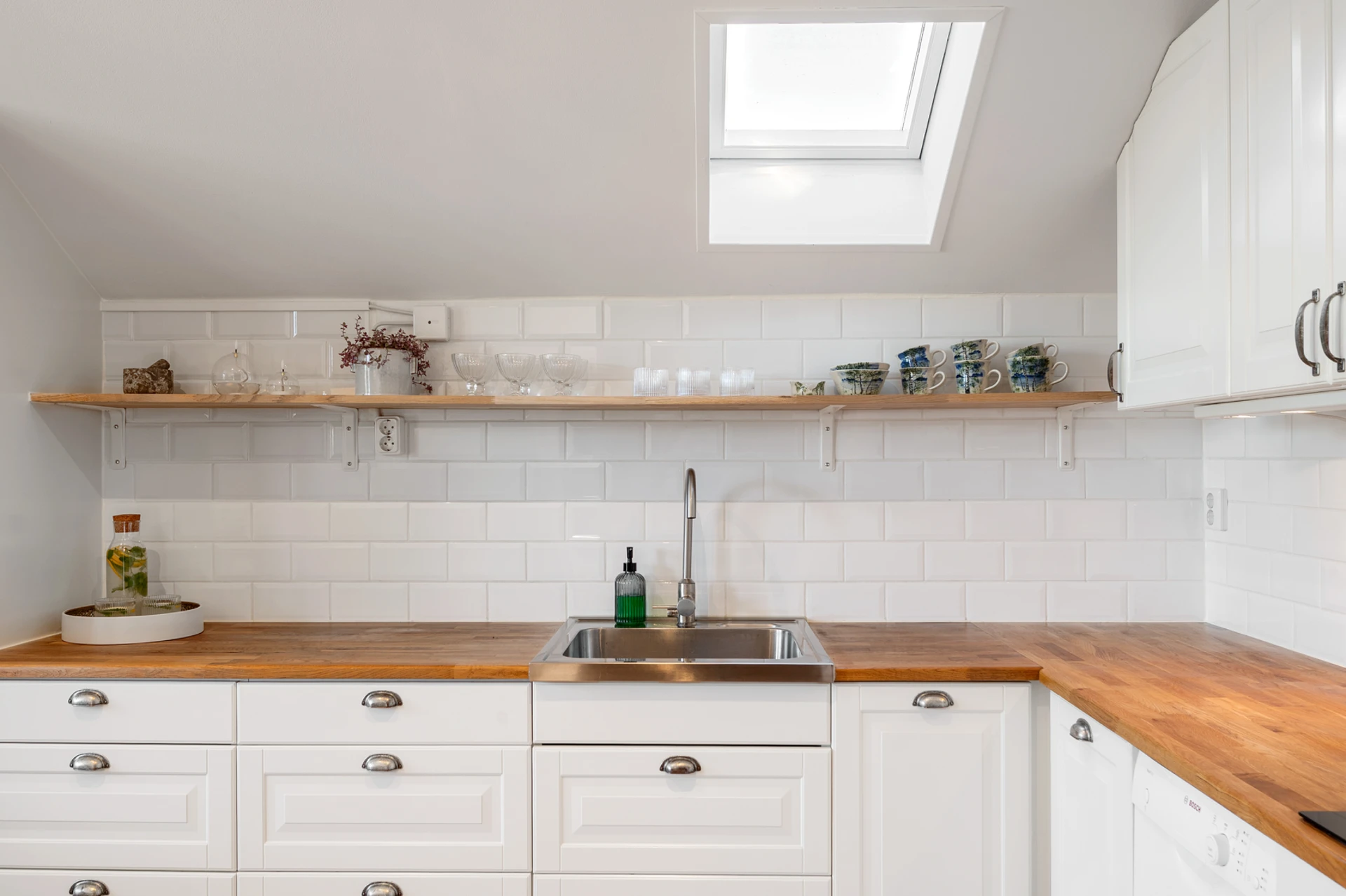 I köket finner du snygga och smart placerade spotlights som ger dig ljus där du behöver och vill ha det.